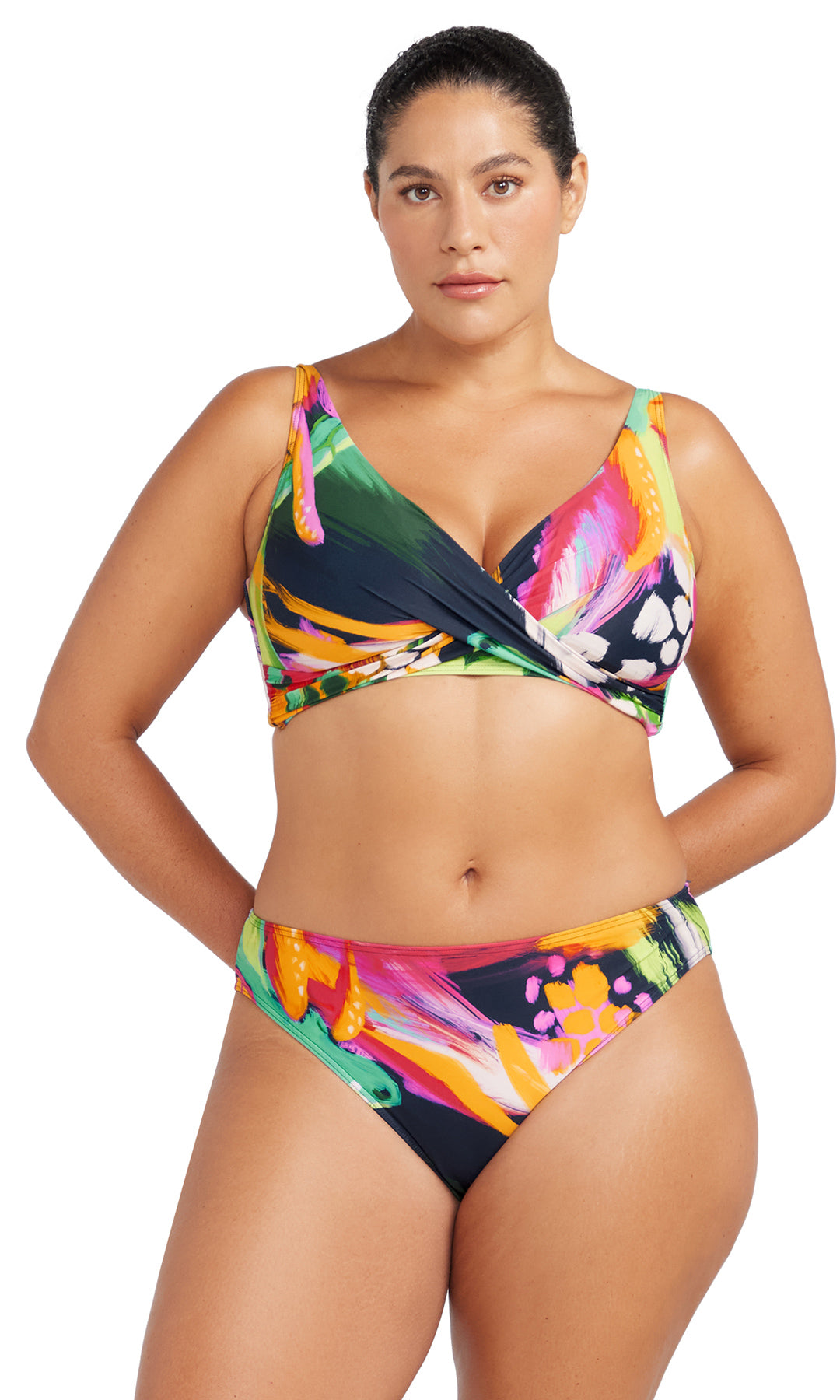 Artesands Fits Your Curves. Our Delacroix bikini top is our wire free comfort and support style. Every women needs a swimsuit that makes you feel good when you put it on and this is our curve fit and plus size shape Delacroix. This style has a cross front design with multifit cup support that fits a D cup , DD cup, E cup, F cup and a G cup.