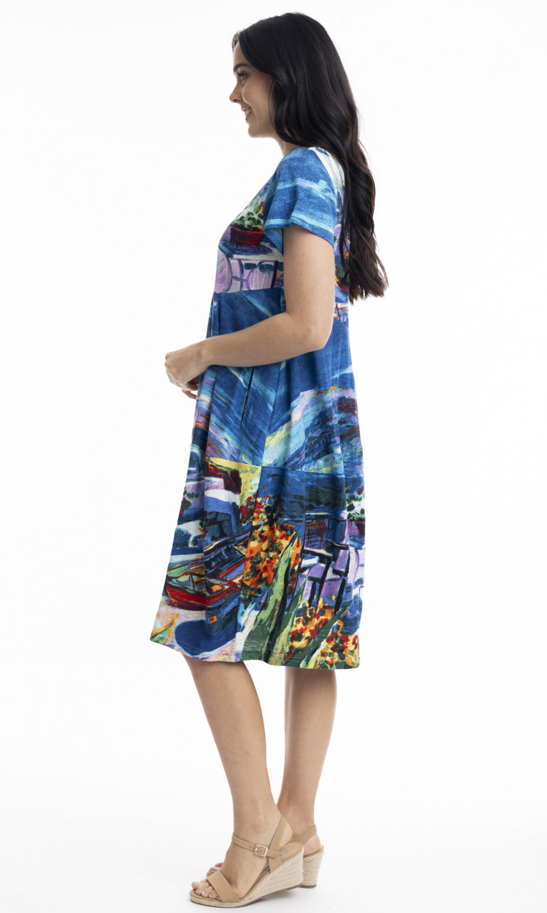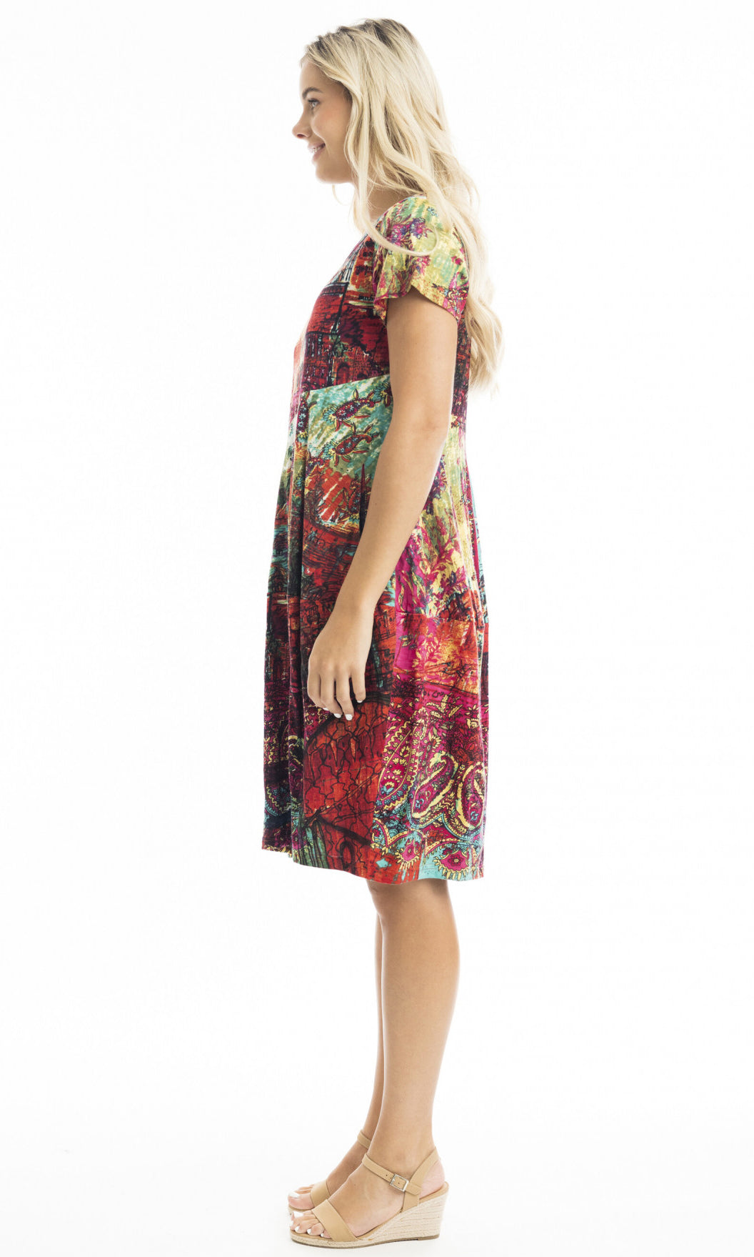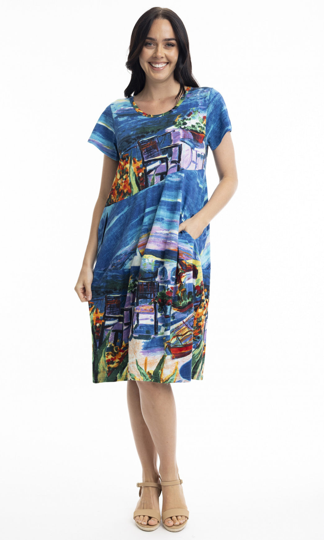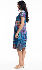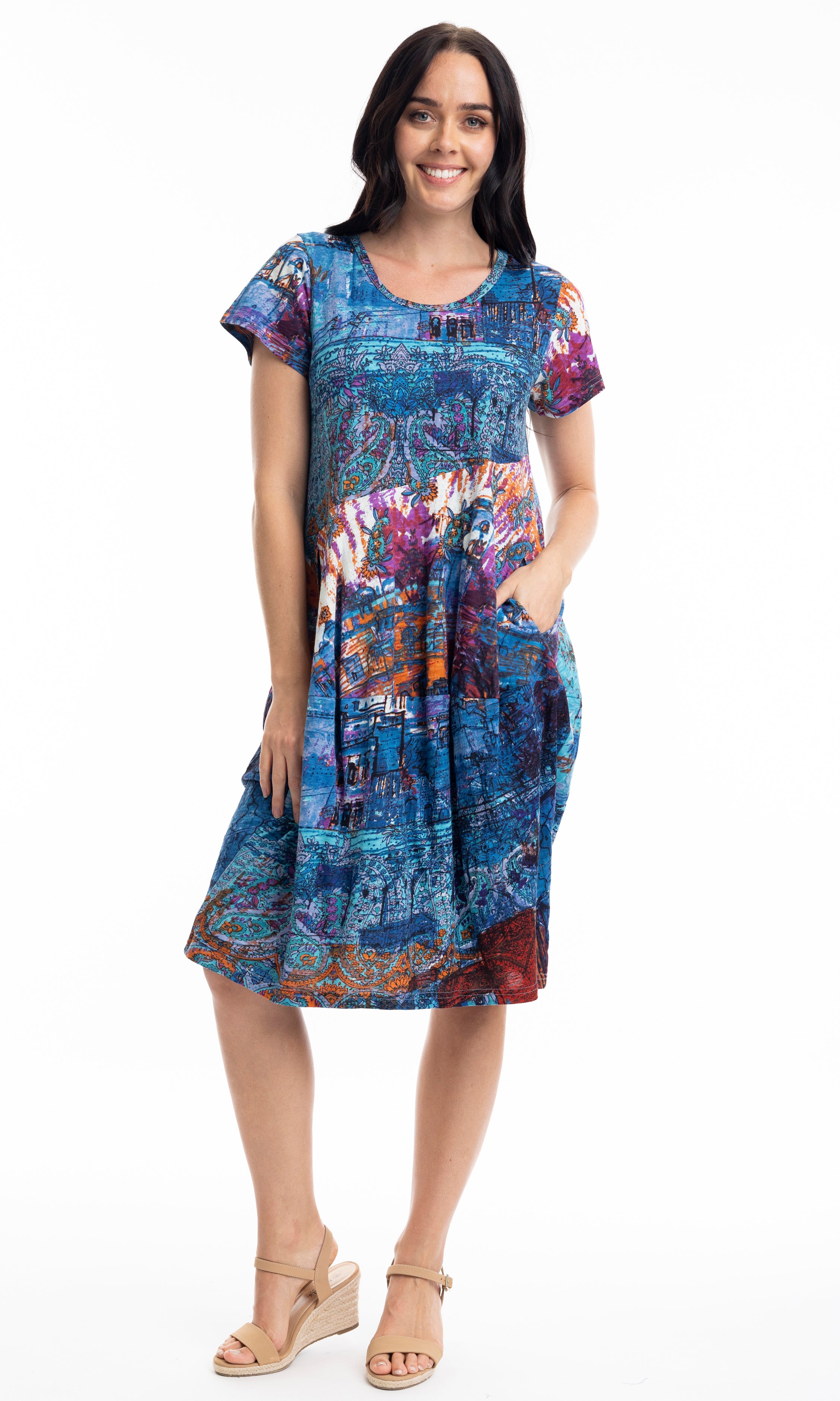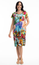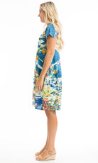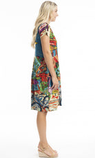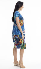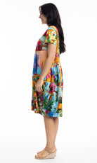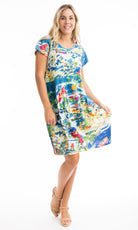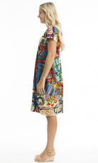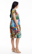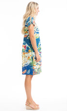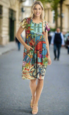 Shine in our colourful Copacabana bubble dress. Featuring an open neckline, relaxed short sleeves, diagonal waist seam, and practical pockets, this dress showcases gorgeous colours and prints perfect for summer. Its flowing silhouette offers both comfort and style, making it ideal for beach outings and leisurely strolls. The perfect effortless summer dress!