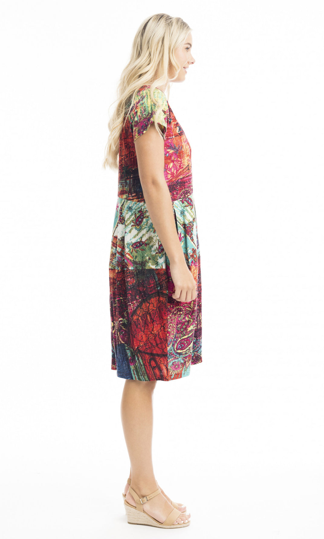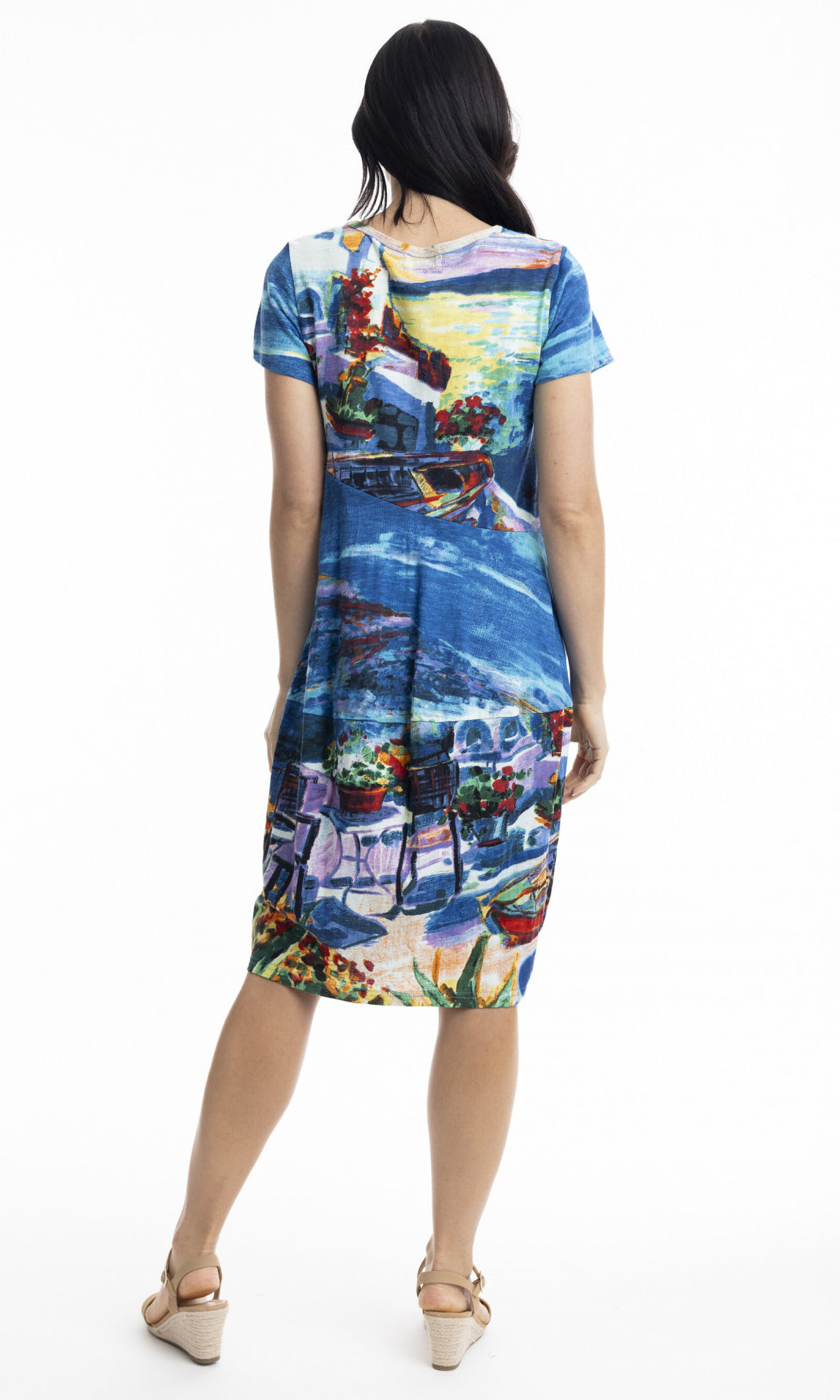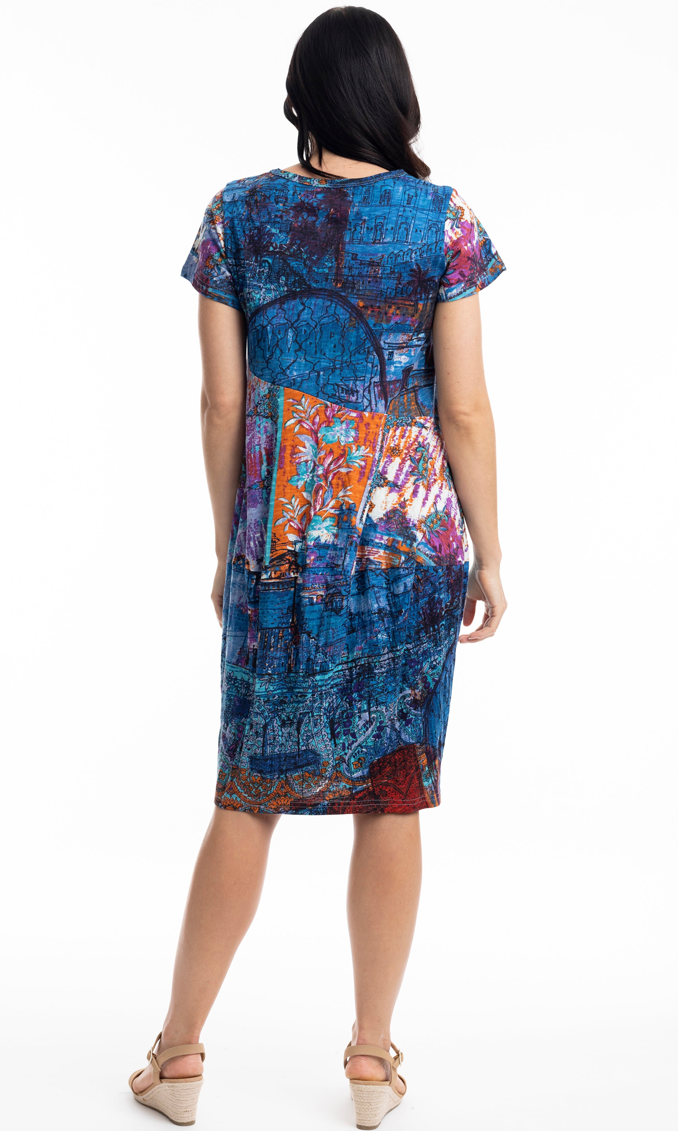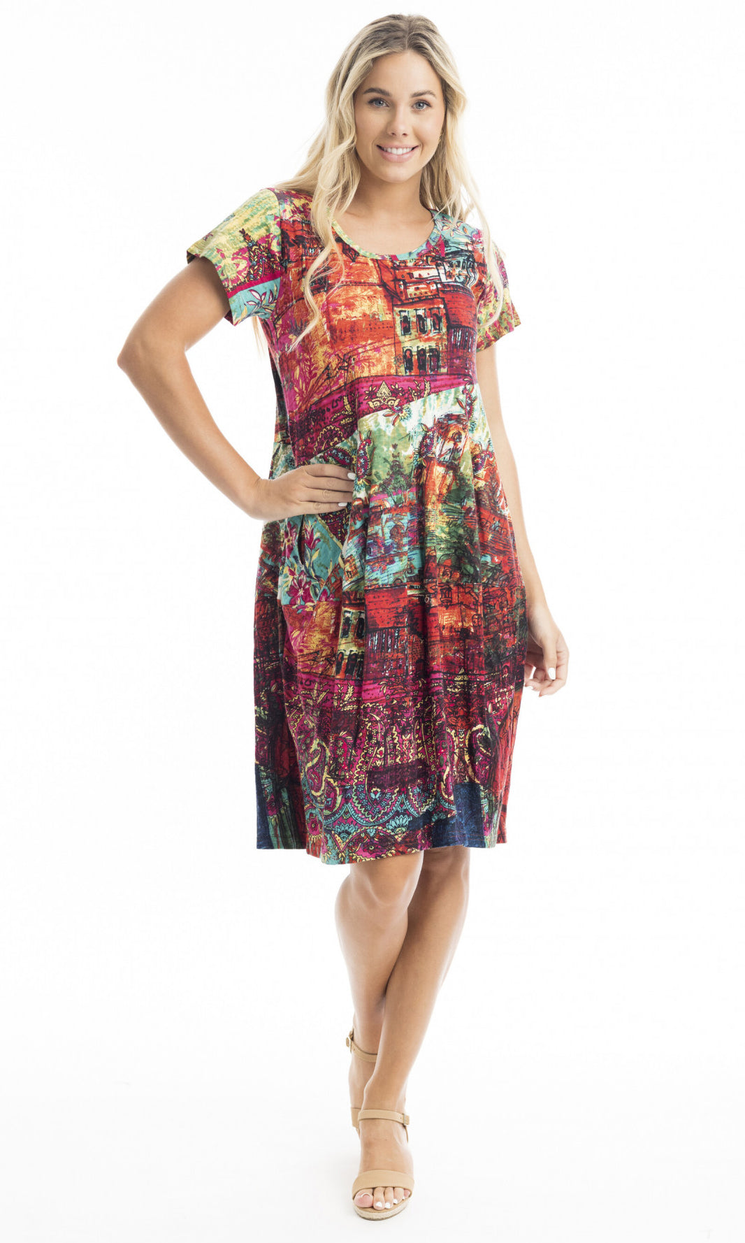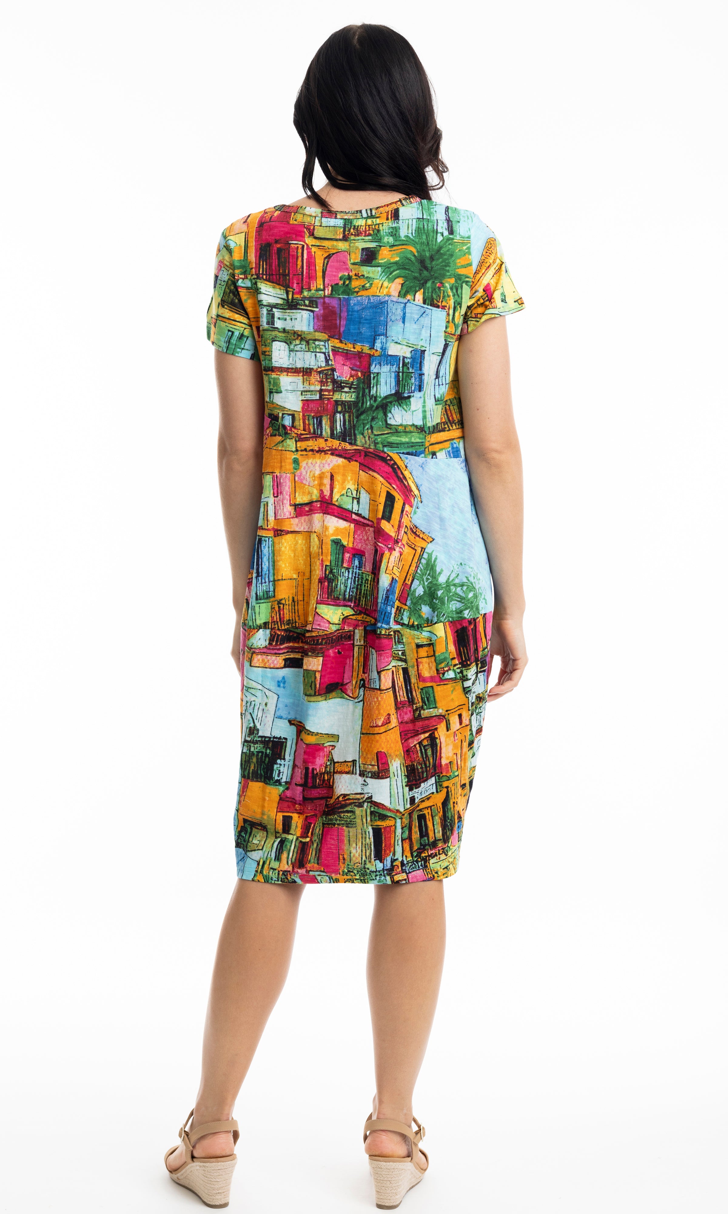 Shine in our colourful Copacabana bubble dress. Featuring an open neckline, relaxed short sleeves, diagonal waist seam, and practical pockets, this dress showcases gorgeous colours and prints perfect for summer. Its flowing silhouette offers both comfort and style, making it ideal for beach outings and leisurely strolls. The perfect effortless summer dress!