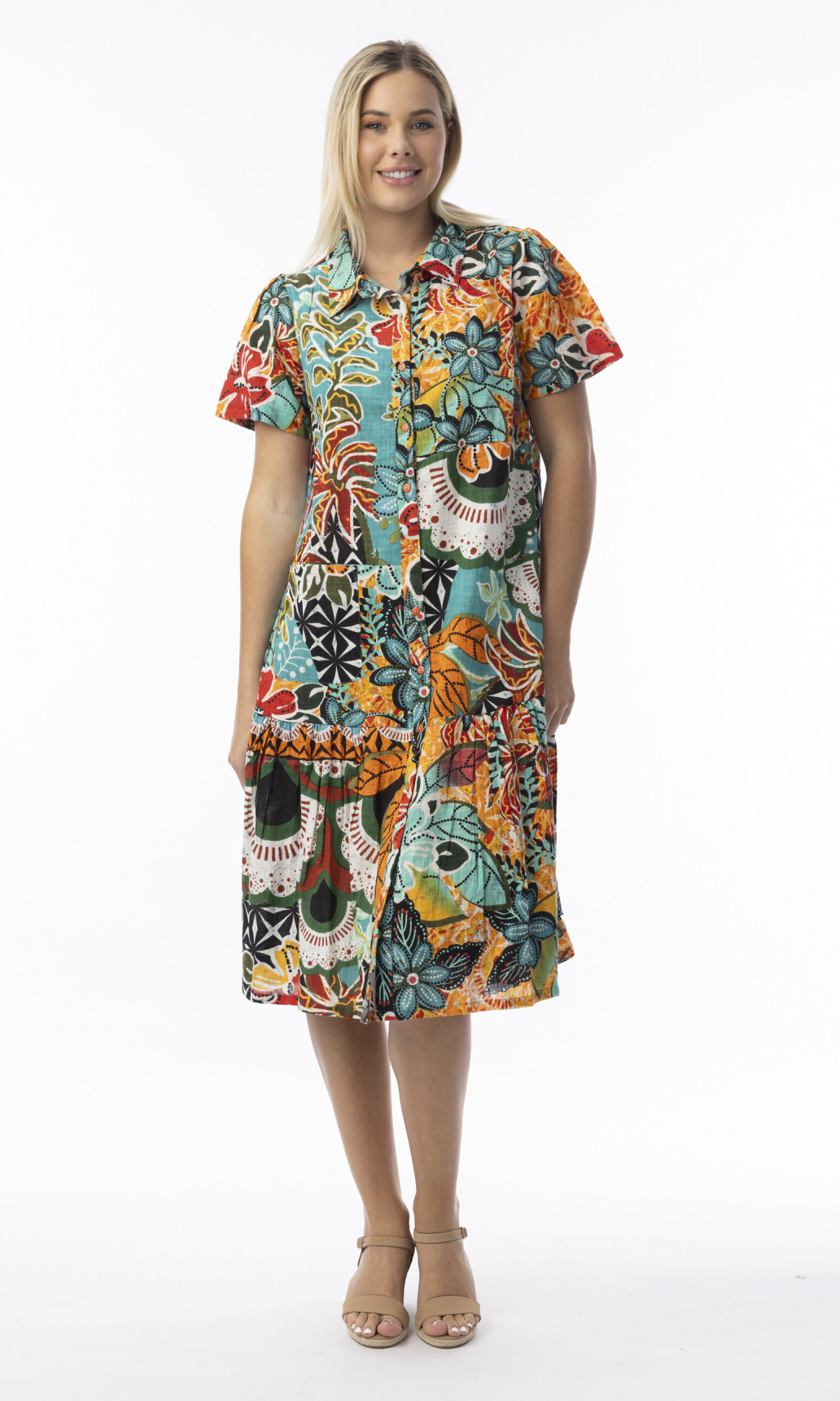 Flaunt your summer style with our stunning our gorgeous Guaratiba Patch Dress! This eye-catching piece features a playful mix of print and colour, making it ideal for sunny days out. With its relaxed fit, tiered skirt, classic button up collar, short sleeves and breathable fabric, you'll stay comfortable and stylish all season long.
