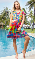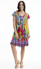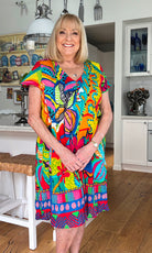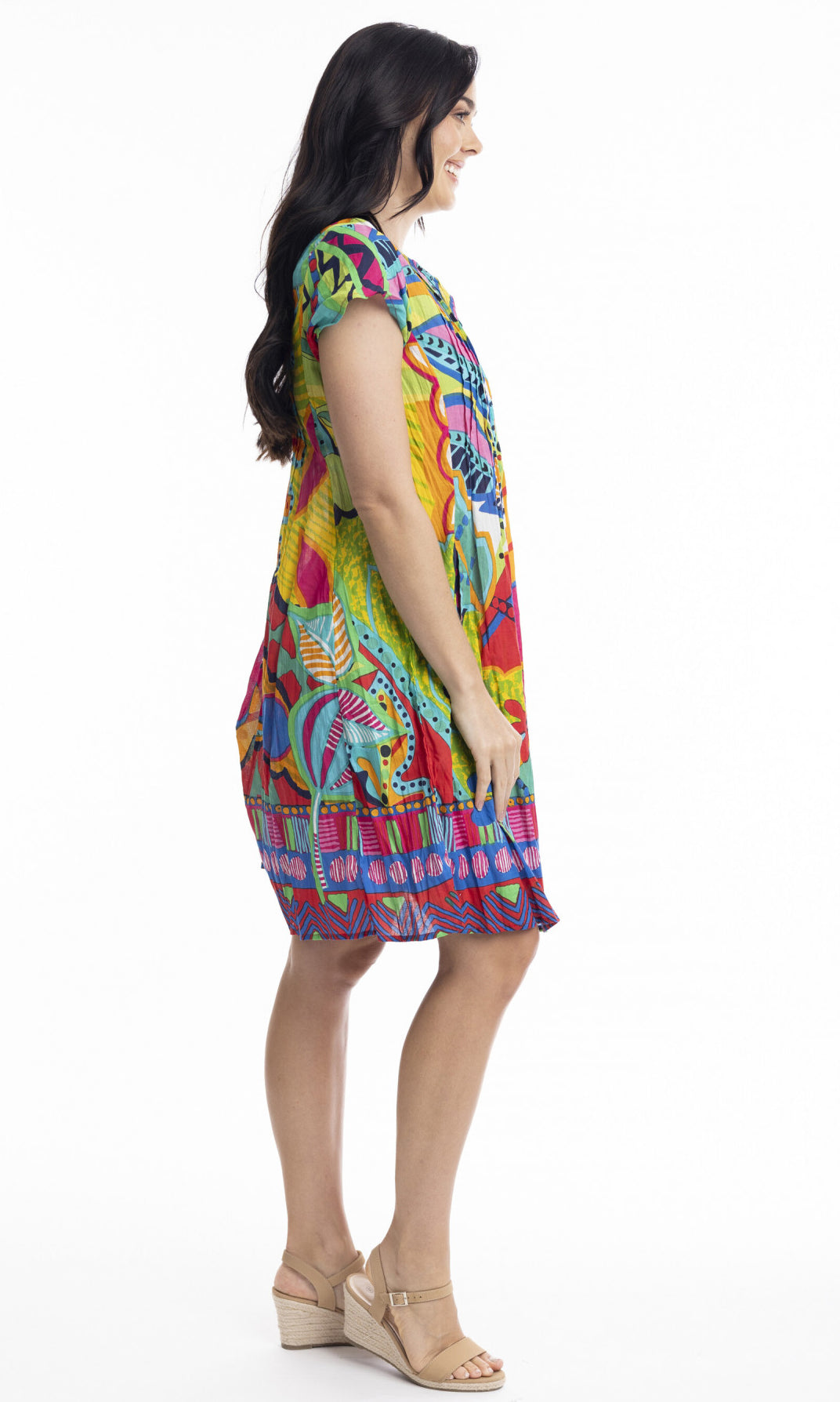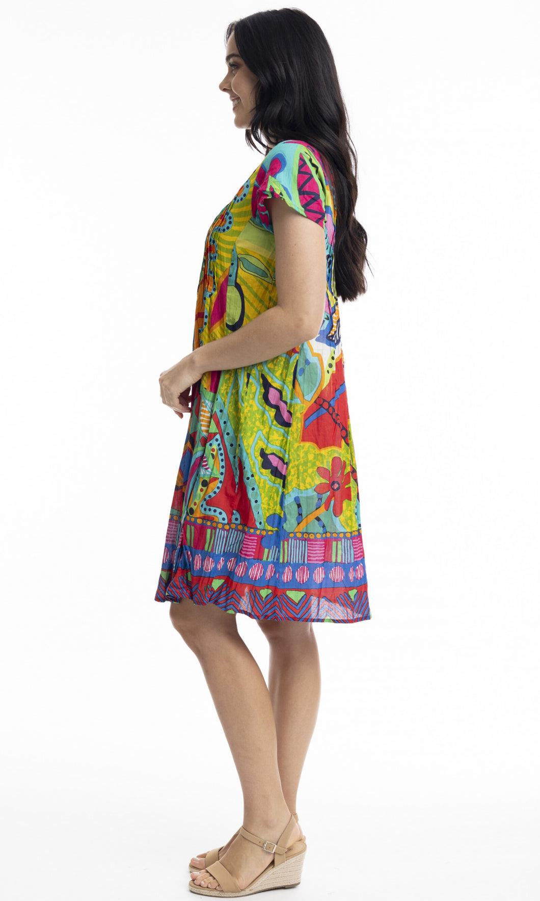 Brighten your summer wardrobe with our vibrant San Miguel easy fit dress! Featuring a flattering v-neckline, chic pleats at the bust, and short sleeves, this piece offers a stylish solution for any occasion. Your new go-to summer dress!