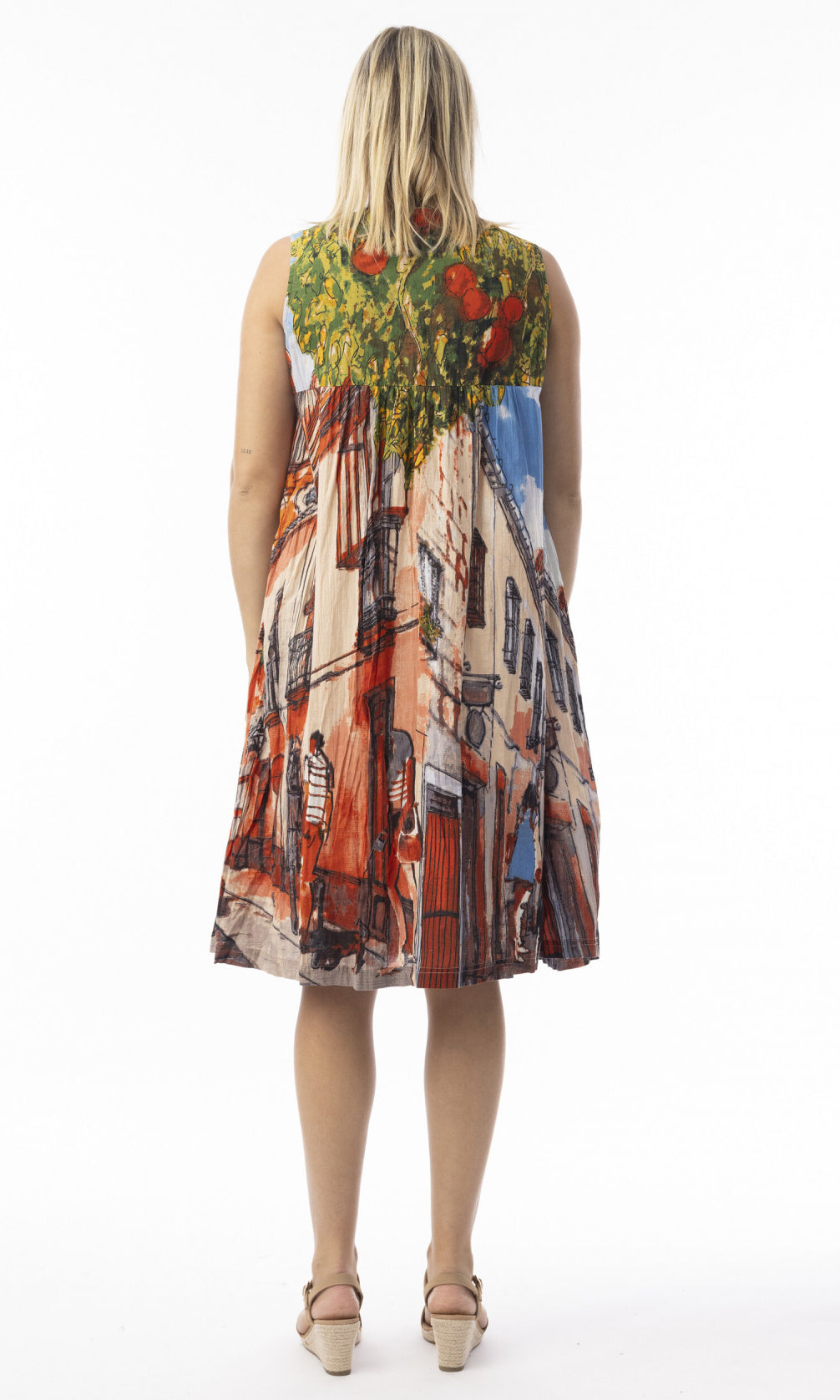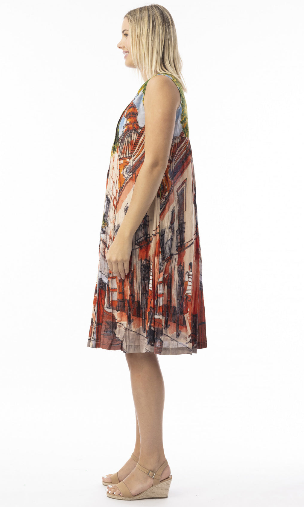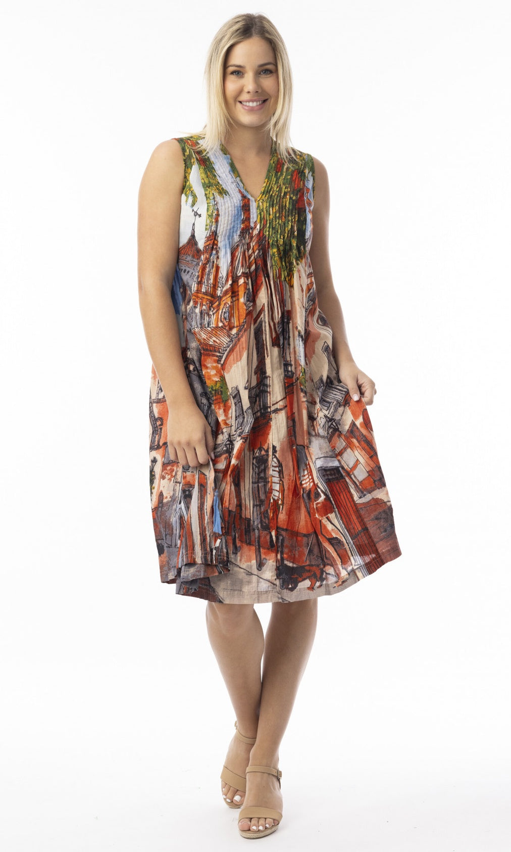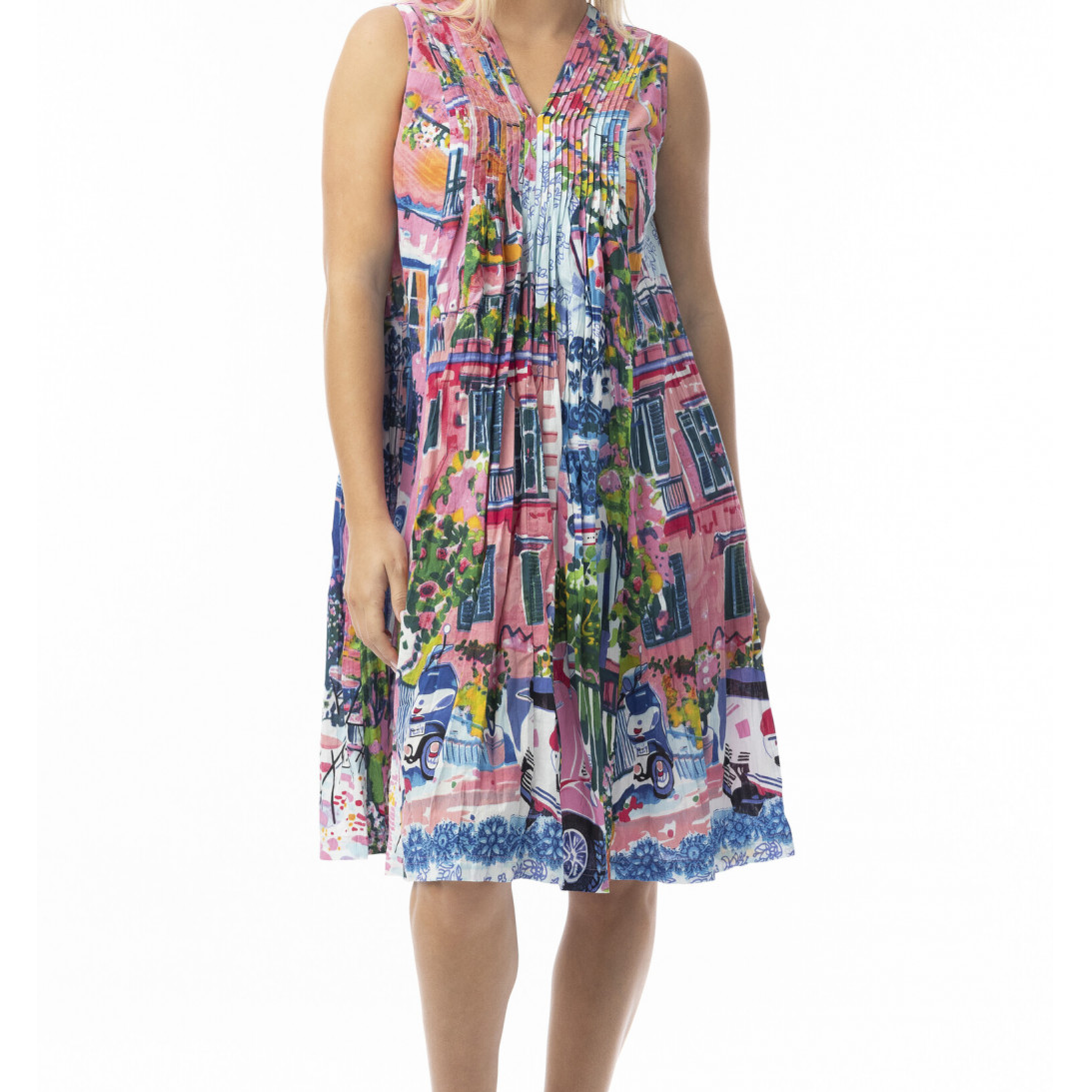 Crinkle Cotton Dress V Neck Pleated Tower Peach