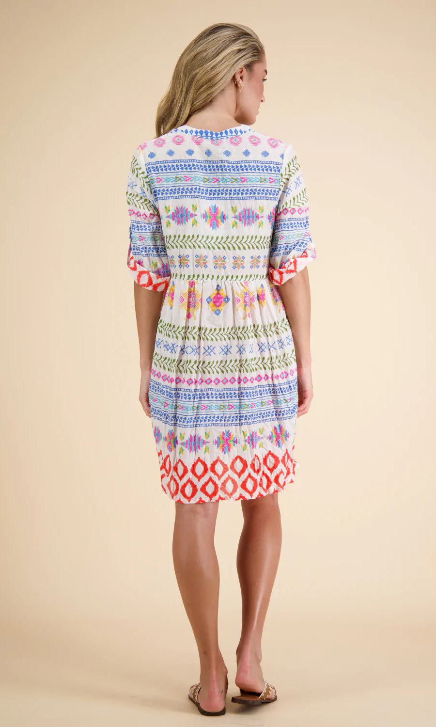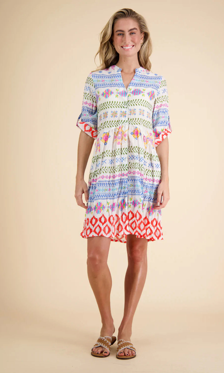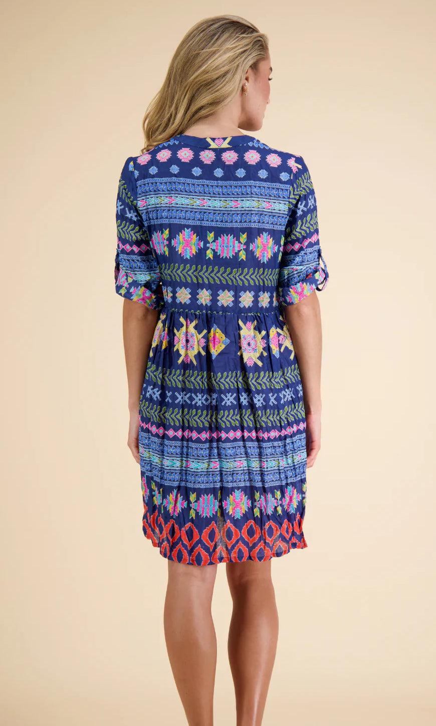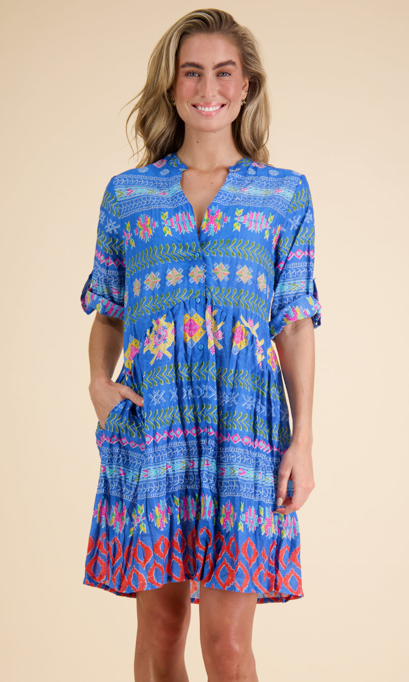 The Loretta Dress is a 100% cotton dress in one of our latest vibrant alternating aztec style prints. Featuring a v-neck entry, full length sleeves and side pockets, this is a must have in your Spring wardrobe.