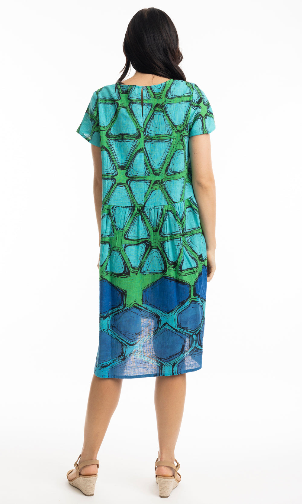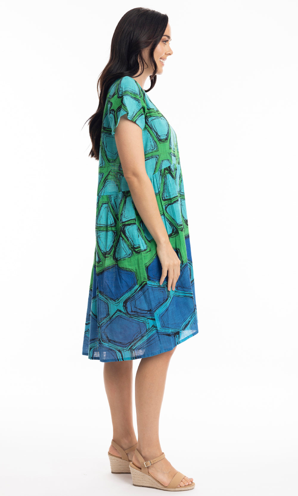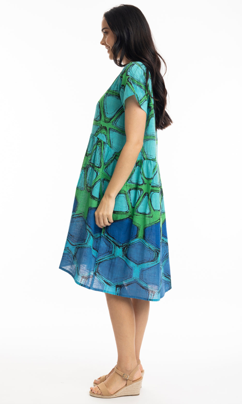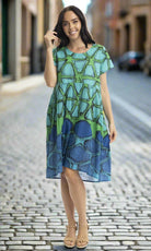 Step into summer with our Whitsundays dress. Featuring a round neckline, short sleeves, and gathered waist seam that falls into a knee length skirt, this dress showcases beautiful patterns perfect for summer. Its flowing silhouette offers both comfort and style, making it ideal for beach outings and leisurely strolls. The perfect effortless summer dress!