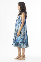 Crinkle Cotton Dress V Neck Pleated Tower Blue