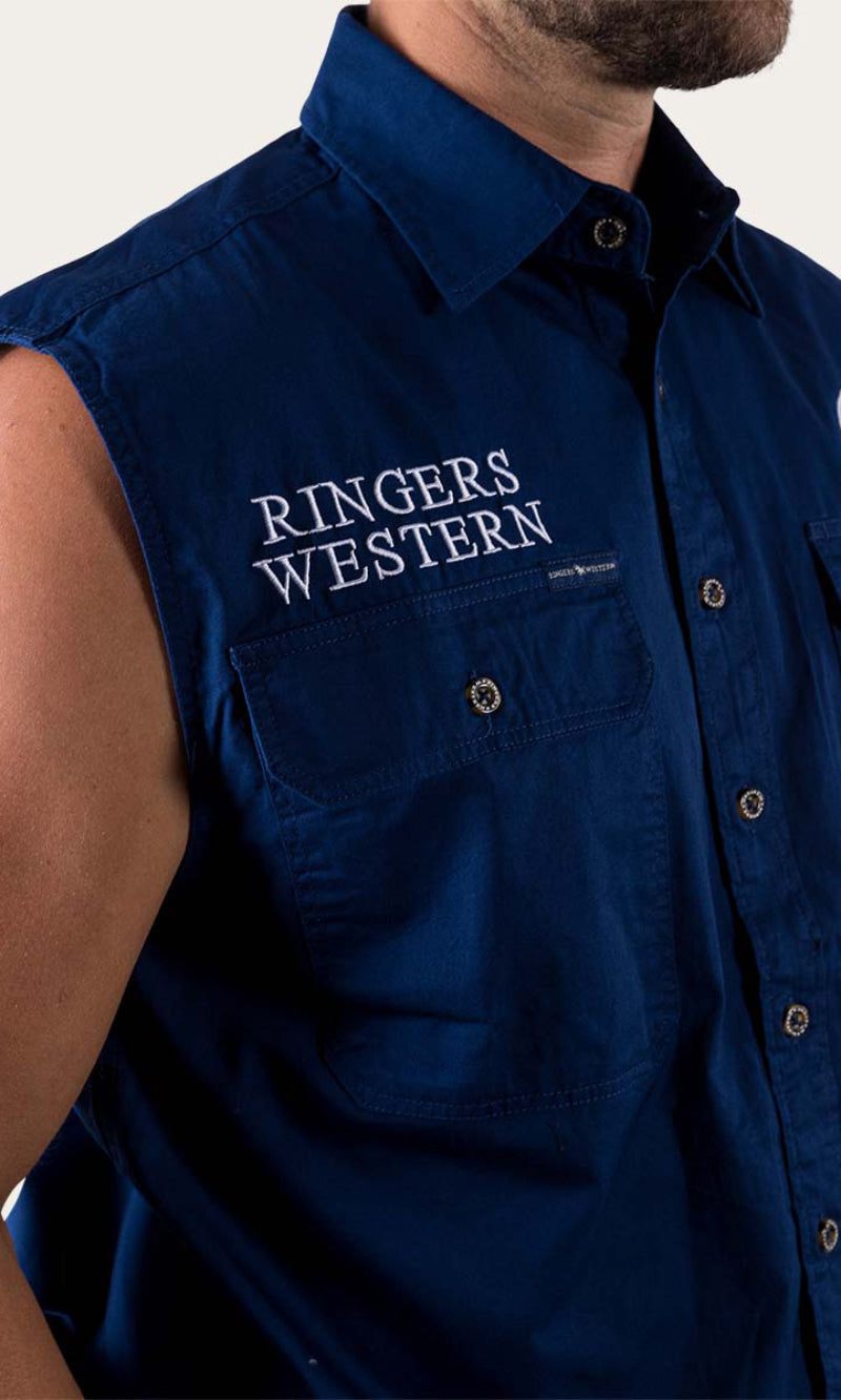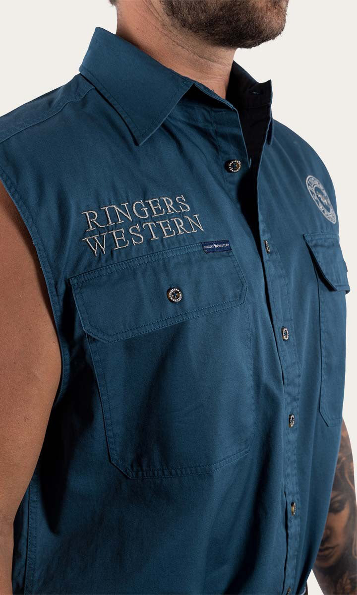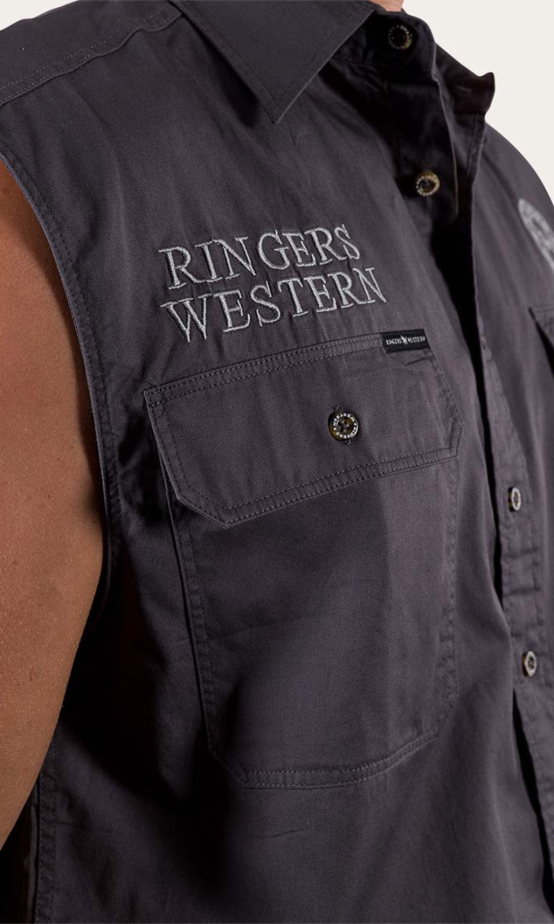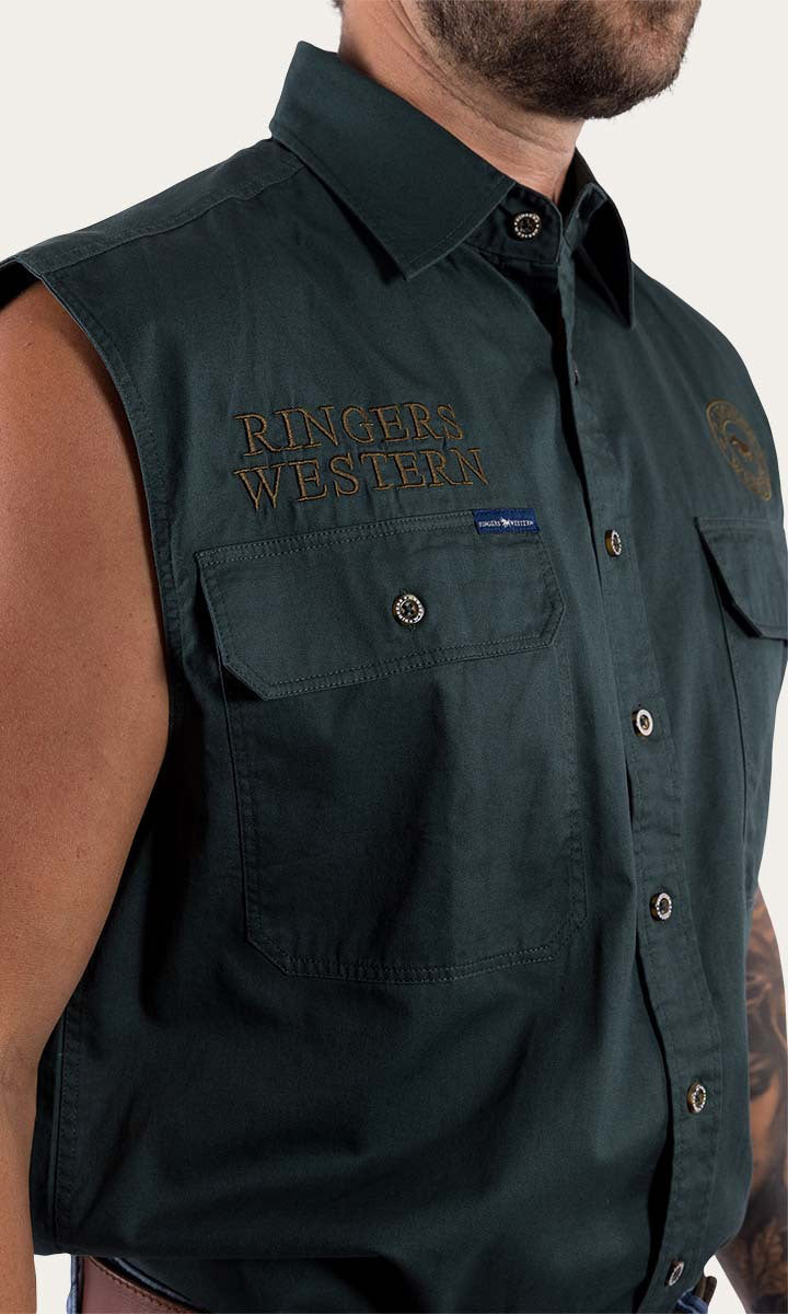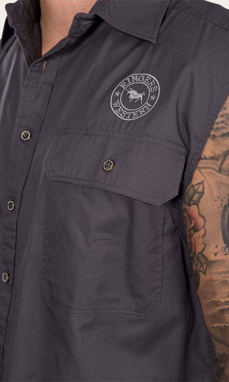 This sleeveless work shirt acknowledges our roots with a signature crest, white embroidery, and Ringers Western appliqué on the chest.