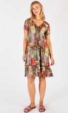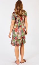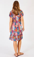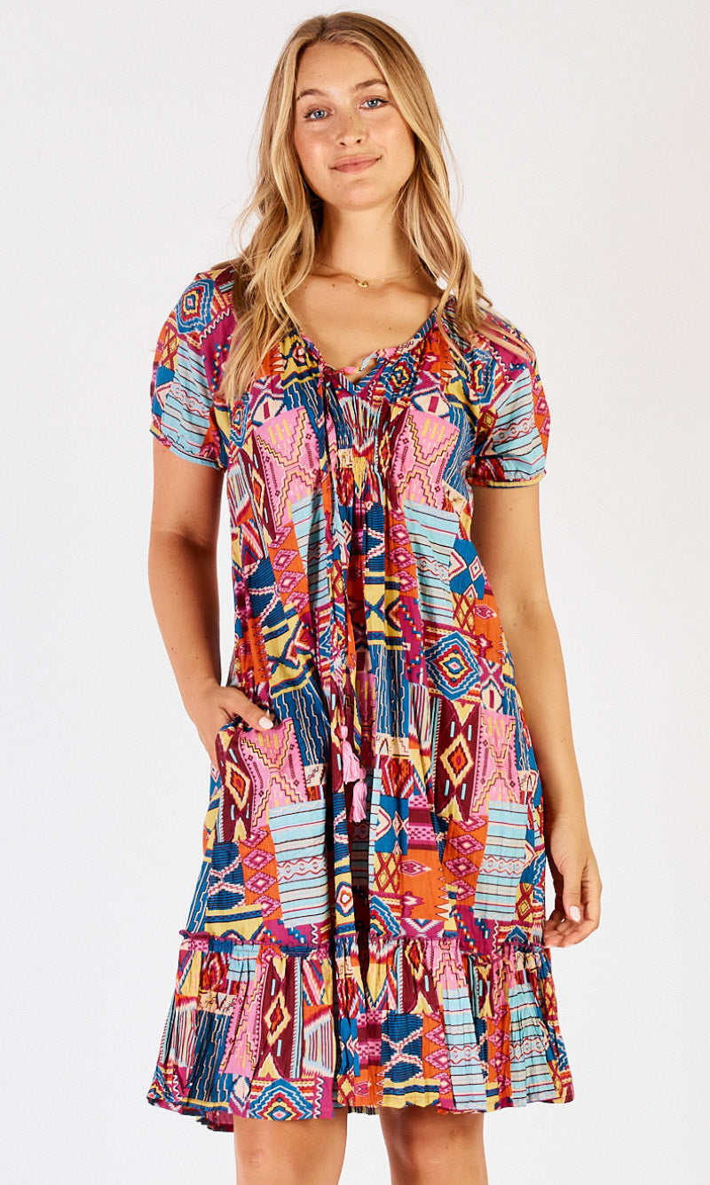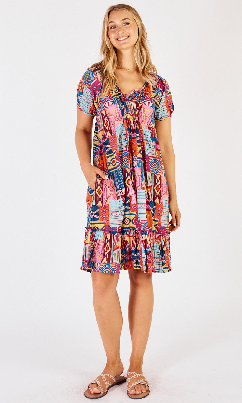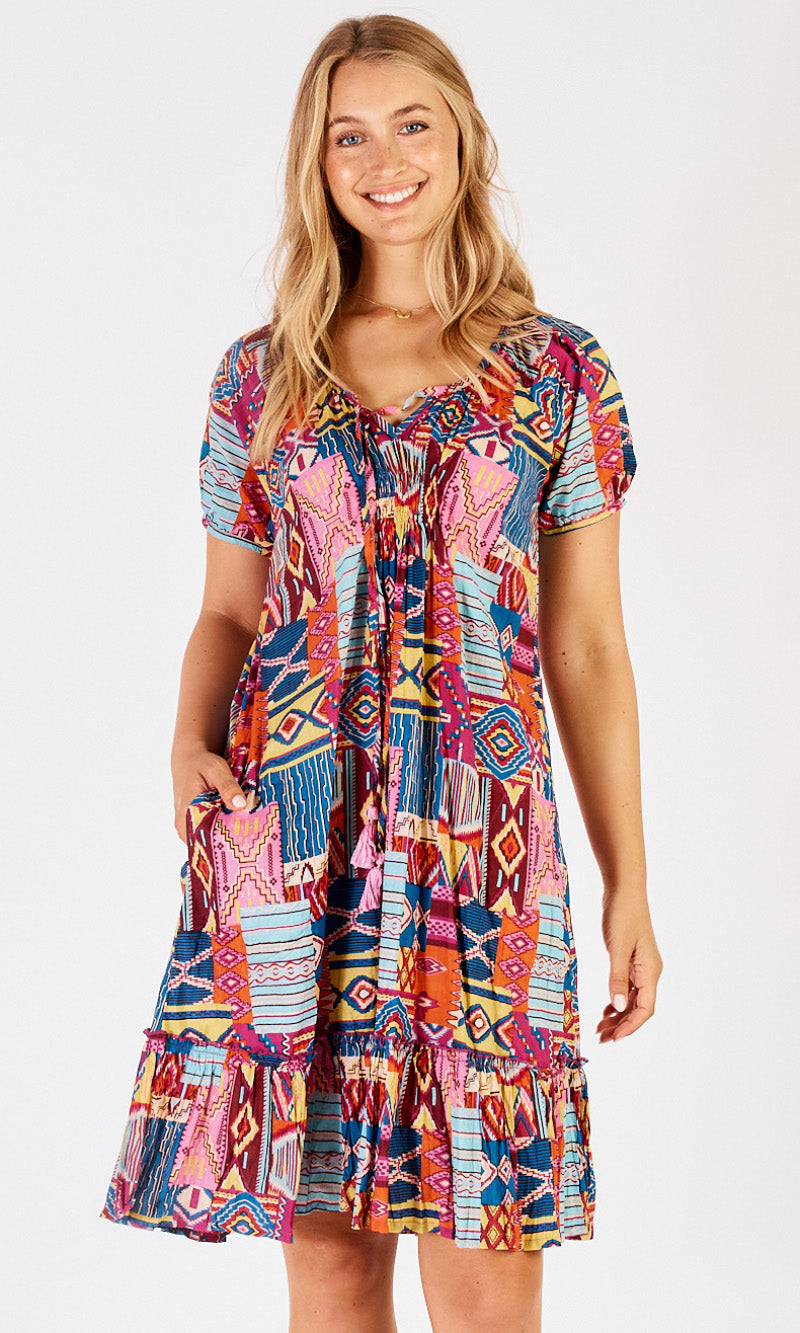The Sylvie Shirred Dress features an adjustable neckband entry with front ties, and is crafted from our ultra soft 100% cotton fabric. A patchwork print encompasses a relaxed fitting tiered shaped body.