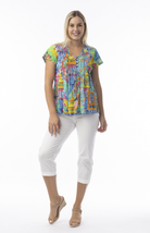 Brighten up your wardrobe with our gorgeous Okayama top. Featuring a comfortable round neckline, delicate pleats at the bust, and cap sleeves, this piece promises both comfort and elegance. This is the perfect piece for sunny, seaside days.