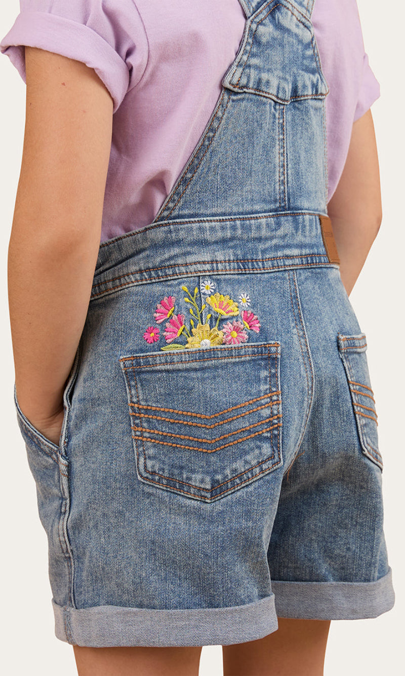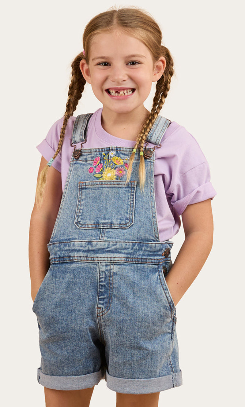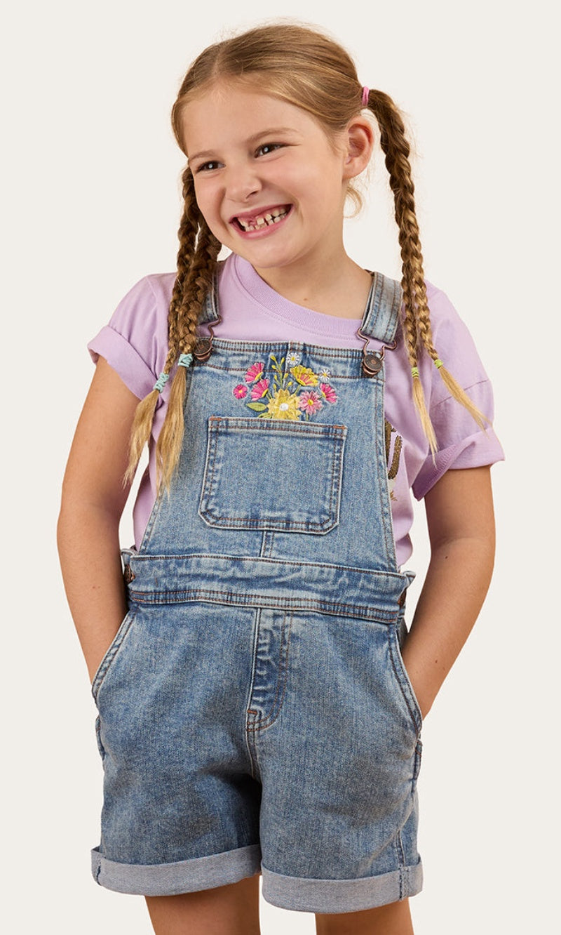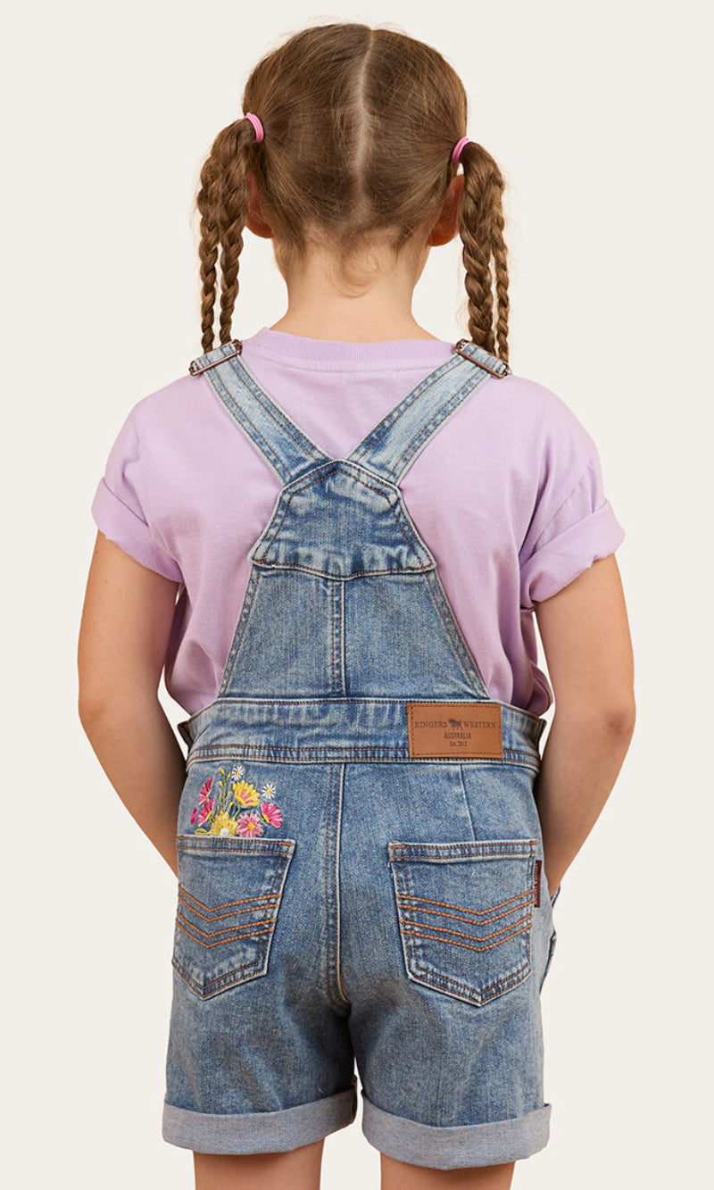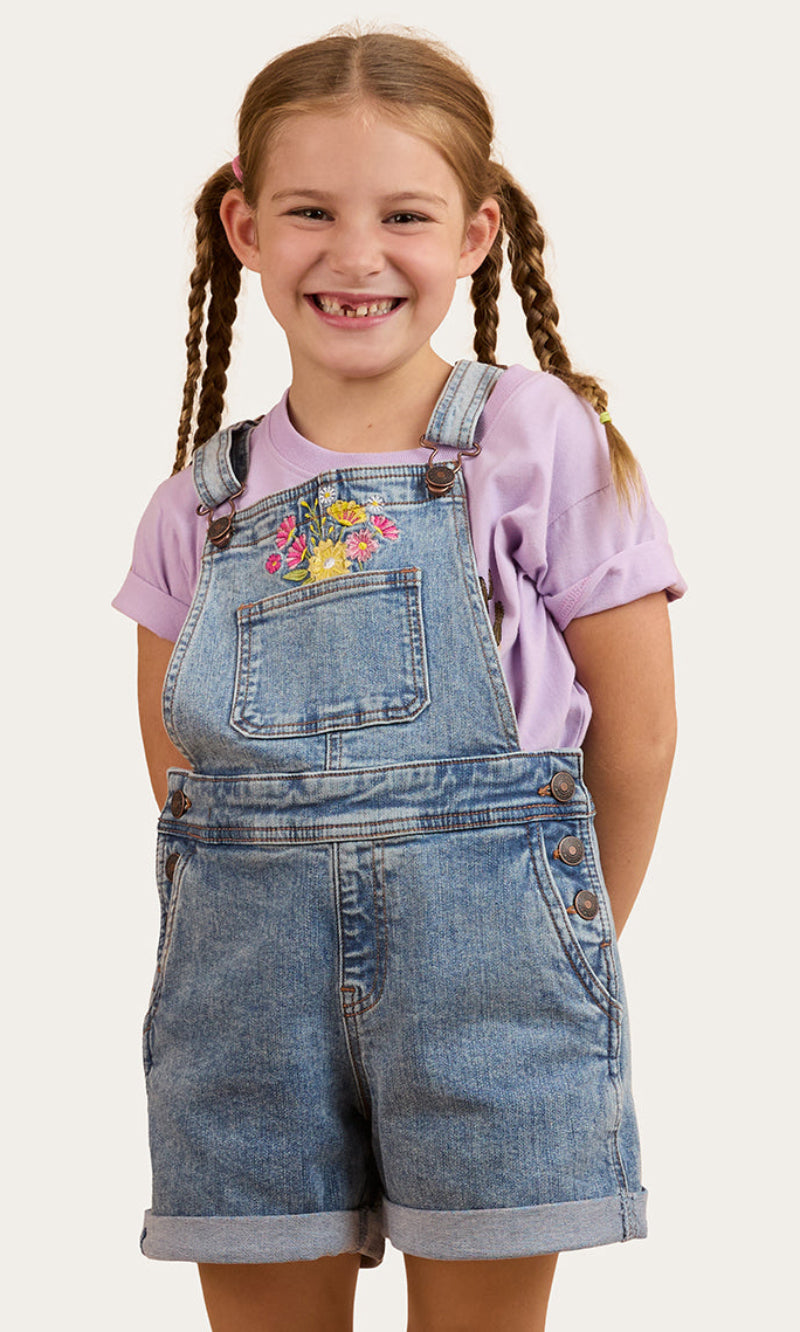 Adventure awaits with the Dahlia Kids Denim Short Overall.