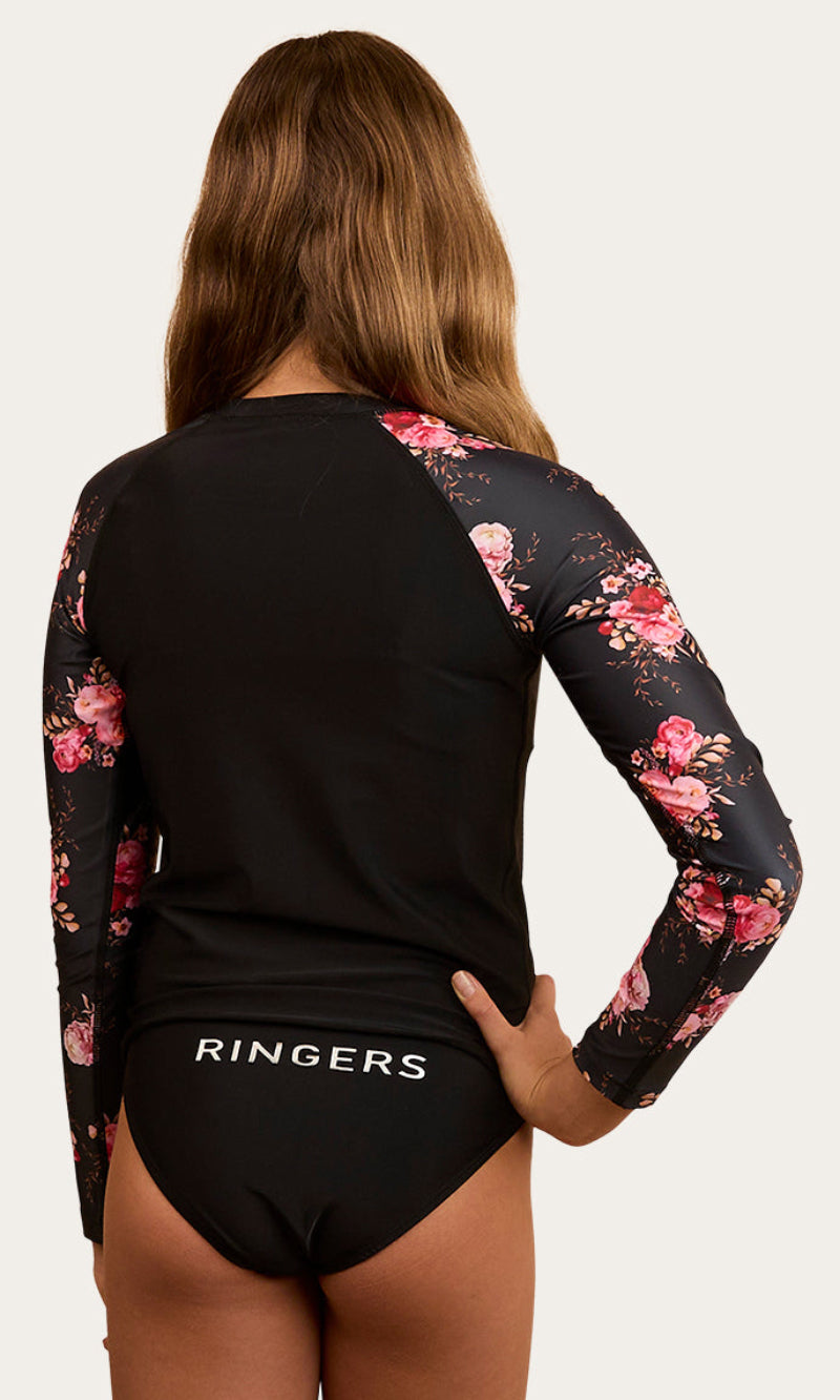 Created from a matt lycra blend, this rashie has a UPF 50+ rating - offering superior comfort and protection, making the Gabrielle perfectly suited to days spent enjoying our beautiful beaches. The saltwater and chlorine friendly design of this garment add to its functionality, ensuring this piece will be a summer staple.  Printed sleeves and a printed neckband give this rashie some extra flair, whilst a Ringers chest and sleeve print bring a touch of country charm to the coast.