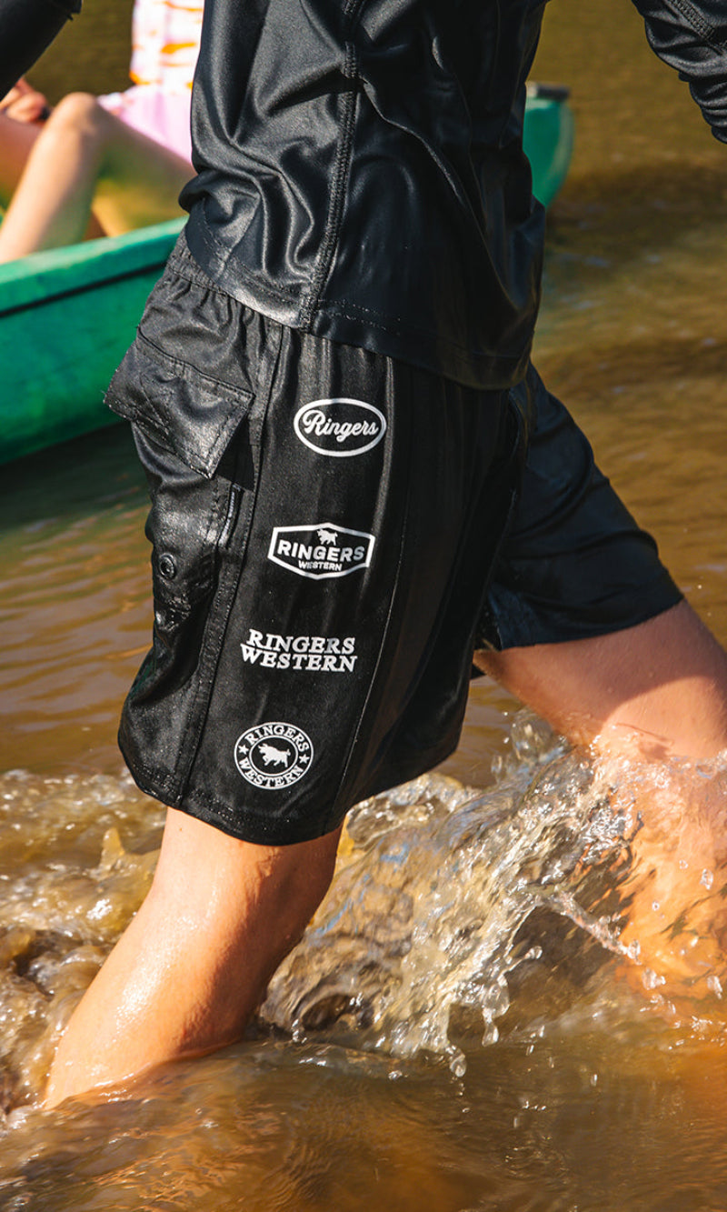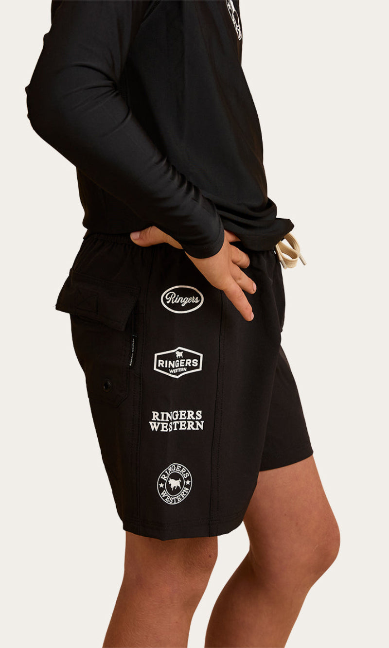 Match Dad with our environmentally friendly Griffith boys swim shorts. These shorts offer a soft feel against the skin and quick dry capabilities due to the Repreve polyester fabric. This fabric is made from recycled plastic bottles making the Griffith boys shorts an eco-friendly choice. These shorts feature an elasticated waist and drawcord allowing for a comfortable and slightly customisable fit. Multiple Ringers Western prints are proudly displayed on the right leg of this garment making these shorts a stylish addition to any little tackers swim collection.