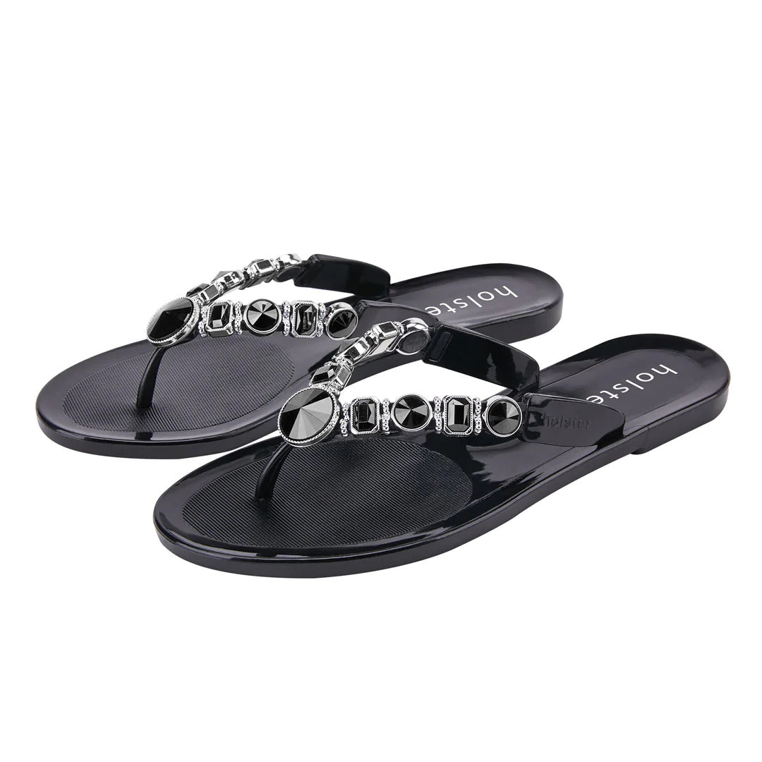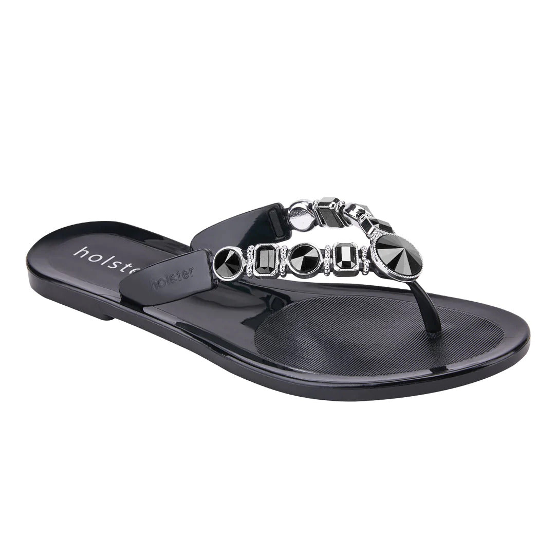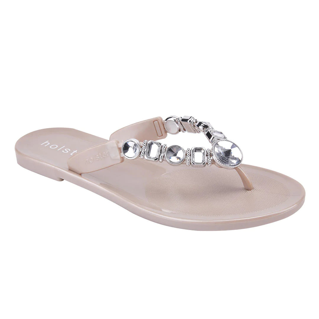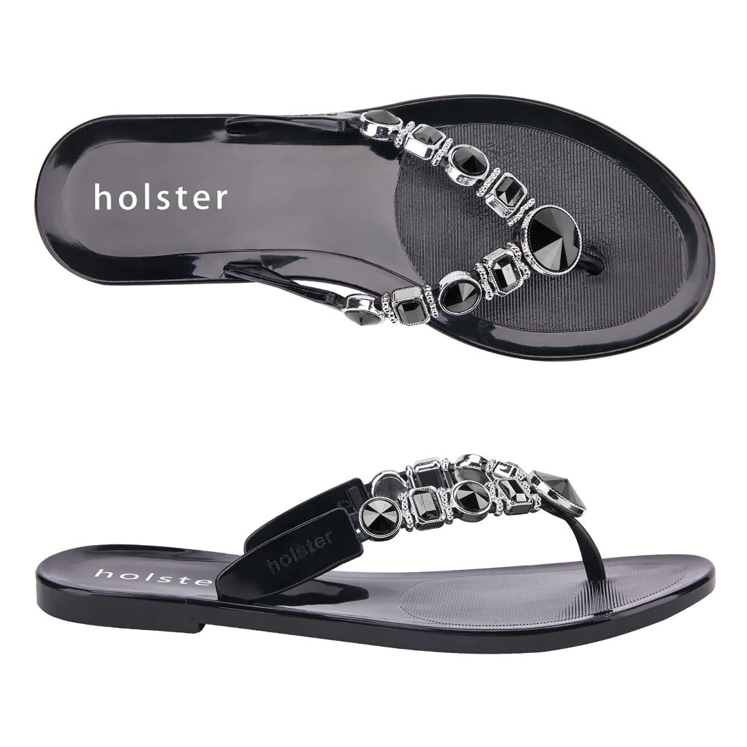 Make a statement in sparkle wearing holster’s vegan, jelly Y-strap, Madeline. Adorned by 18 signature jewels, Madeline’s contoured insoles, air-pocket heels and beautifully embellished uppers add shimmer and shine to your sole. Enjoy the comfort of Madeline’s snug jewelled strap for lounging, shopping, and inspiring some serious shoe envy.