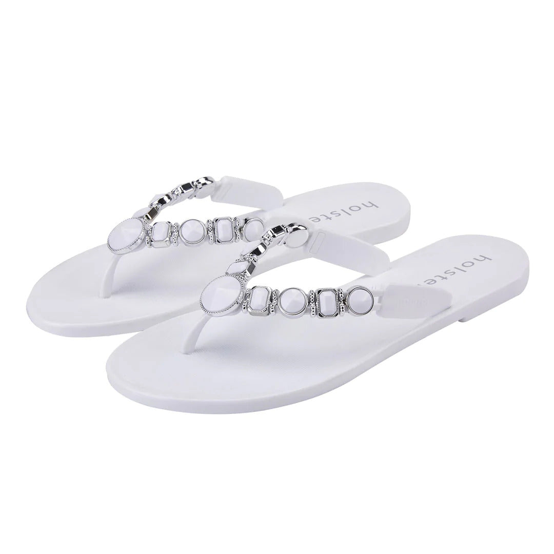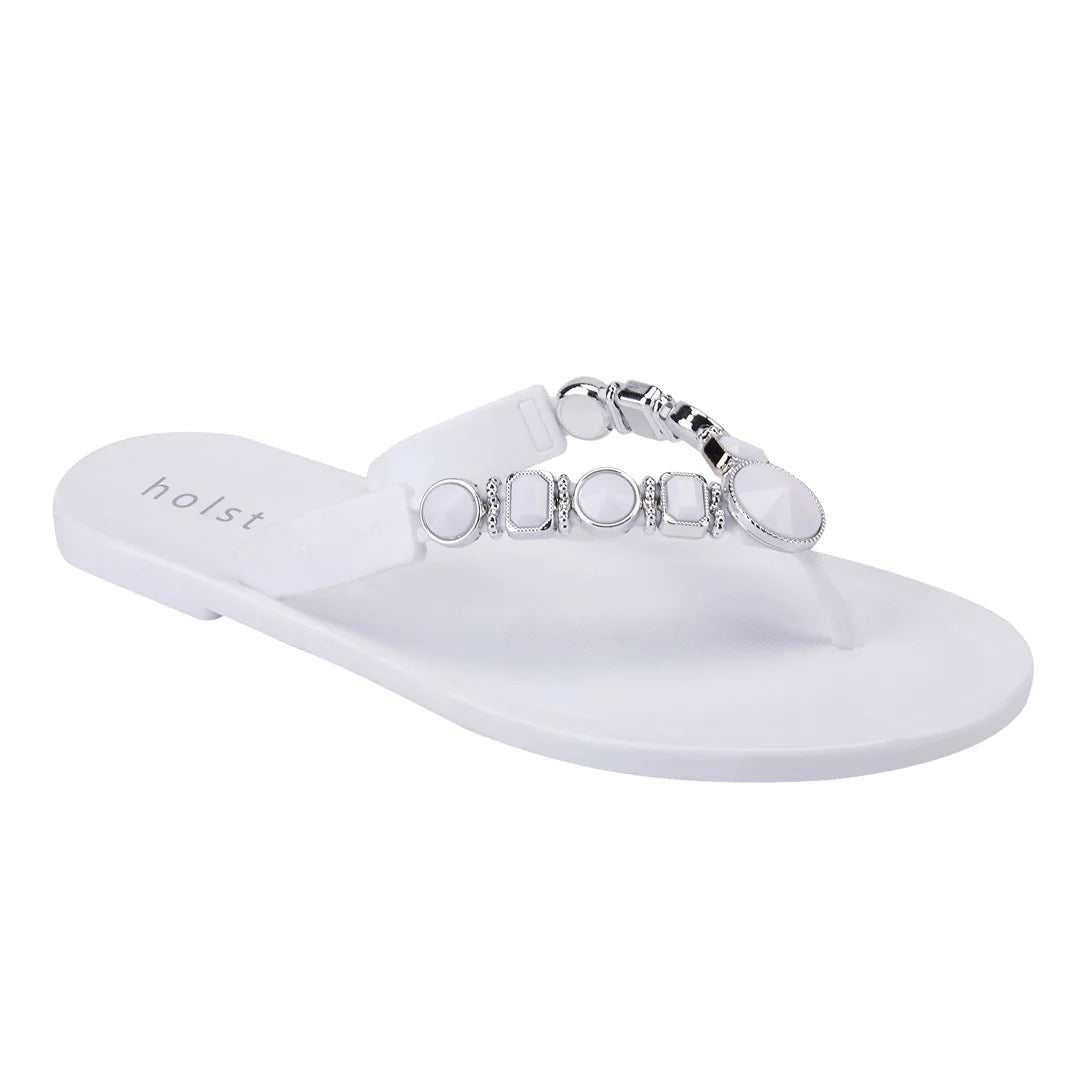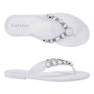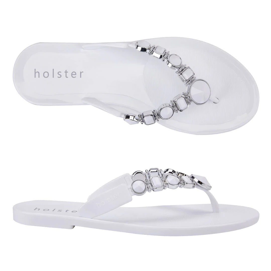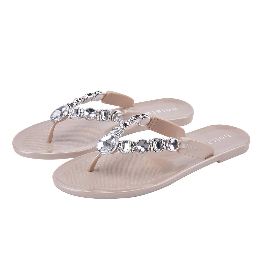Make a statement in sparkle wearing holster’s vegan, jelly Y-strap, Madeline. Adorned by 18 signature jewels, Madeline’s contoured insoles, air-pocket heels and beautifully embellished uppers add shimmer and shine to your sole. Enjoy the comfort of Madeline’s snug jewelled strap for lounging, shopping, and inspiring some serious shoe envy.