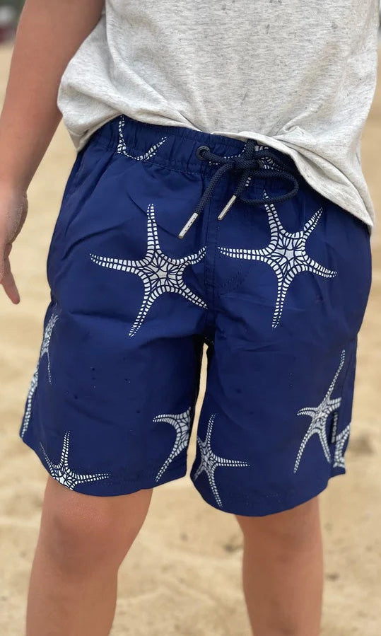 The Boys Port Macquarie Board Shorts by Coast Clothing are a great classic print to get your boy through any summery day. Featuring Starfish print over a blue base, it doesn't matter if he's playing in the water or digging in the sand, he will be in comfort and style all summer long. Made from 100% Recycled Plastic bottles.