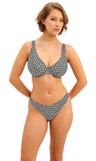 Koh Tao is bringing back the charm of vintage vacations for SS26, featuring a retro inspired monochrome print combined with gold coloured highlights for a modern twist. Select shapes are accented with textured, gold coloured rings for a luxe feel and the collection debuts our new Brazilian Brief, which offers a cheeky bottom coverage and a flattering back gather detail.