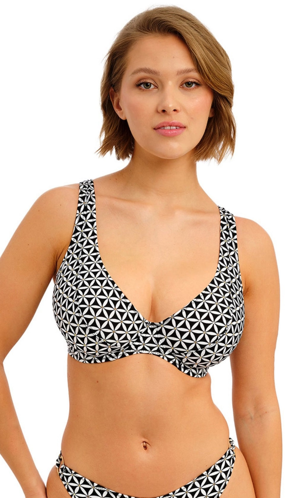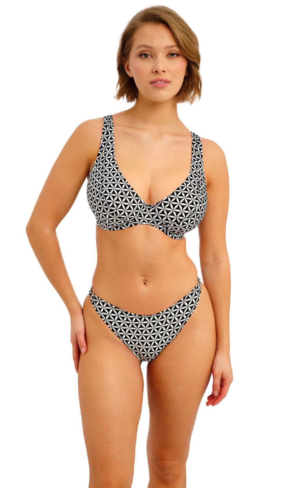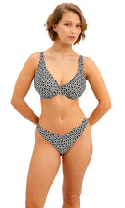 Koh Tao is bringing back the charm of vintage vacations for SS26, featuring a retro inspired monochrome print combined with gold coloured highlights for a modern twist. Select shapes are accented with textured, gold coloured rings for a luxe feel and the collection debuts our new Brazilian Brief, which offers a cheeky bottom coverage and a flattering back gather detail.