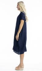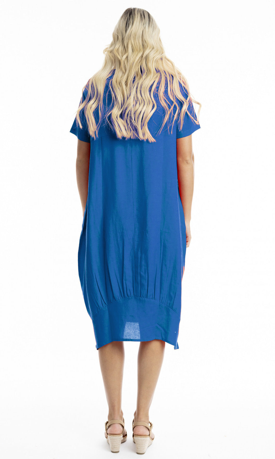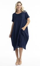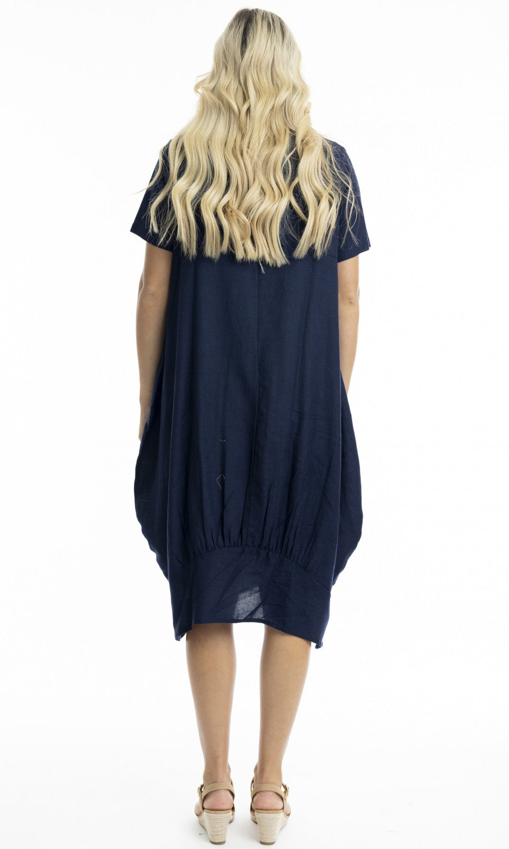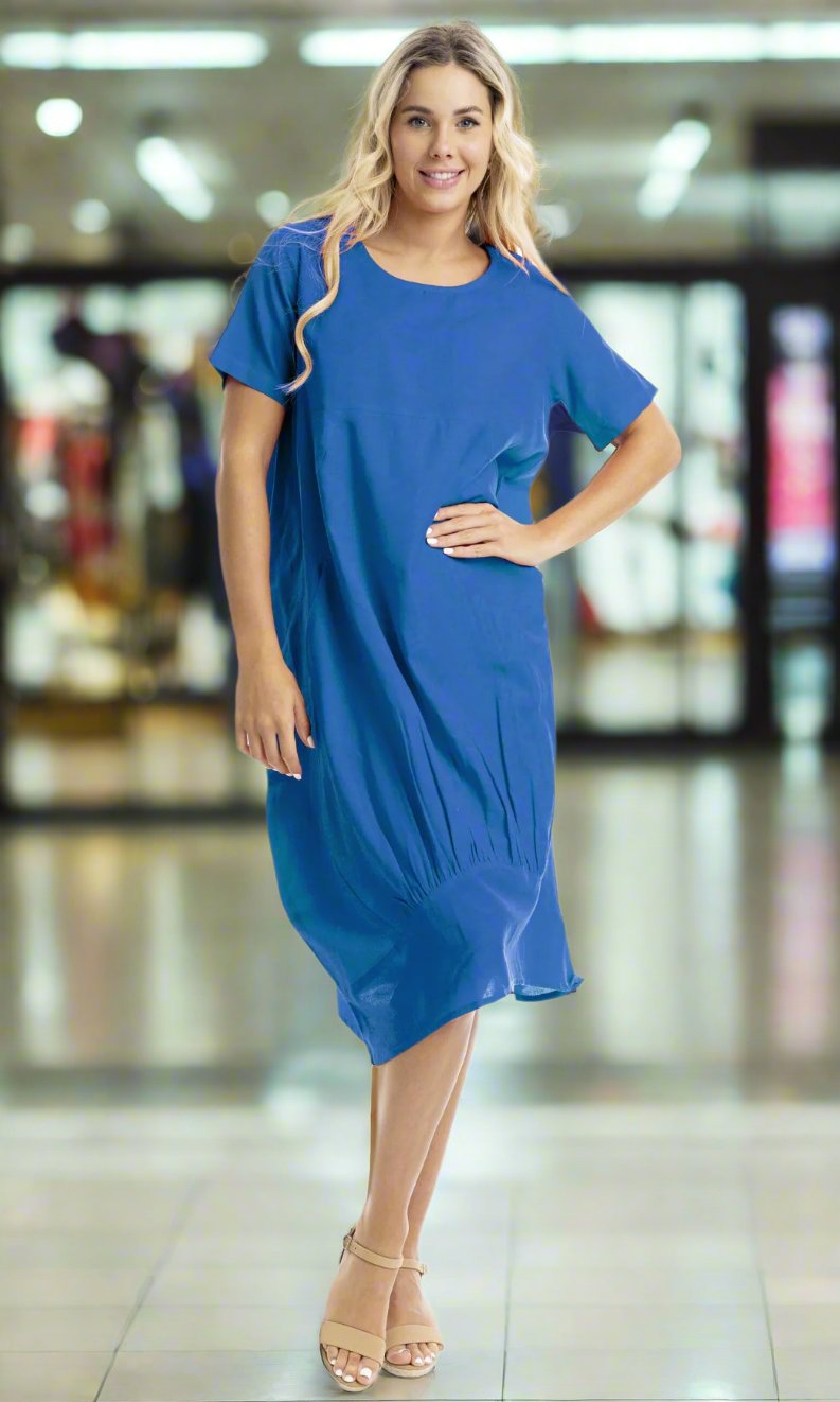 Embrace effortless style with our linen blend bubble dress. Featuring a round neckline and short sleeves, this dress offers a relaxed fit with a tapered gathered hemline for a bubble shape. Its versatile design ensures chic comfort all day long.