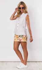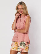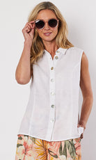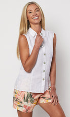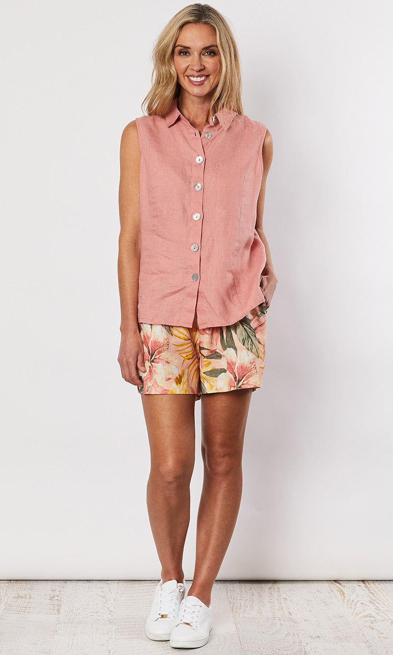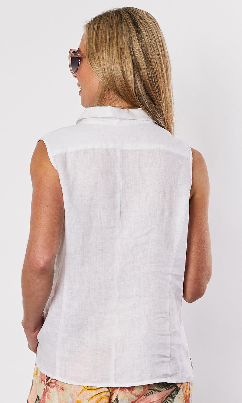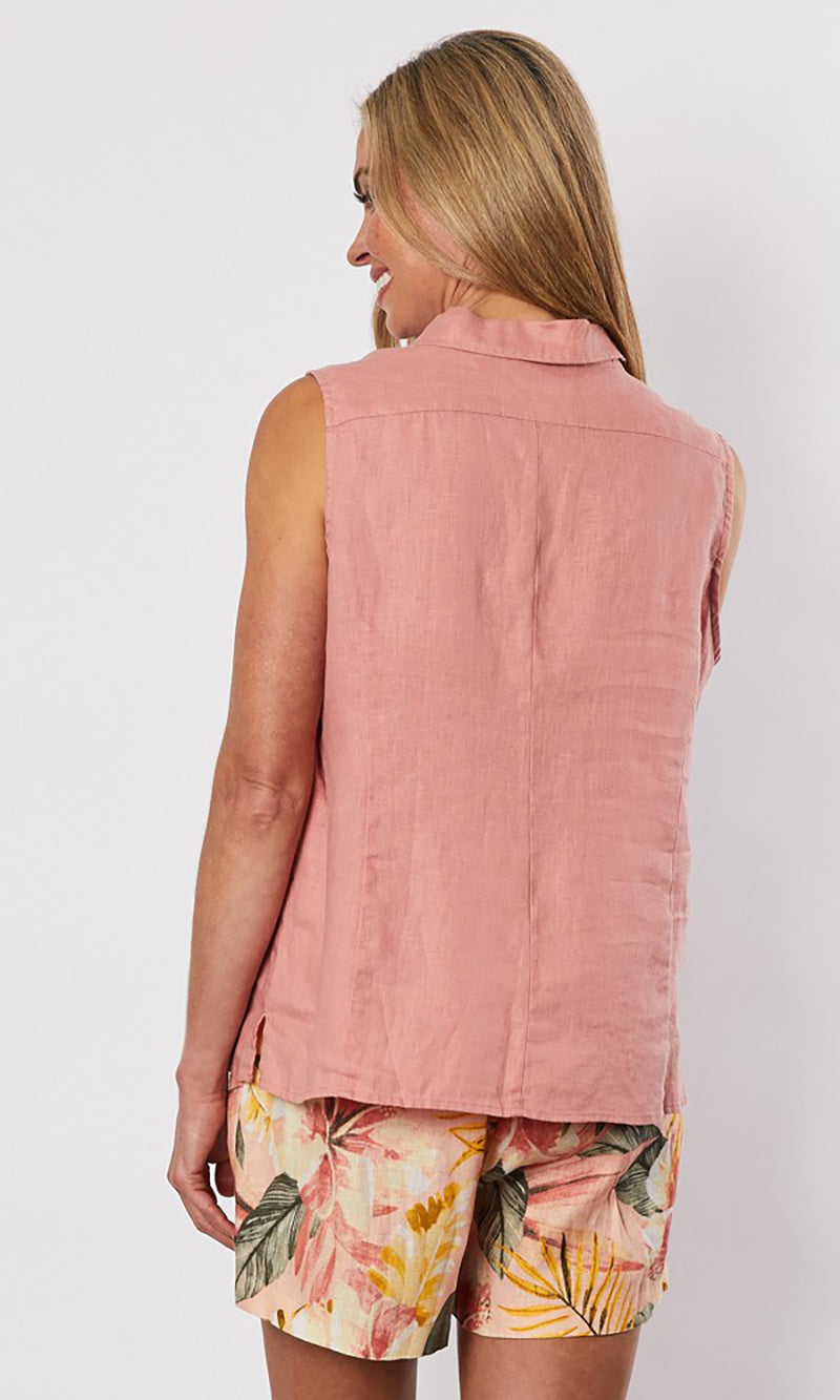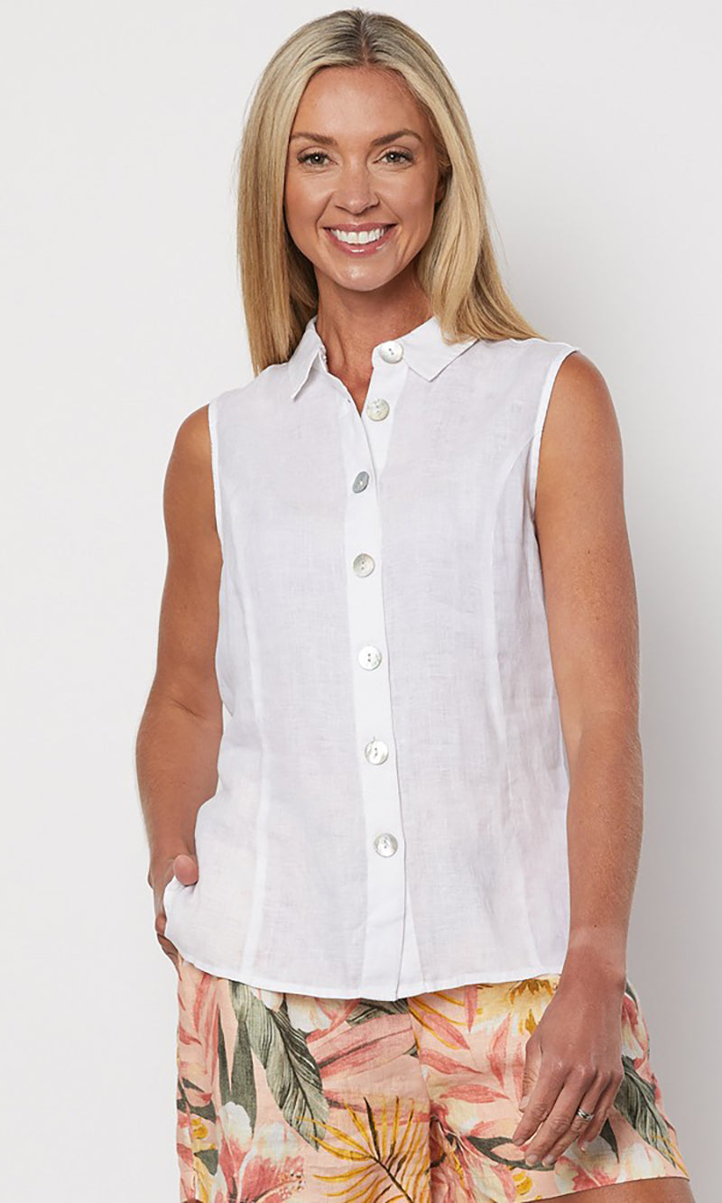 The Sleevless Linen Shirt by Gordon Smith is a fabulous new season style that is sure to be a wardrobe winner. Styled in our signature washer finish pure linen. Perfect to pair back with a print pant for a fun go anywhere look.