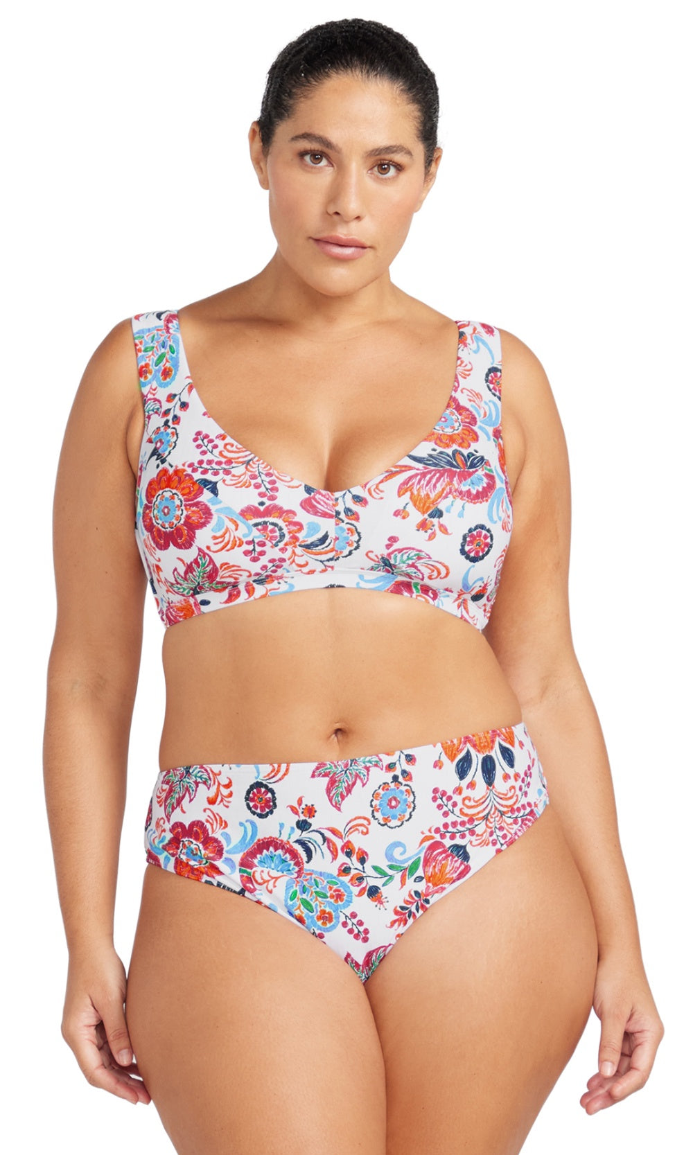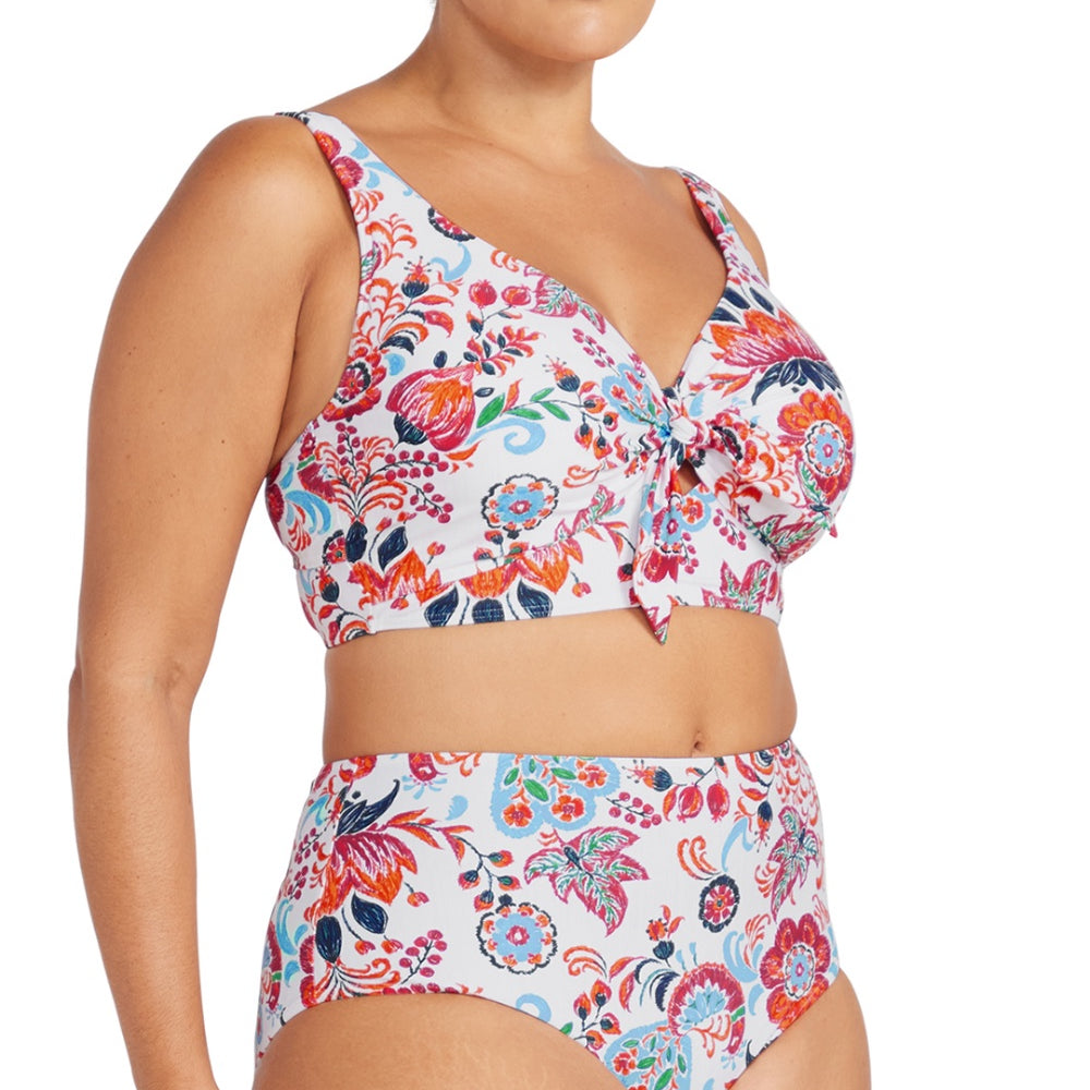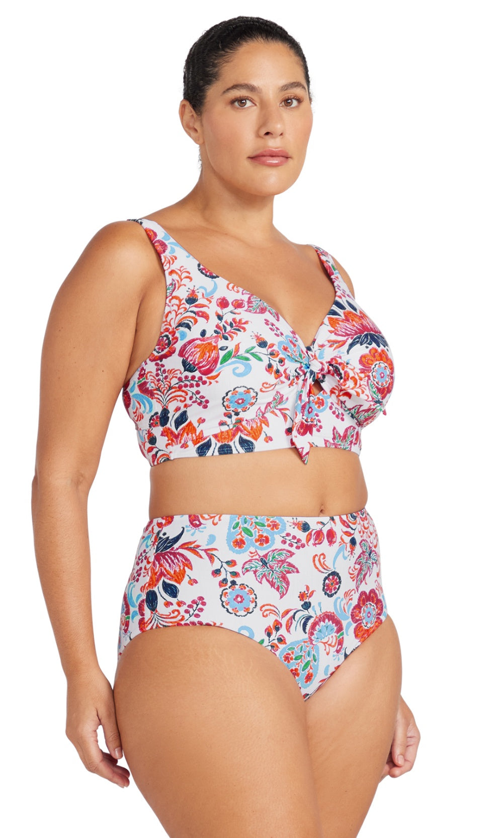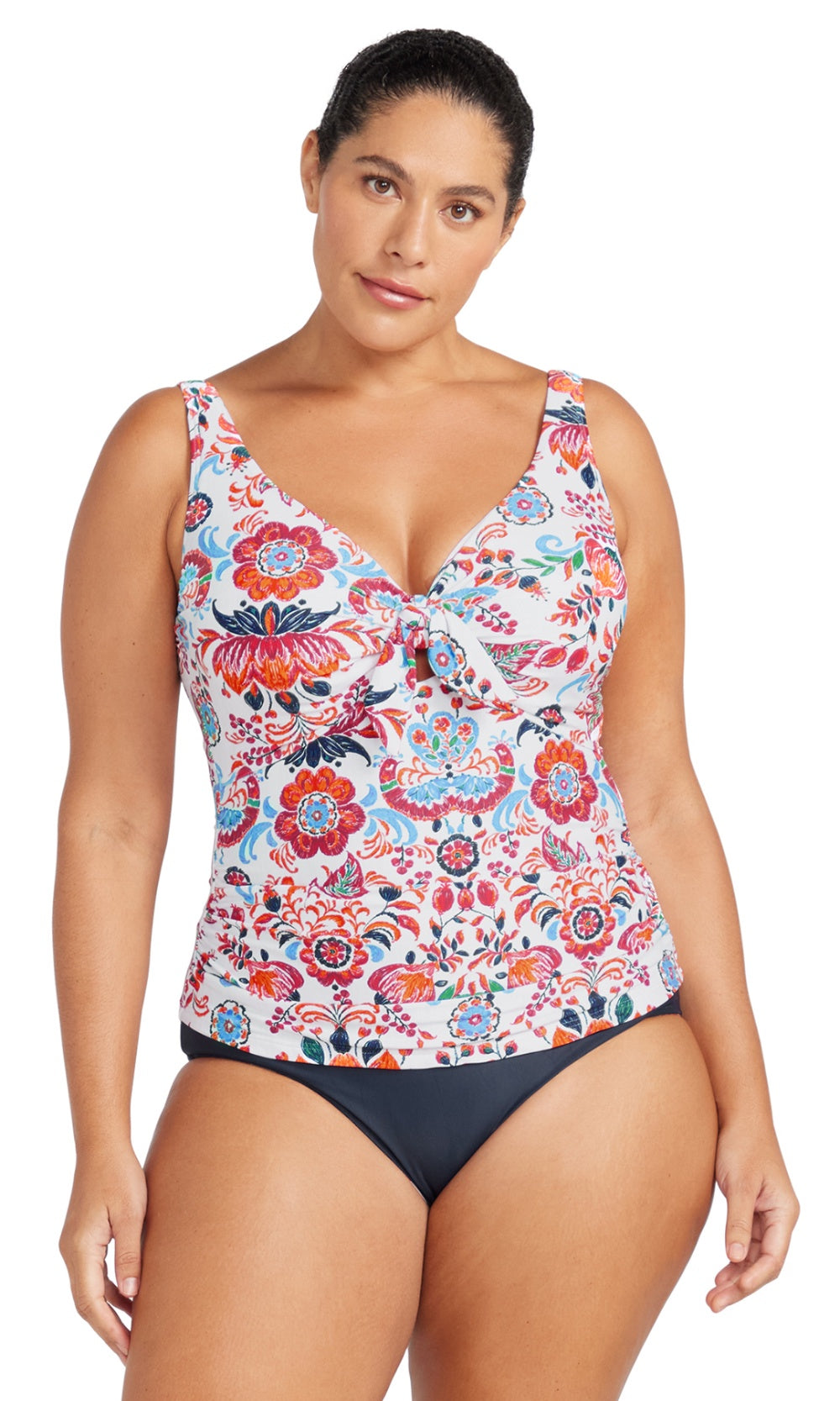 Artesands fits your curves. Make a curve statement in our Artesands Cezanne plus size tankini top, the most flattering swimsuit shape EVER. Our Cezanne tankini top shape has a mock knot tie at the front that covers a full internal cup support system. Our Cezanne shape is an underwire style with full foam cups that create great bust shape for a D cup to E cup. But it is the peep hole on this style that creates the most amazing figure flattering illusion. The peephole creates a body enhancing hourglass shape and when paired back with our full body 360 degree powermesh and our front panel ruching this style is truly flattering. Artesands curve fit and plus size tankini tops are long line to avoid the fabric riding up when you're in the water.