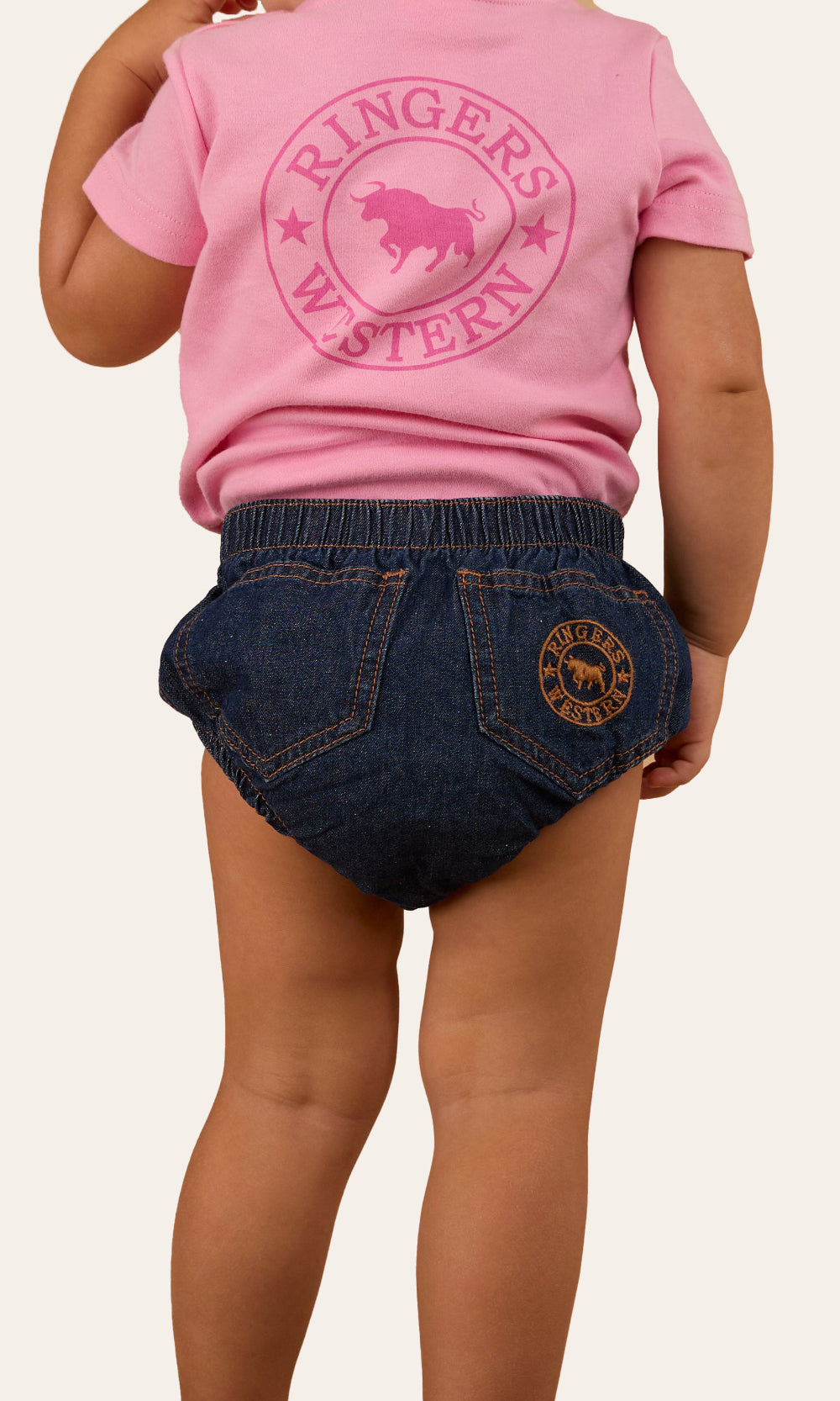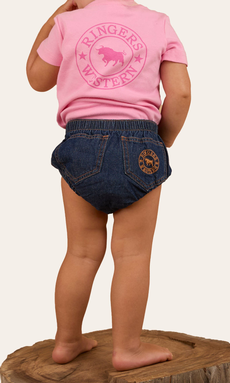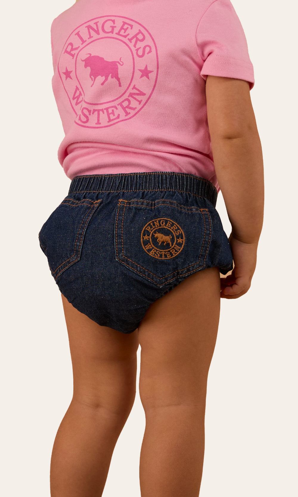 The Mila Nappy Bloomer has got cuteness covered - created from 100% cotton denim, the Mila Bloomer's are super soft and breathable and will keep bub smiling all day long. The relaxed fit style features an elasticated waistband and leg hems for a snug and comfortable fit, whilst making those unexpected nappy changes a breeze. Signature Ringers Western embroidery features on the back pockets adding an extra touch of Ringer's flair.