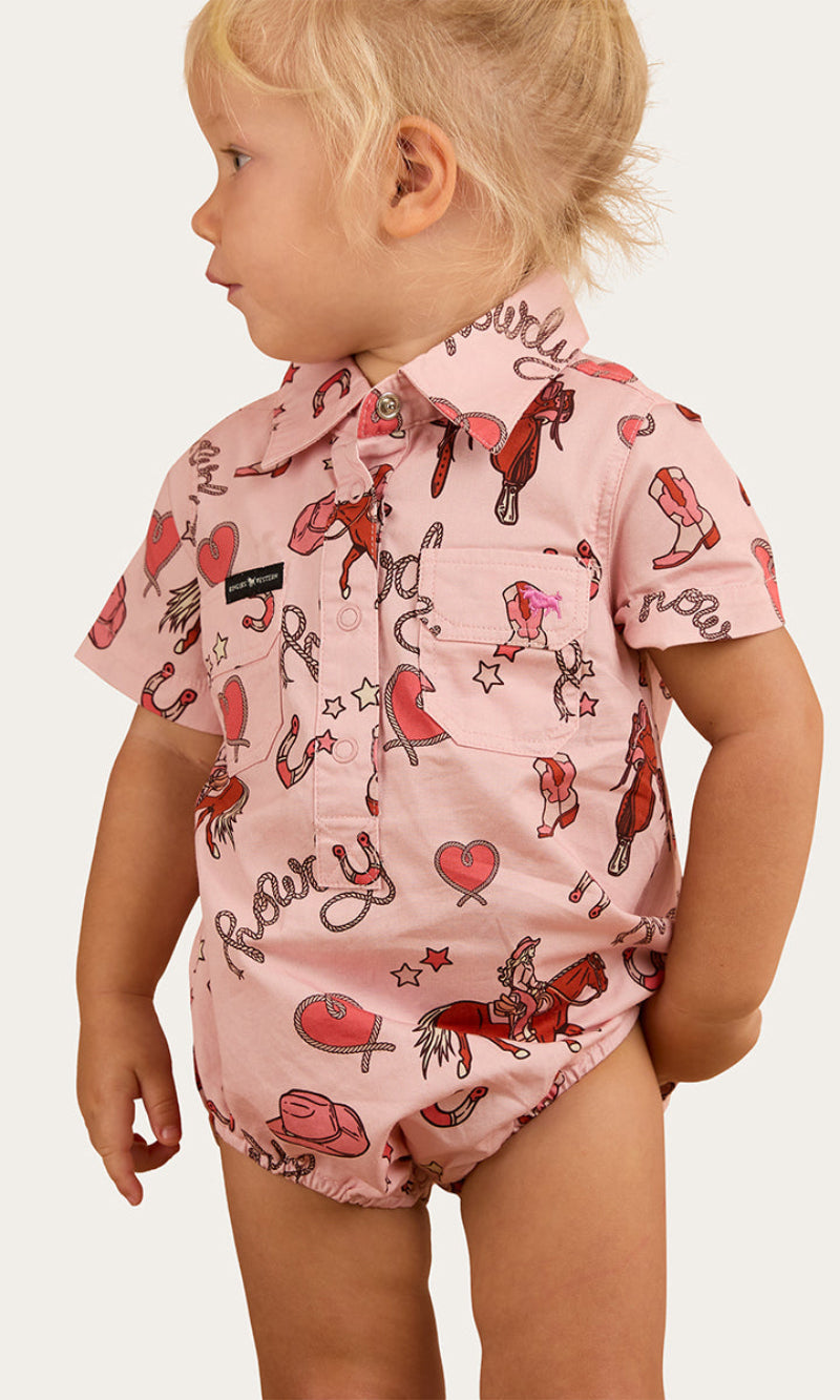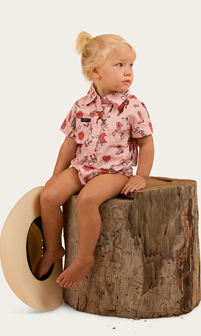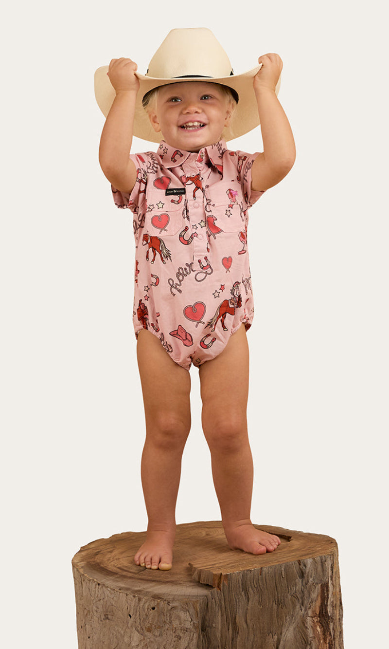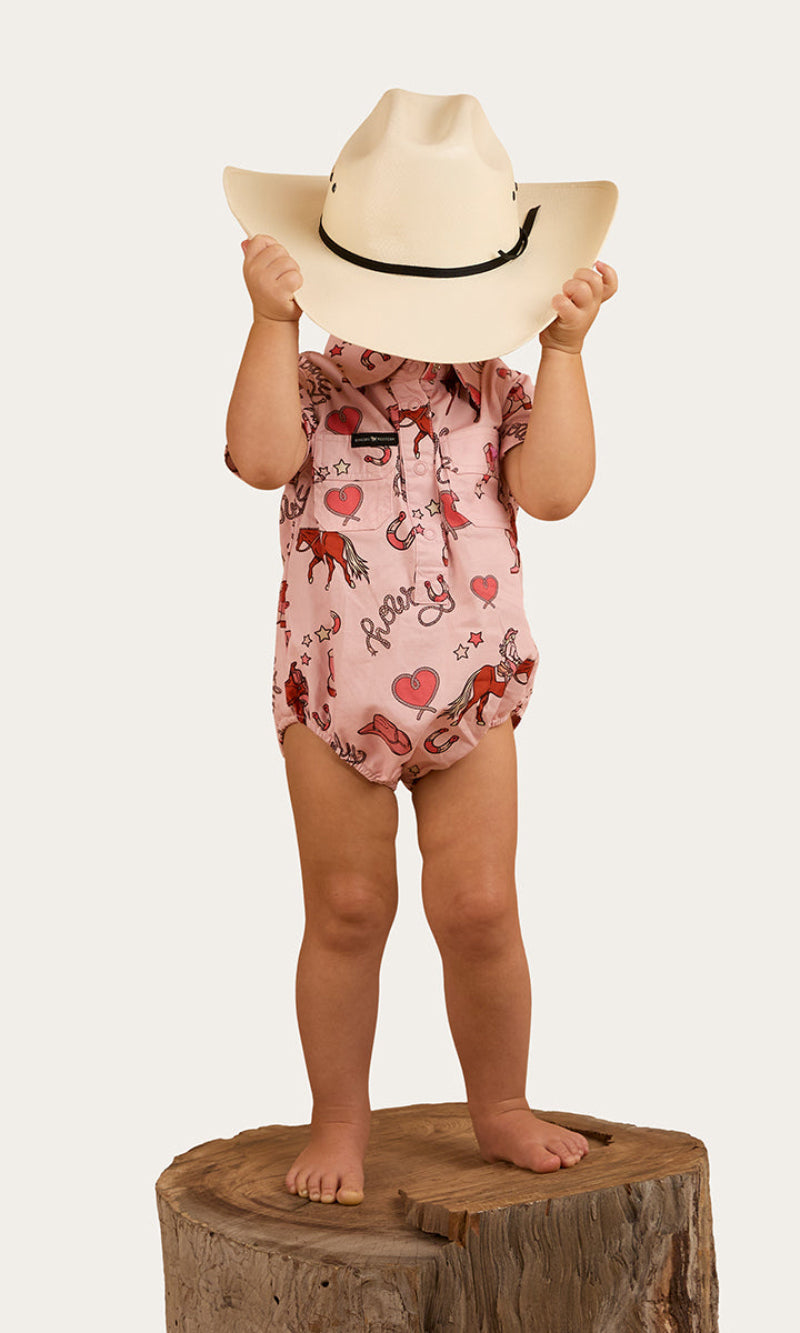 Introducing the Mini Cowgirl Babies Short Sleeve Work Shirt Romper. This charming romper has been designed with the youngest cowgirl's in mind, featuring an eye catching signature Ringers Western yardage print that is sure to delight the youngest country fans.