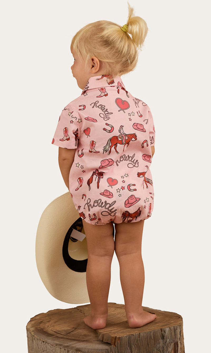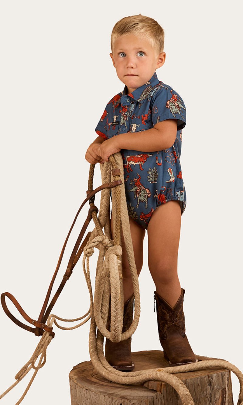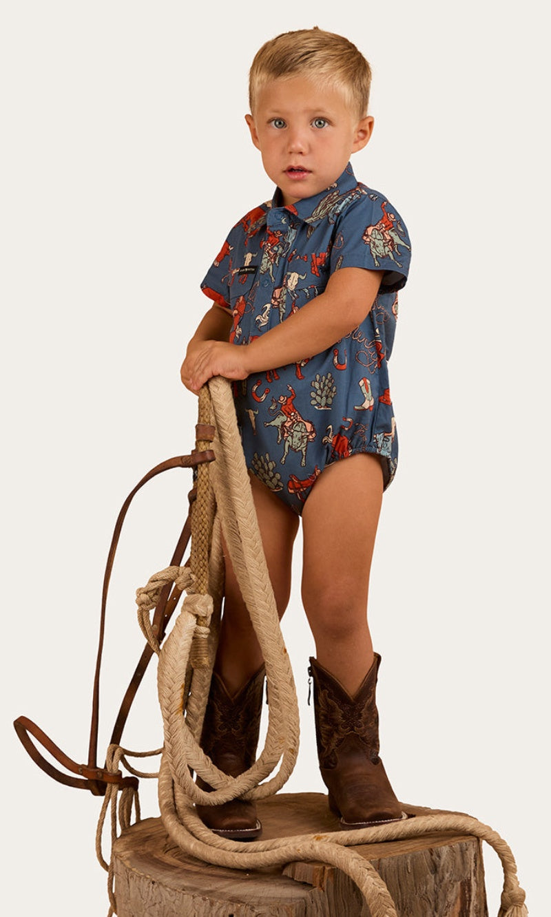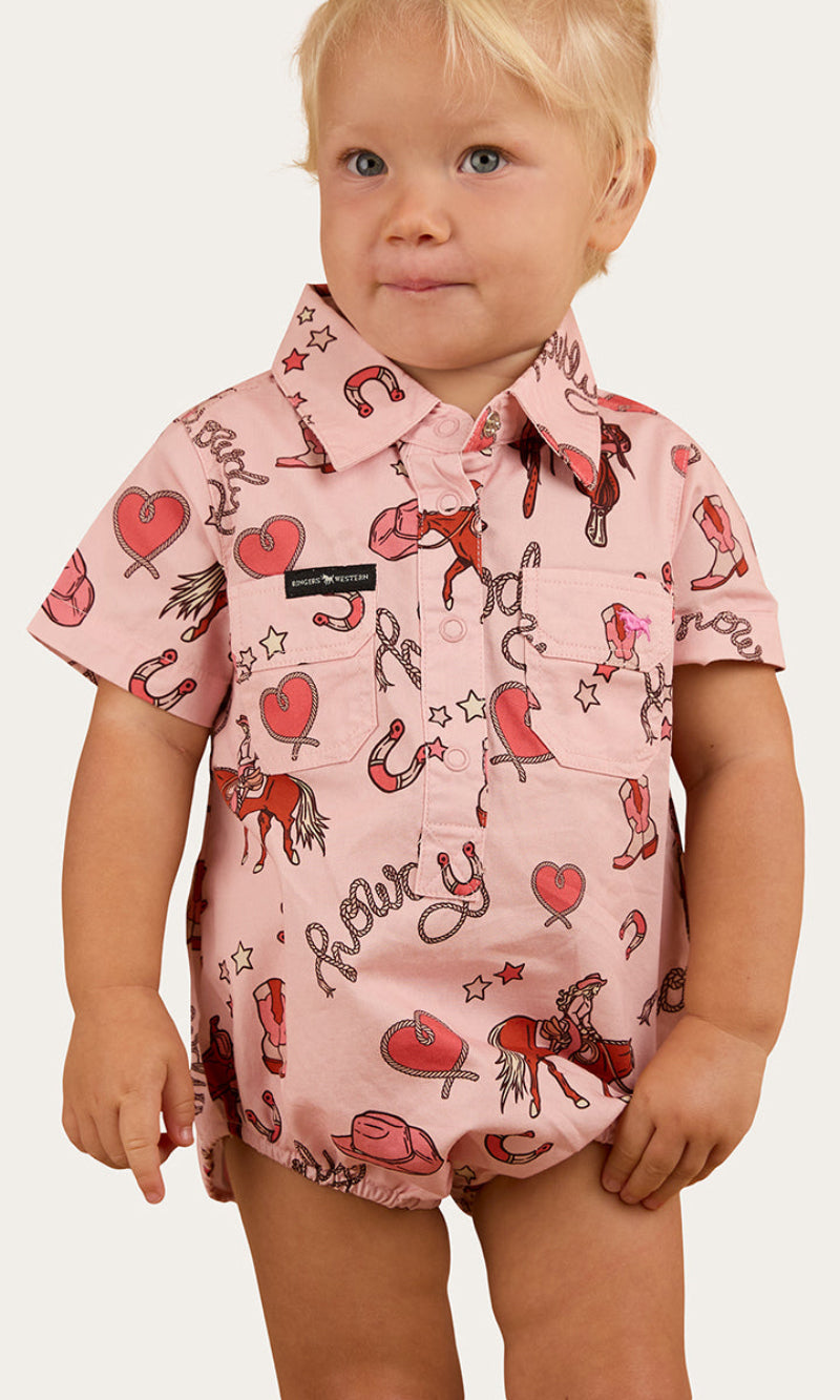 Introducing the Mini Cowgirl Babies Short Sleeve Work Shirt Romper. This charming romper has been designed with the youngest cowgirl's in mind, featuring an eye catching signature Ringers Western yardage print that is sure to delight the youngest country fans.