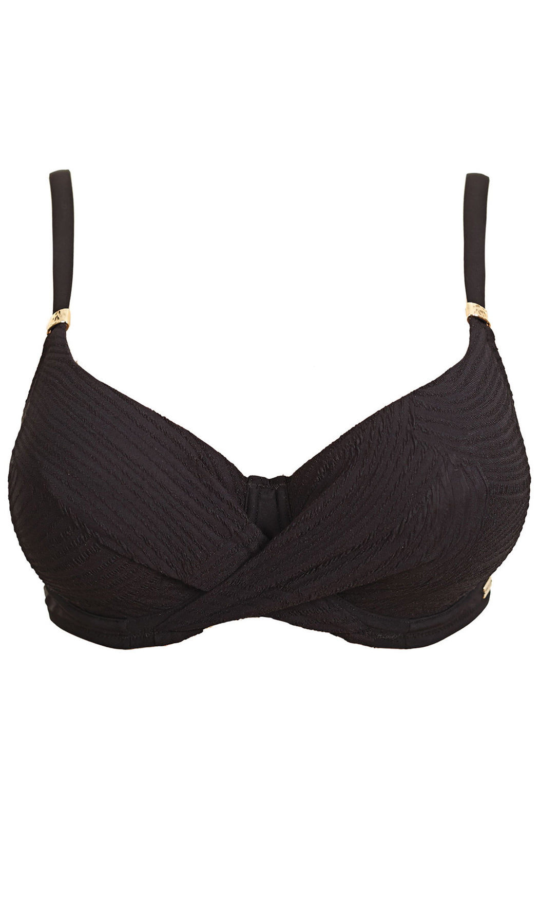 *Flattering wrap over front detail with concealed side sling for projection * Conceled underwire for support *Powernet lined back wing for support and anchorage *Concealed stitching for a clean, *Fixed fully adjustable shoulder straps *Metallic gold slider detail *Gold Fantasie branded tab