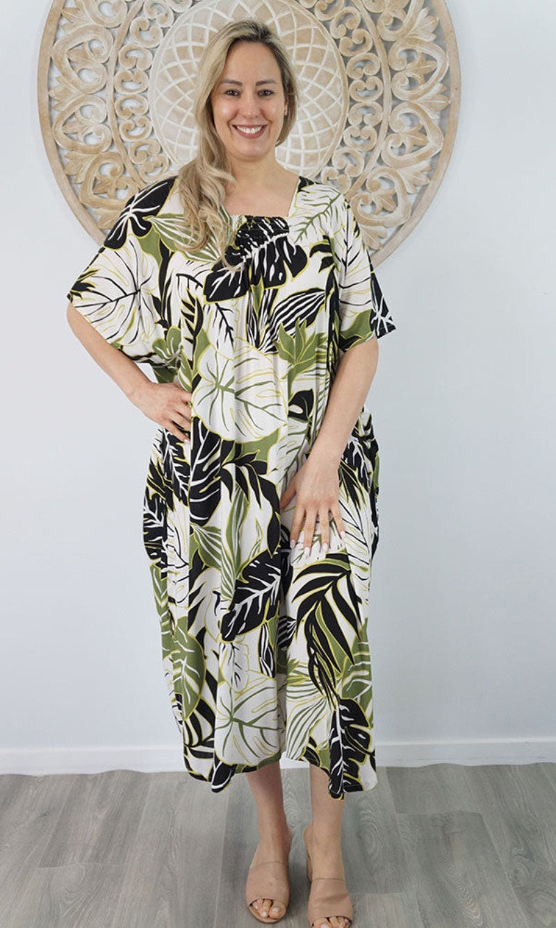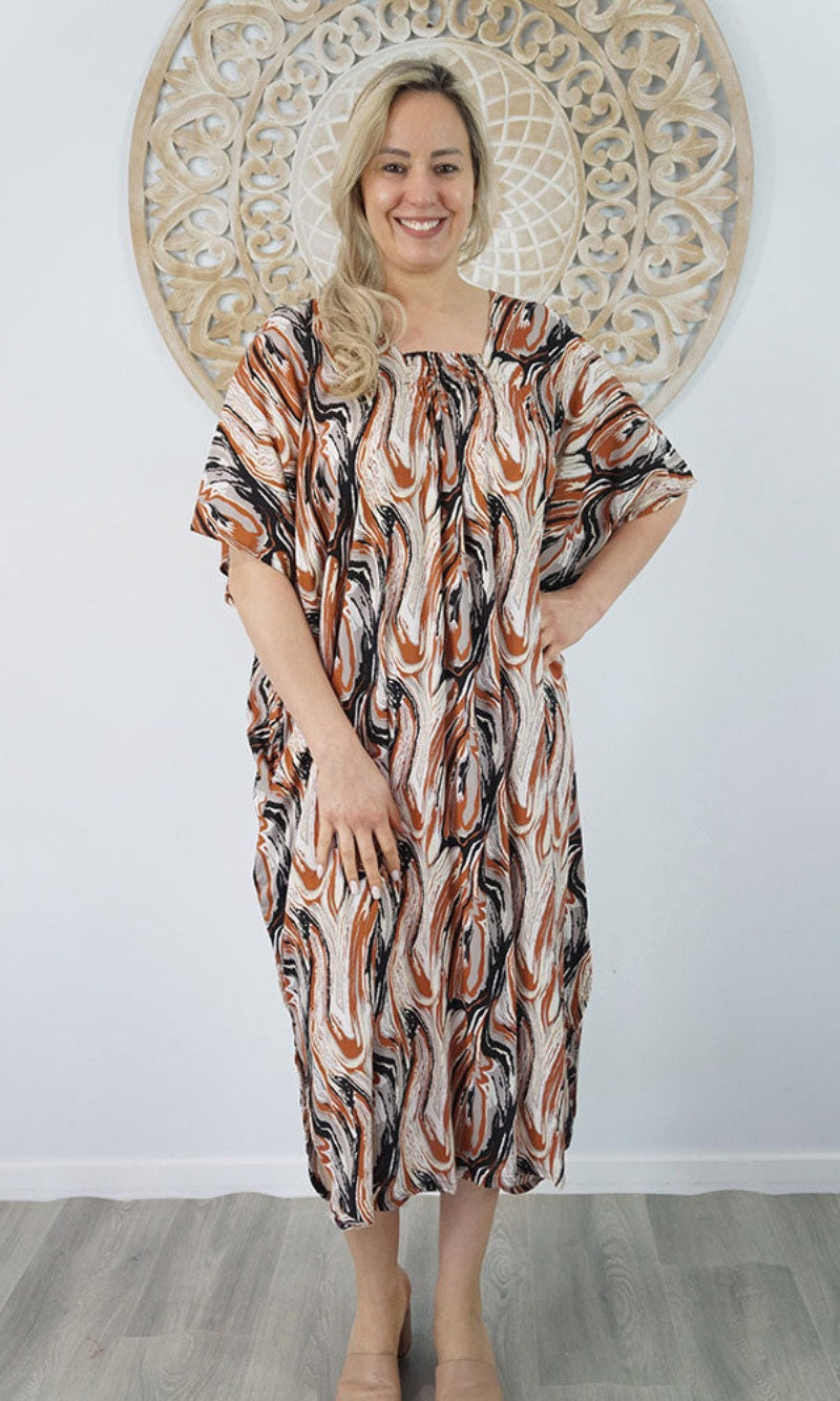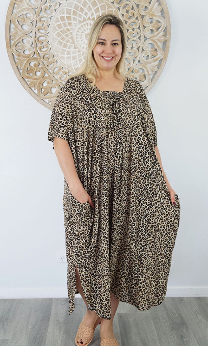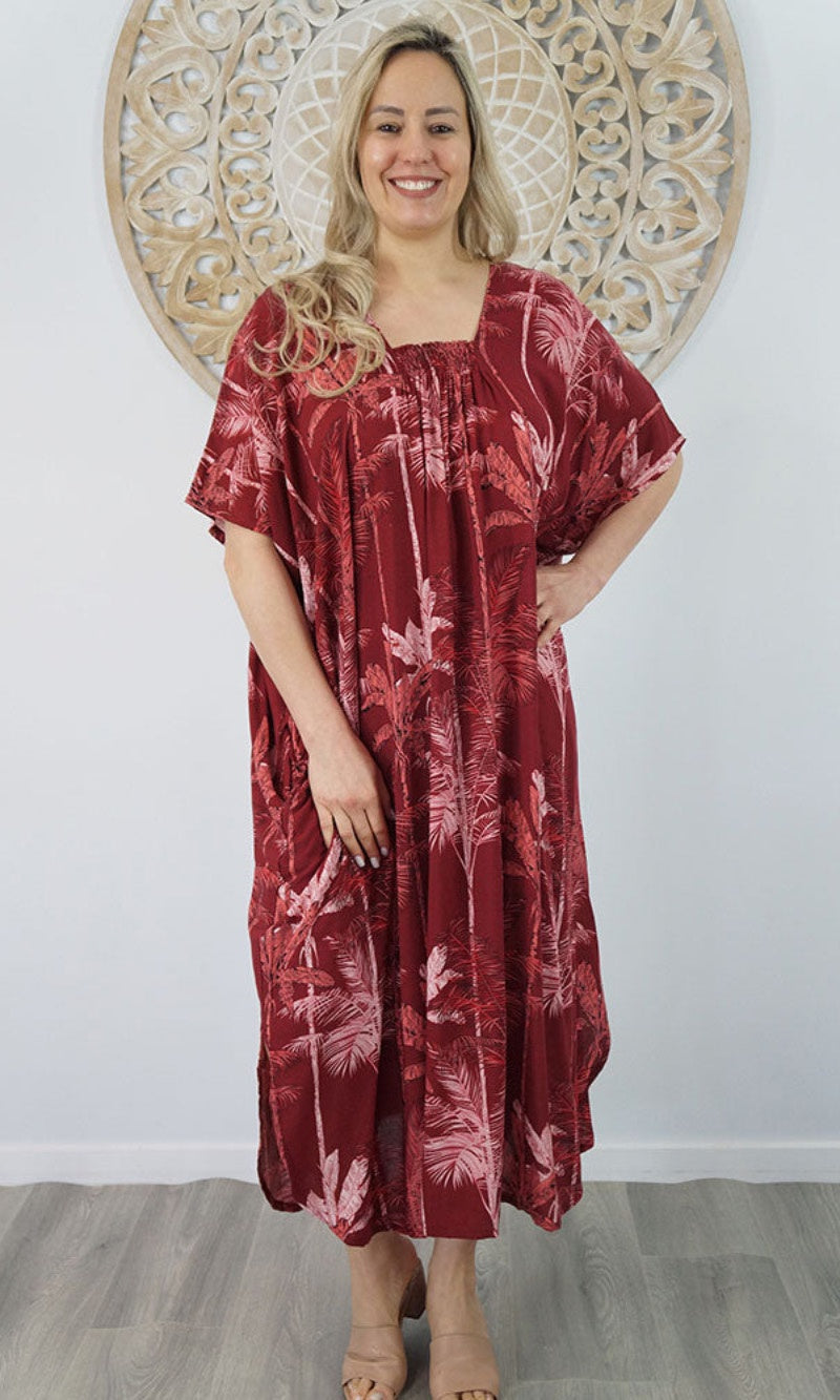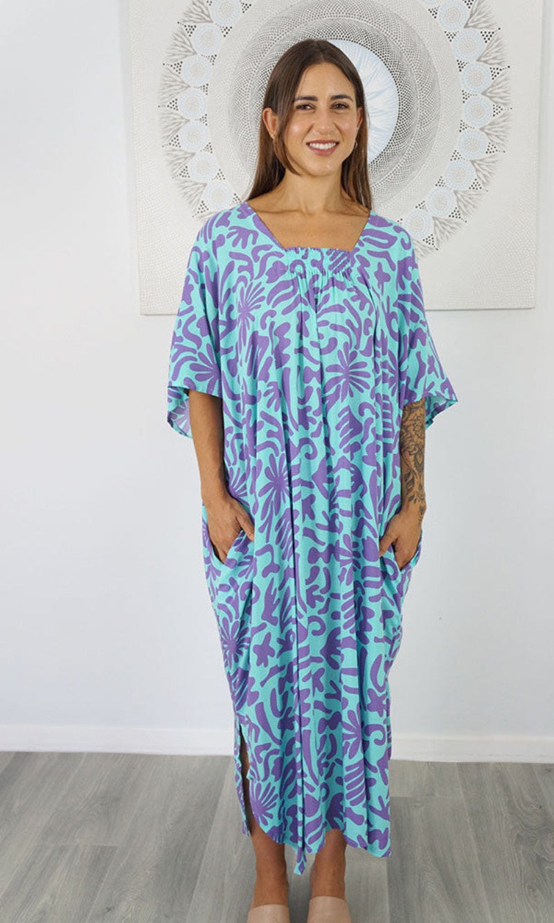 Introducing the Bermuda Kaftan in our "Kerala" print. This is a long, plus size kaftan featuring front shirring, side pockets and splits.