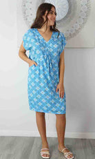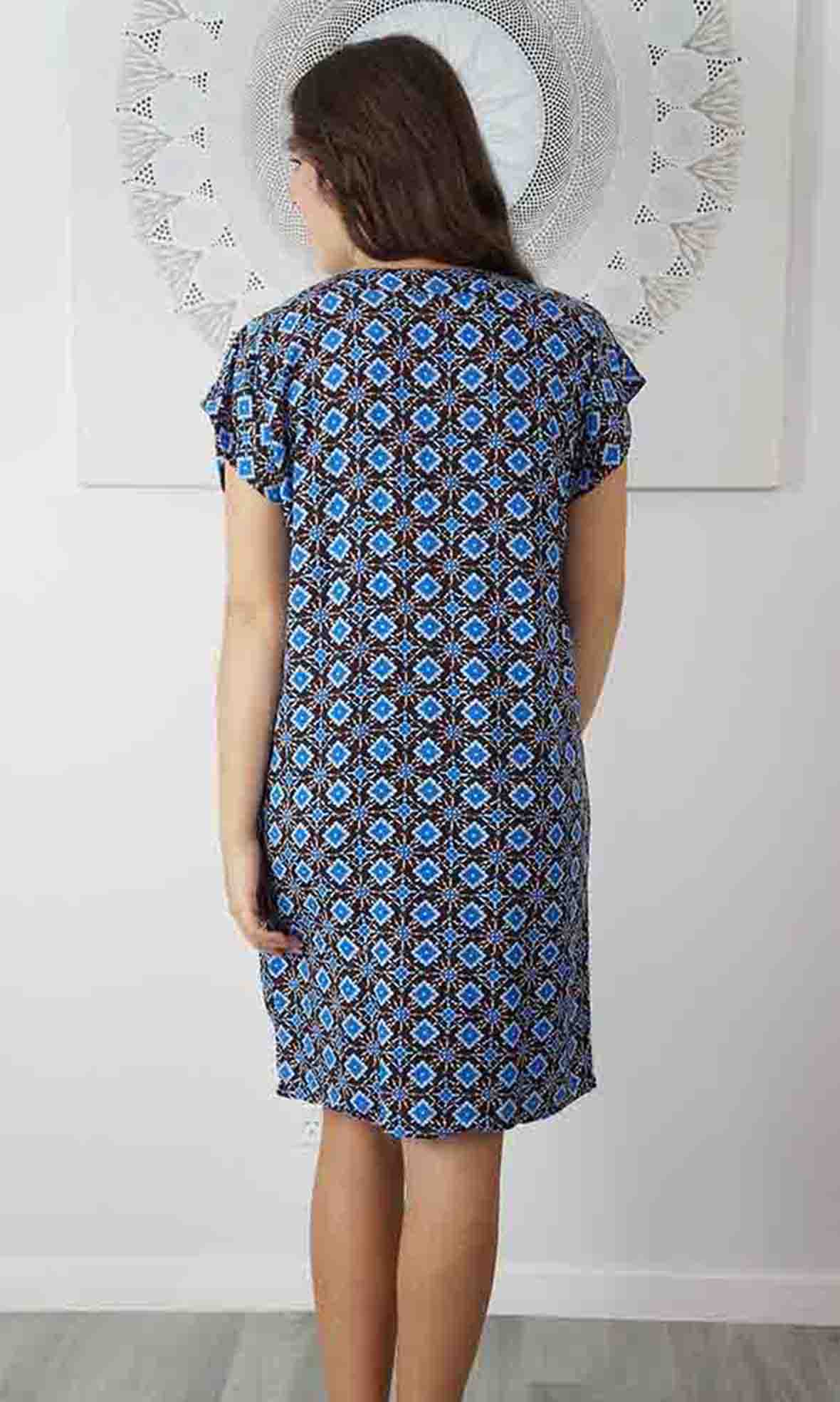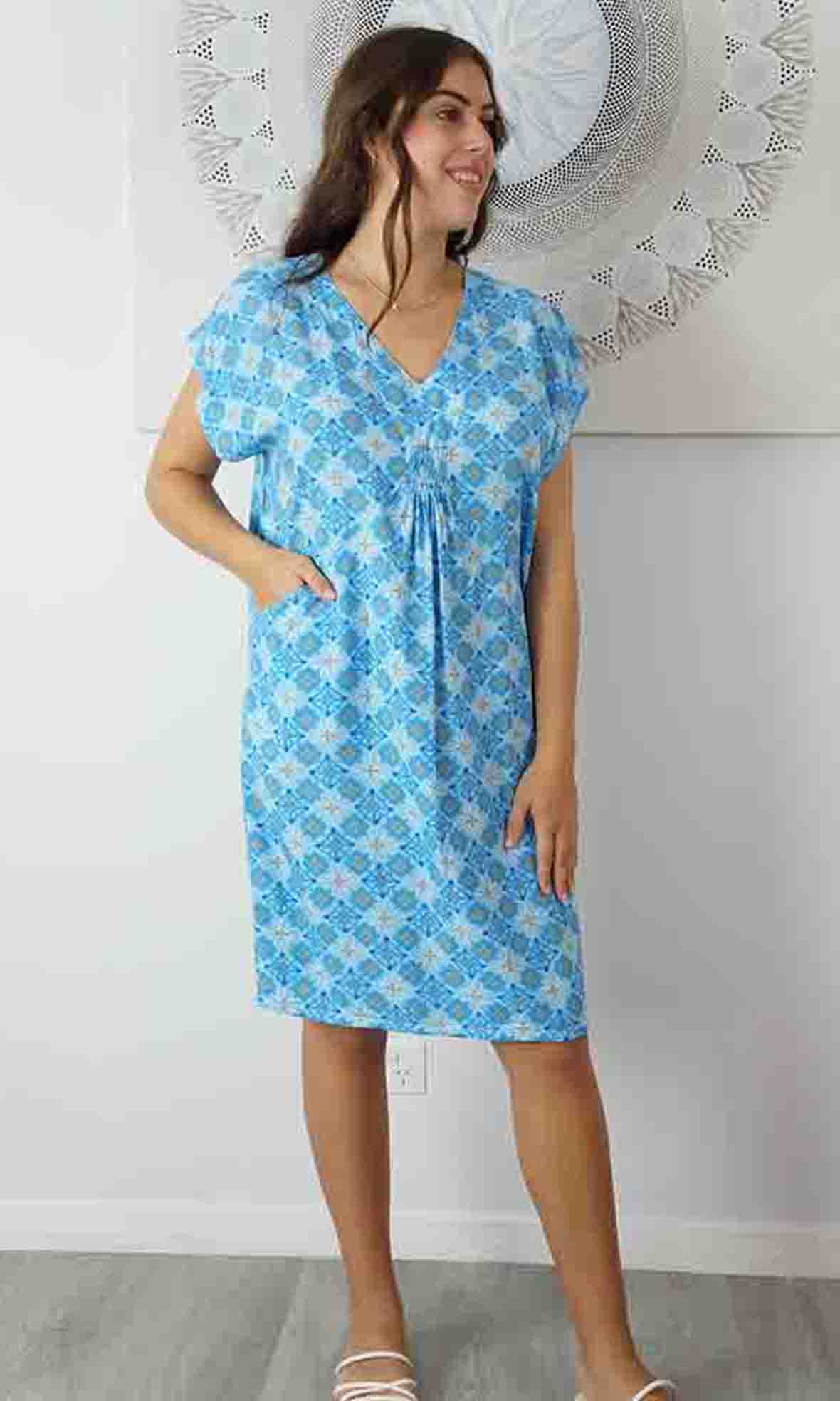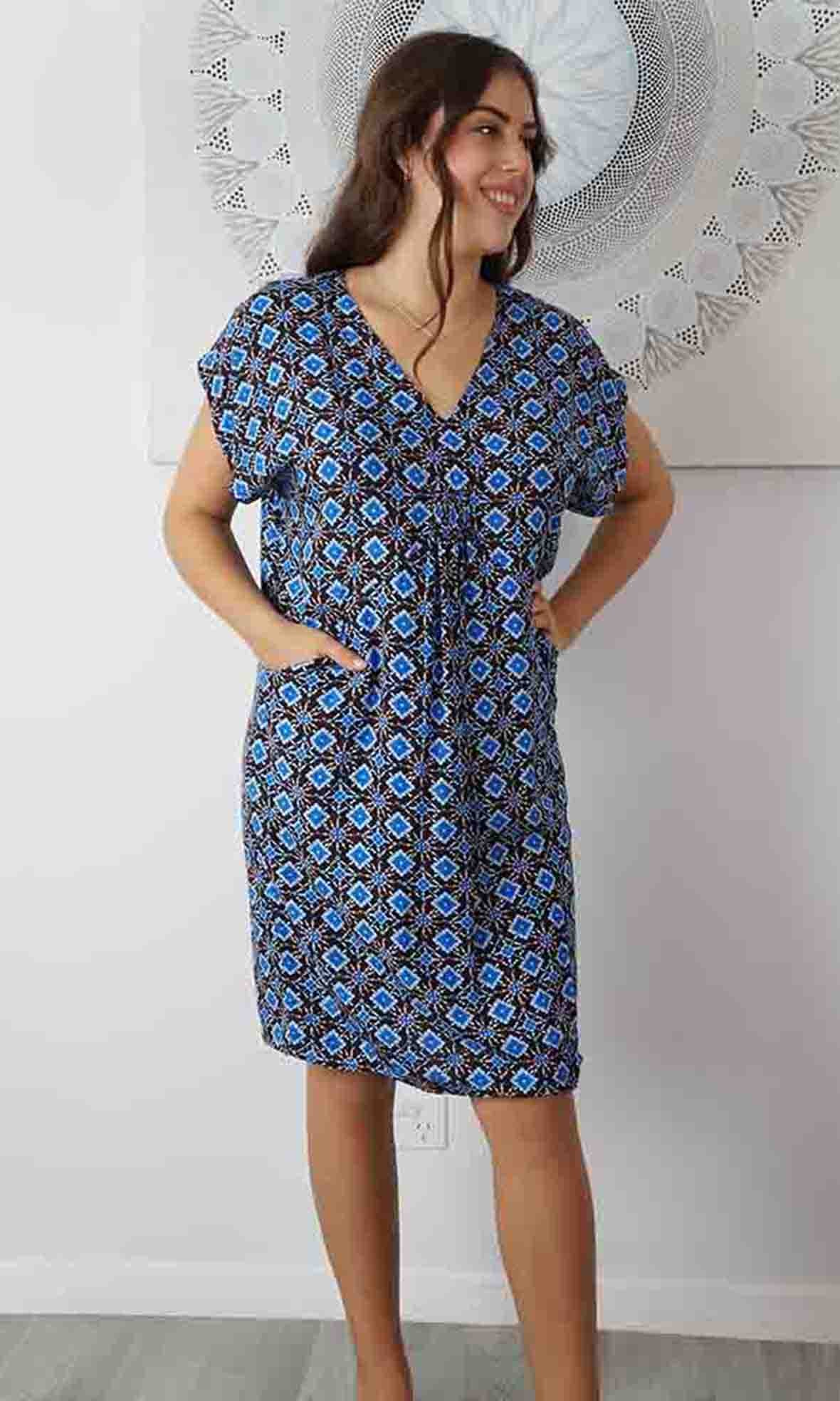The Cruiser Dress is simple and comfortable for those warm summer days. This rayon garment is lightweight and falls beautifully on ladies of any size. Features capped sleeves, v-neckline with a pleated detail & pockets.