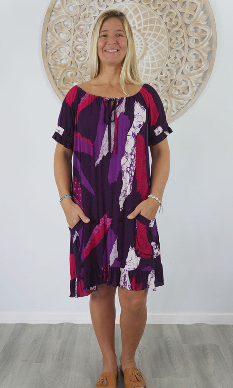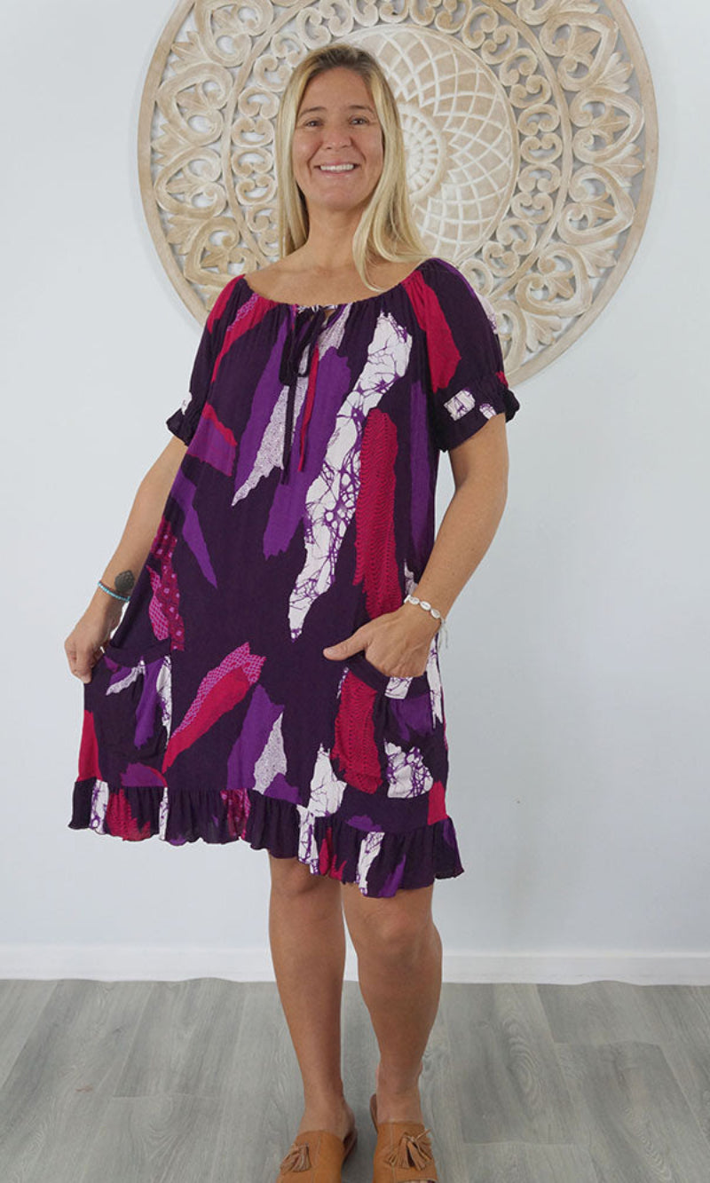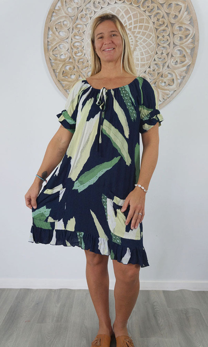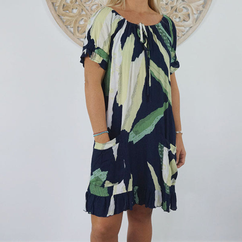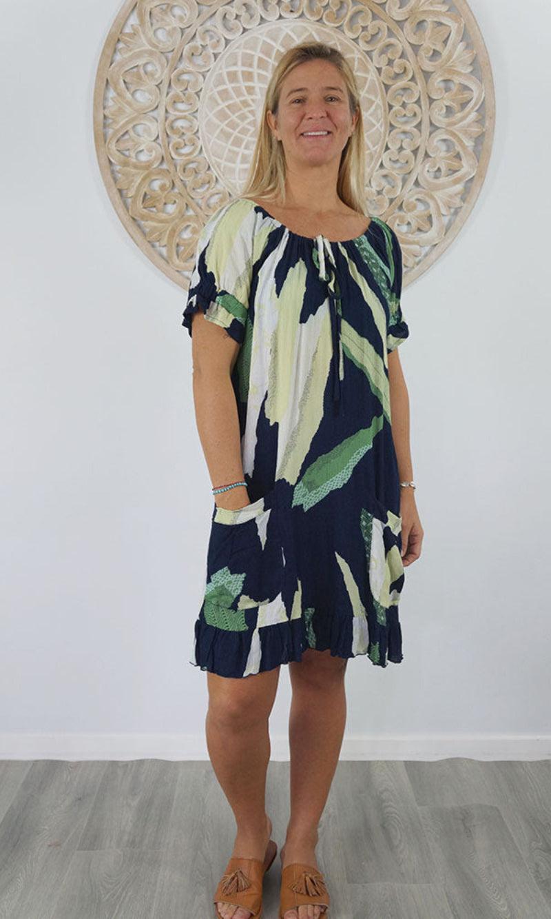Made from crinkle rayon, the cuba dress features elastic around the back neck line with a drawstring tie at the front, frill detail on sleeves and hem line with pockets on each side.