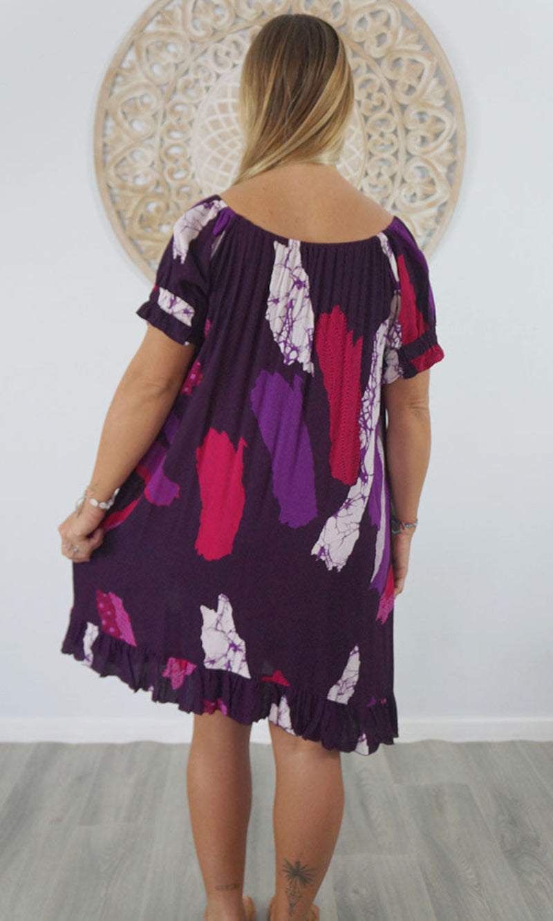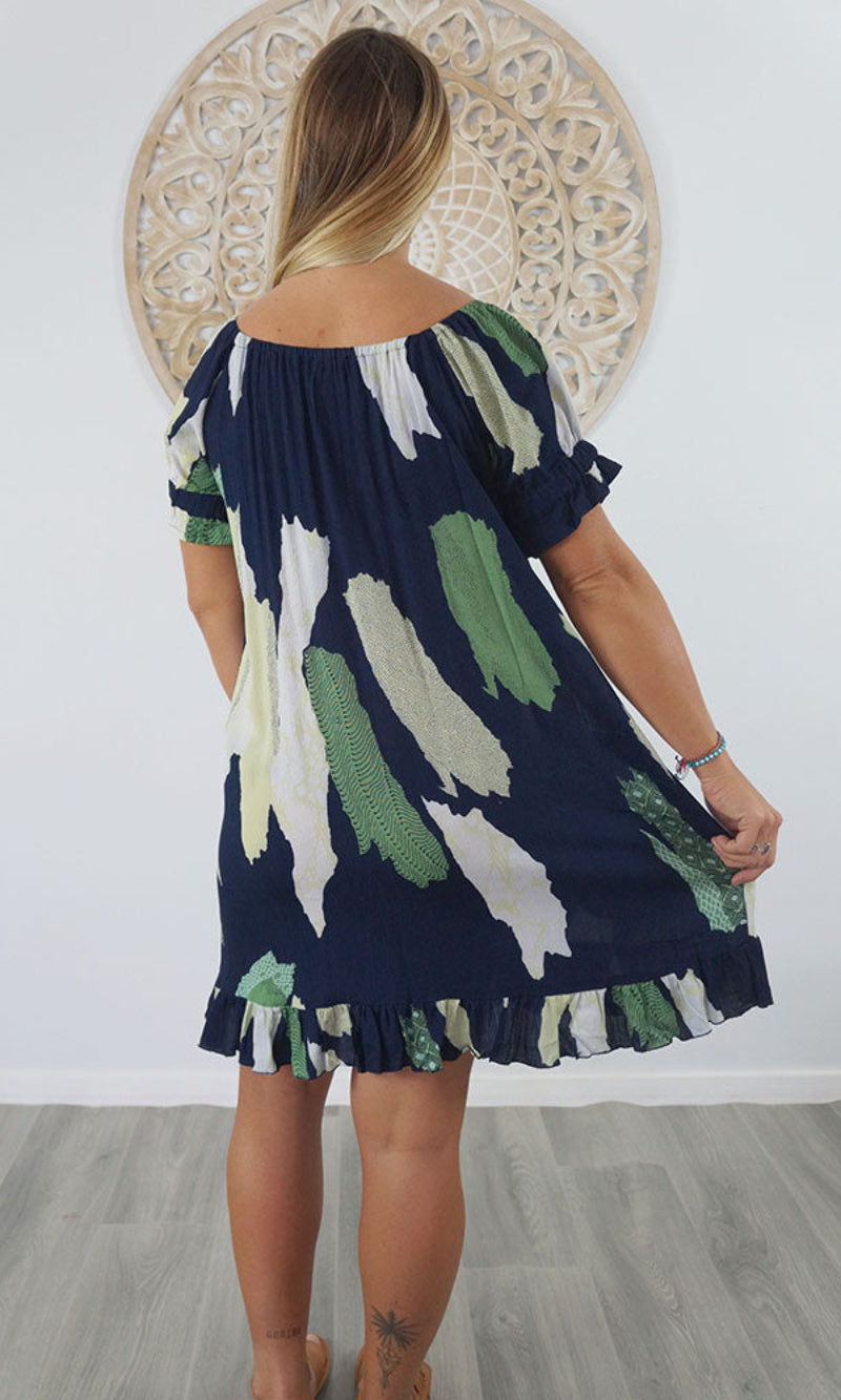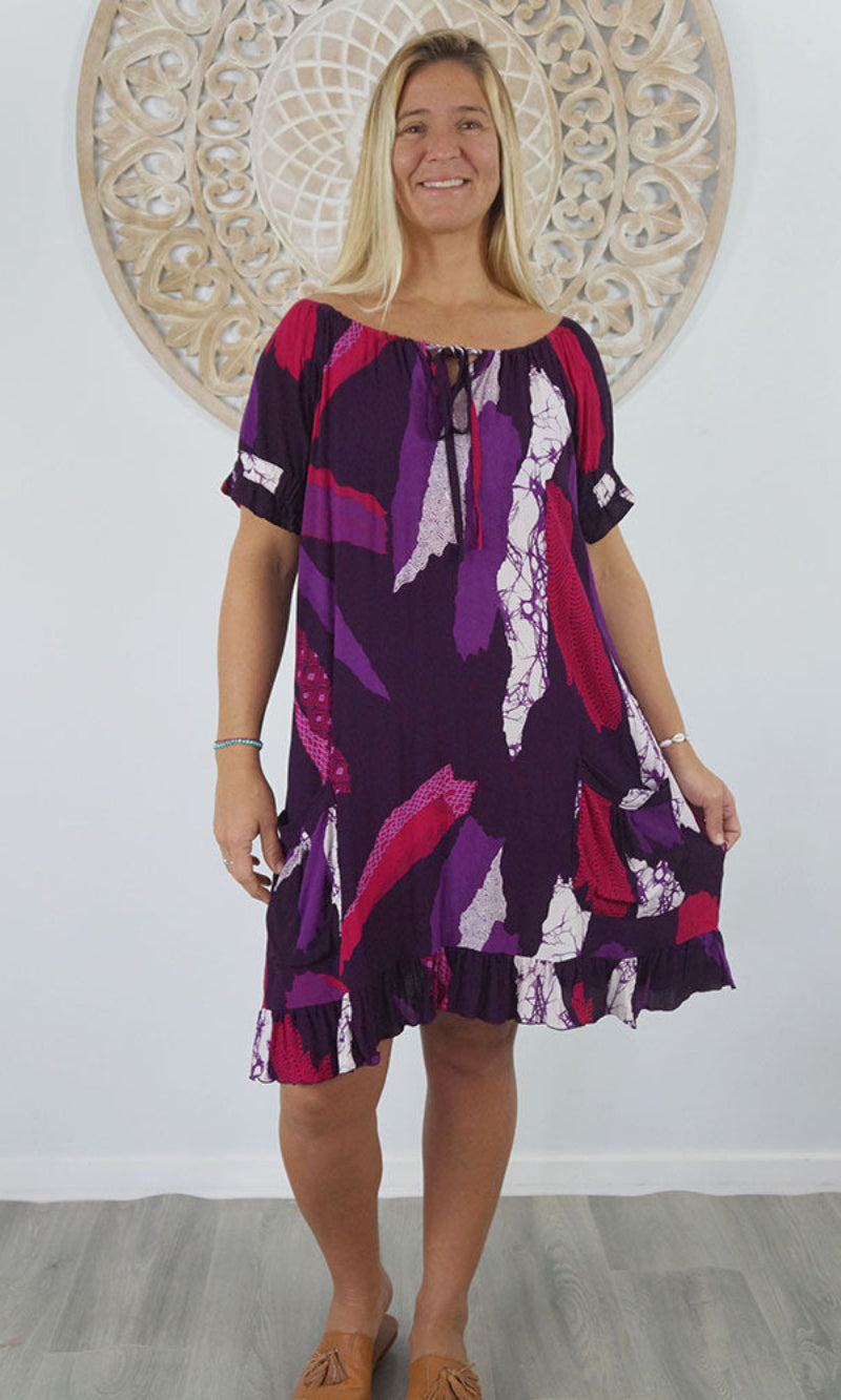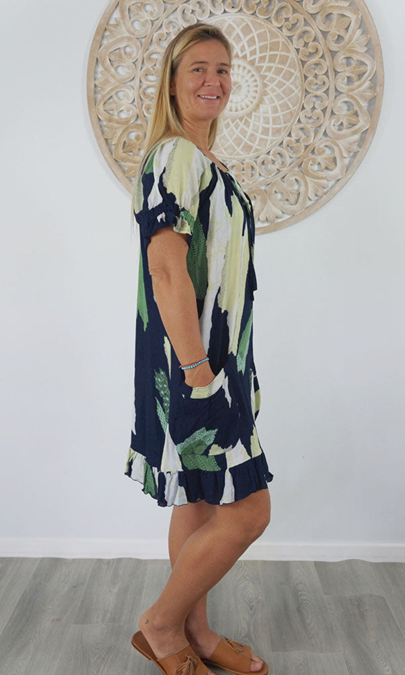 Made from crinkle rayon, the cuba dress features elastic around the back neck line with a drawstring tie at the front, frill detail on sleeves and hem line with pockets on each side.