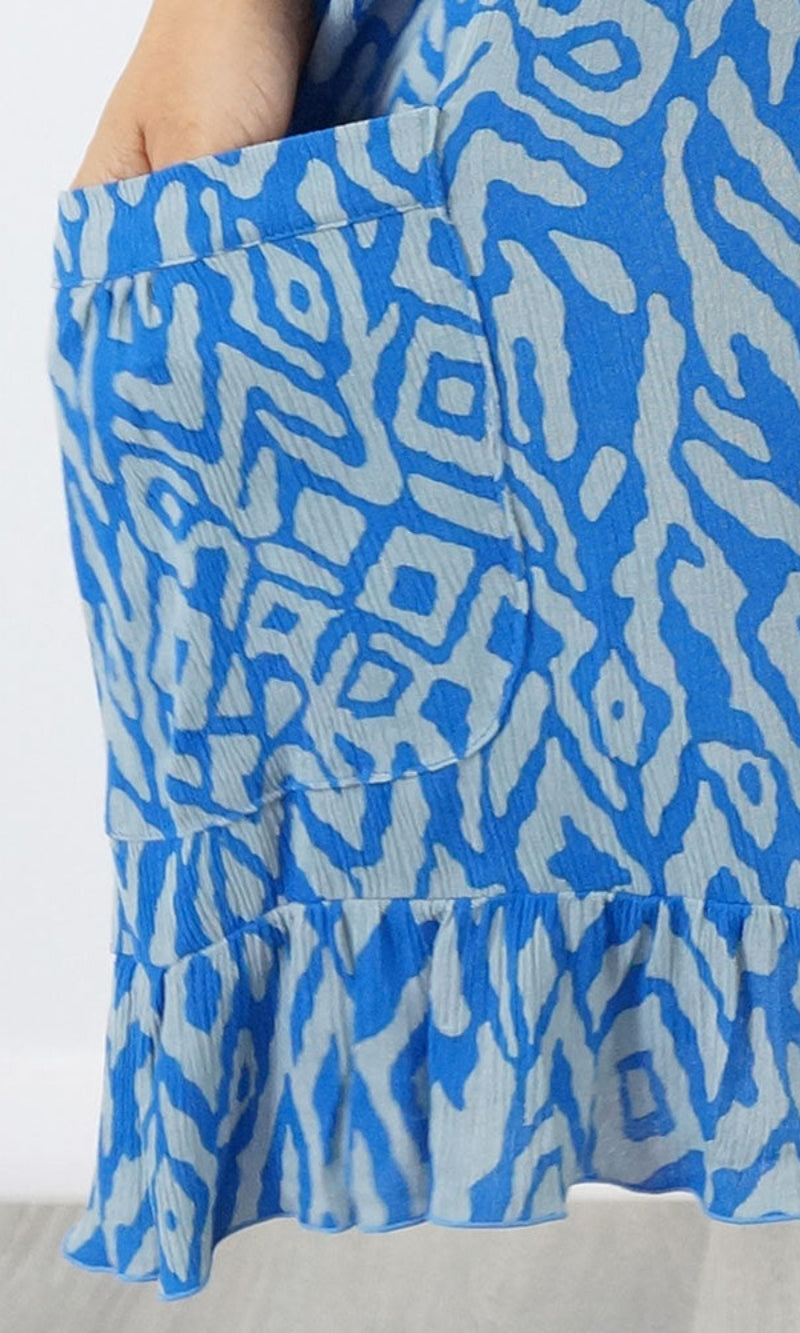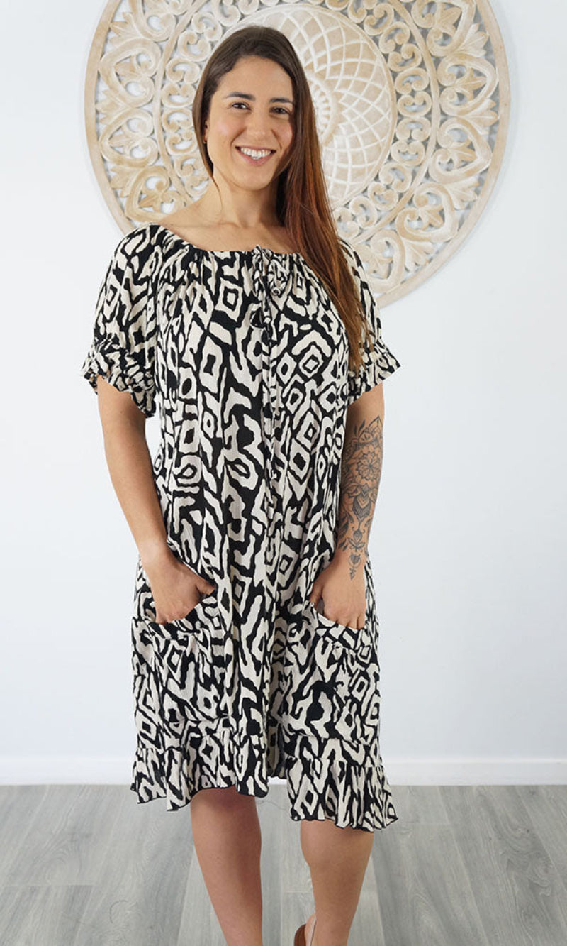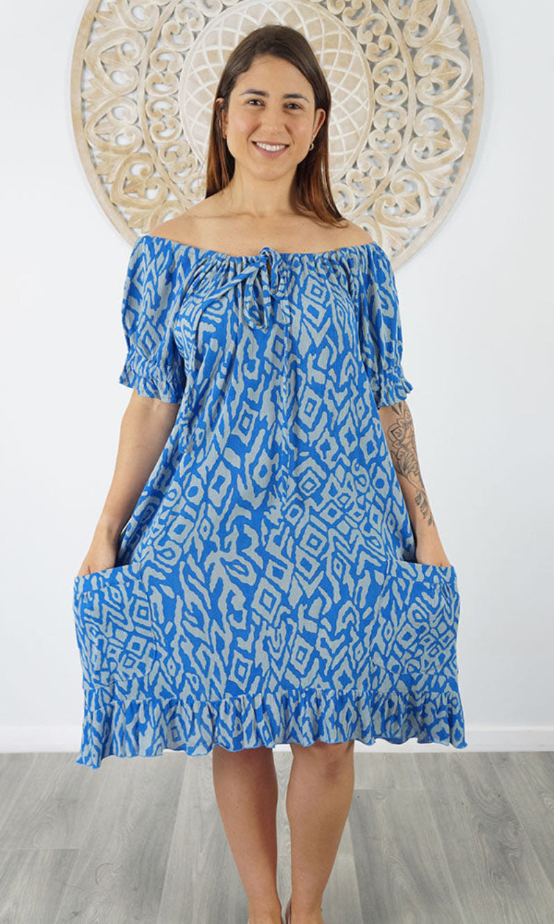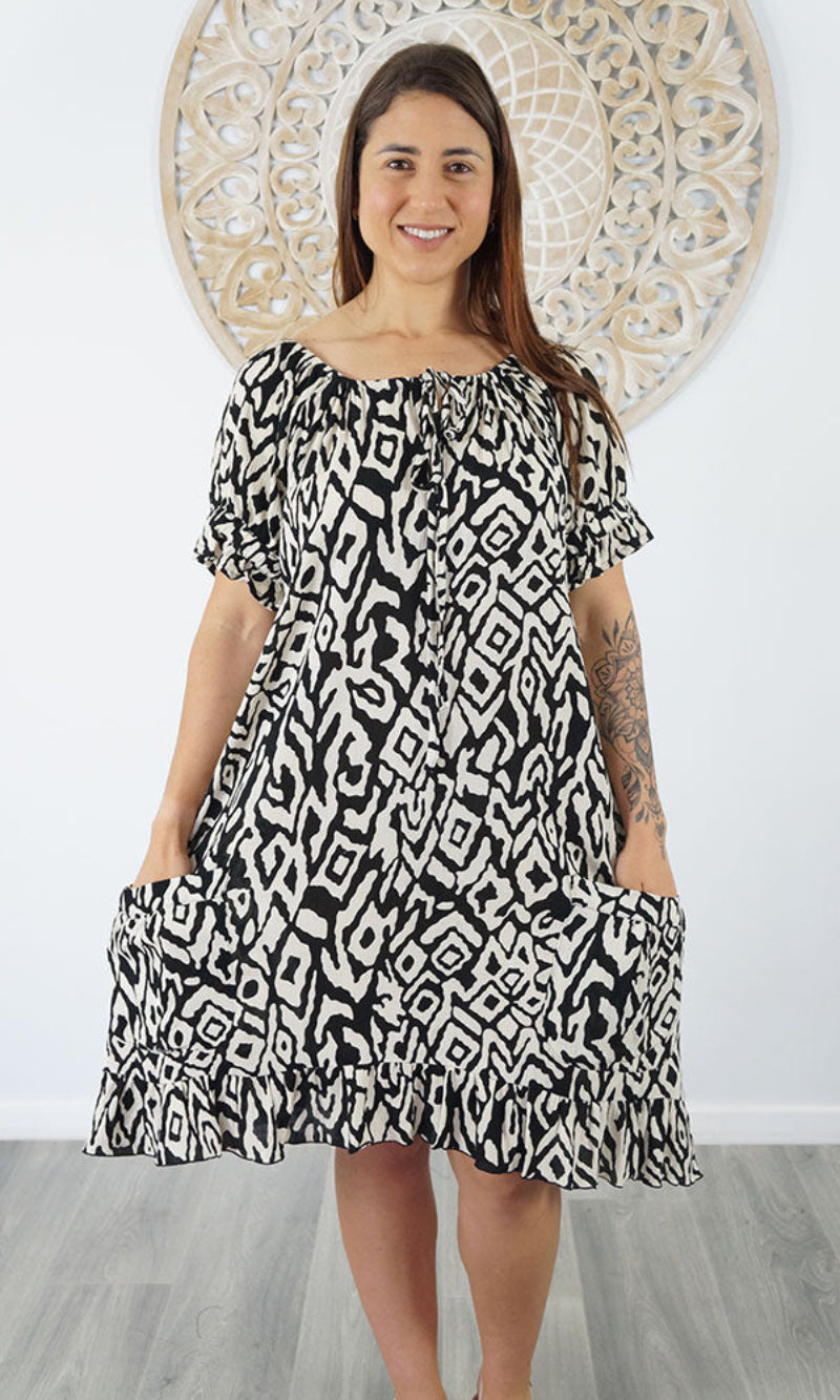 Made from crinkle rayon, the cuba dress features elastic around the back neck line with a drawstring tie at the front, frill detail on sleeves and hem line with pockets on each side.