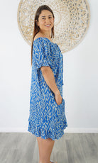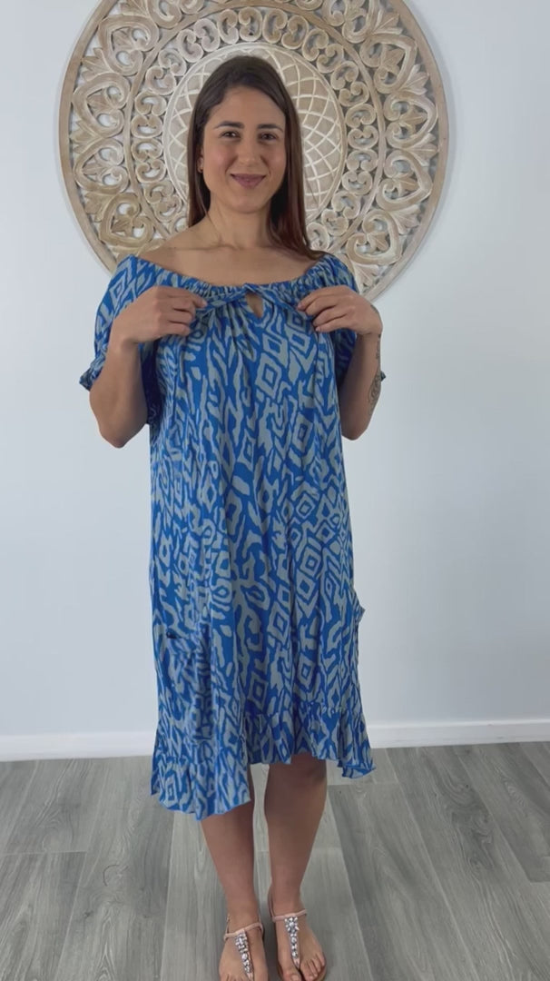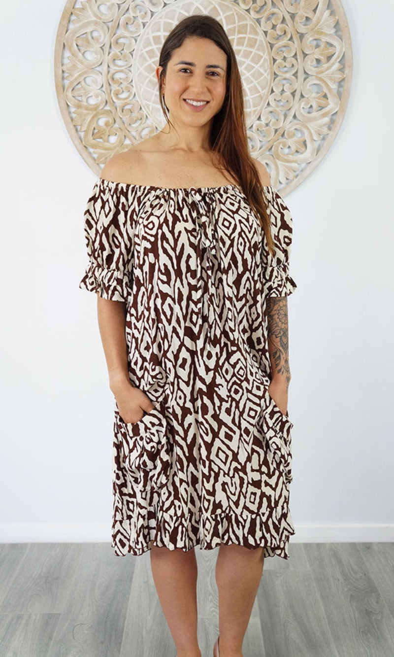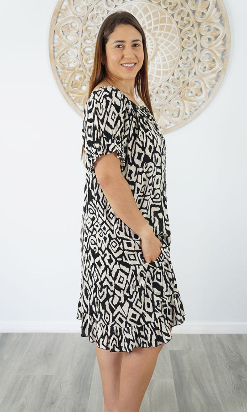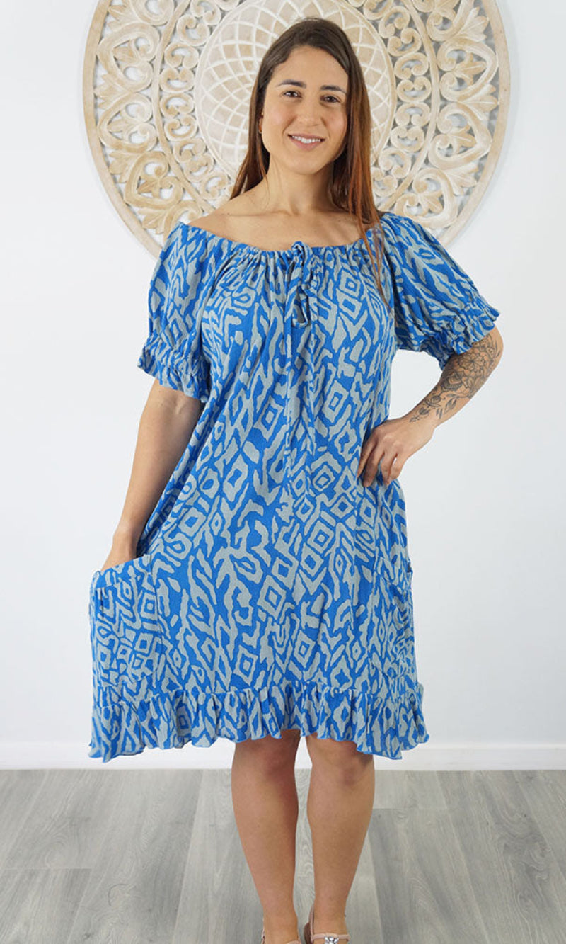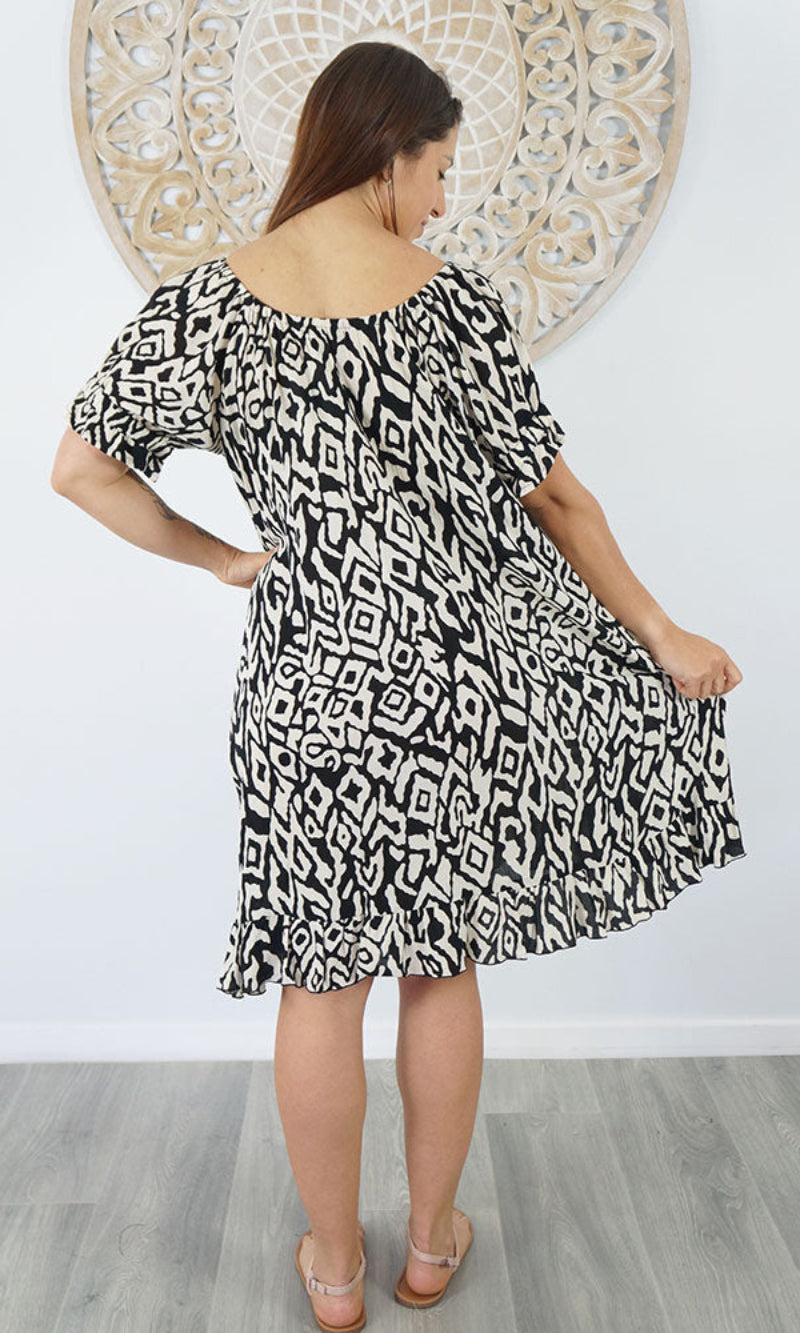 Made from crinkle rayon, the cuba dress features elastic around the back neck line with a drawstring tie at the front, frill detail on sleeves and hem line with pockets on each side.