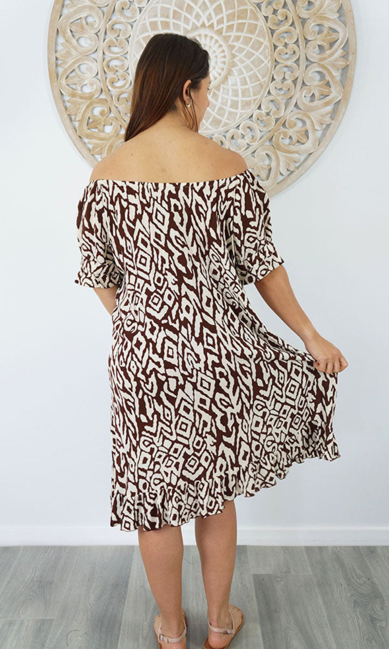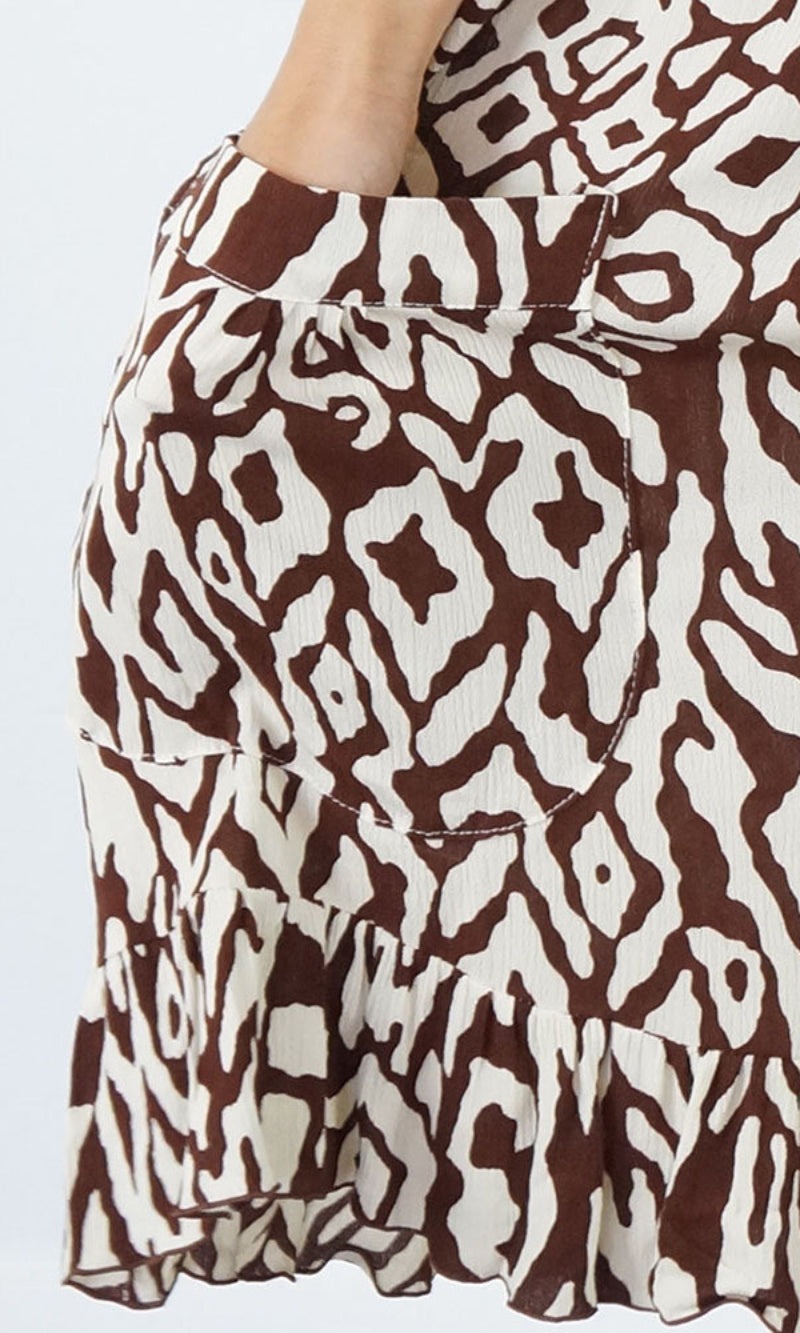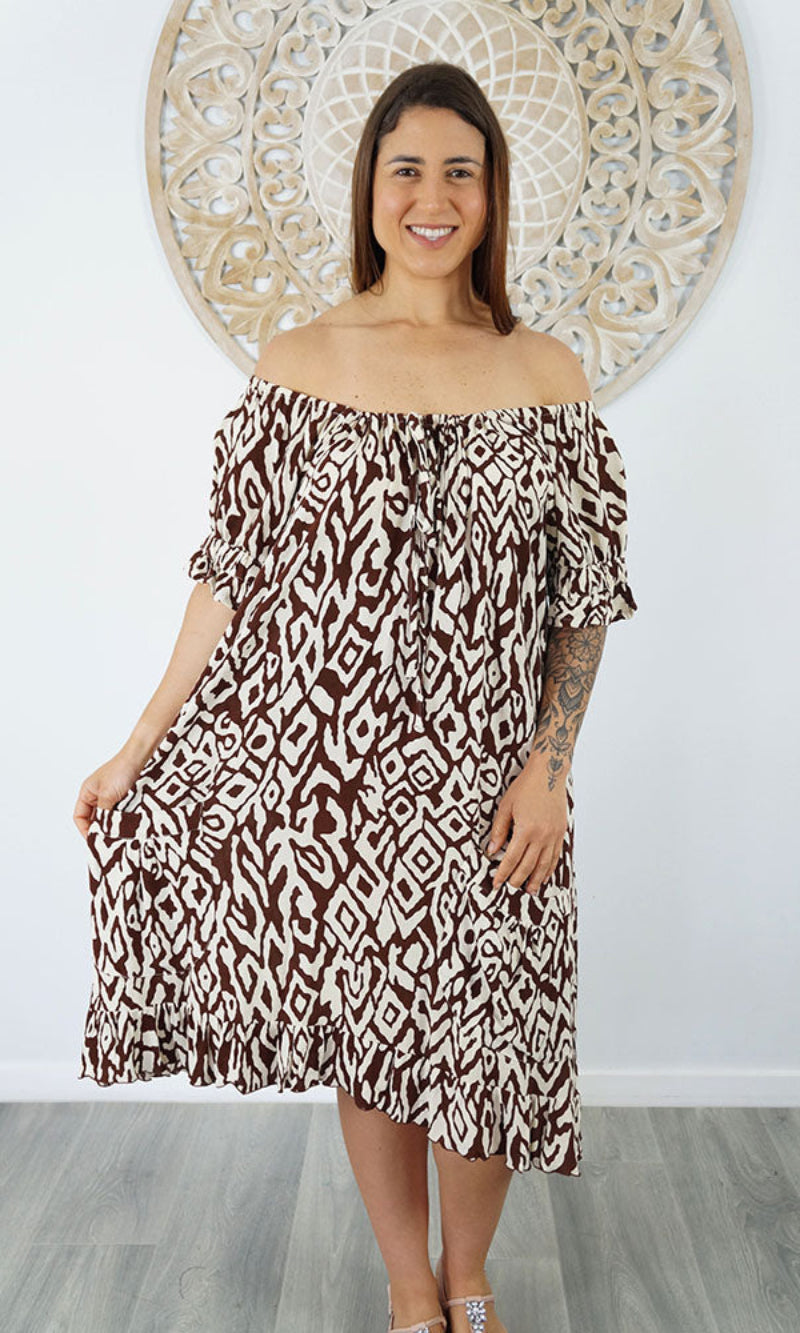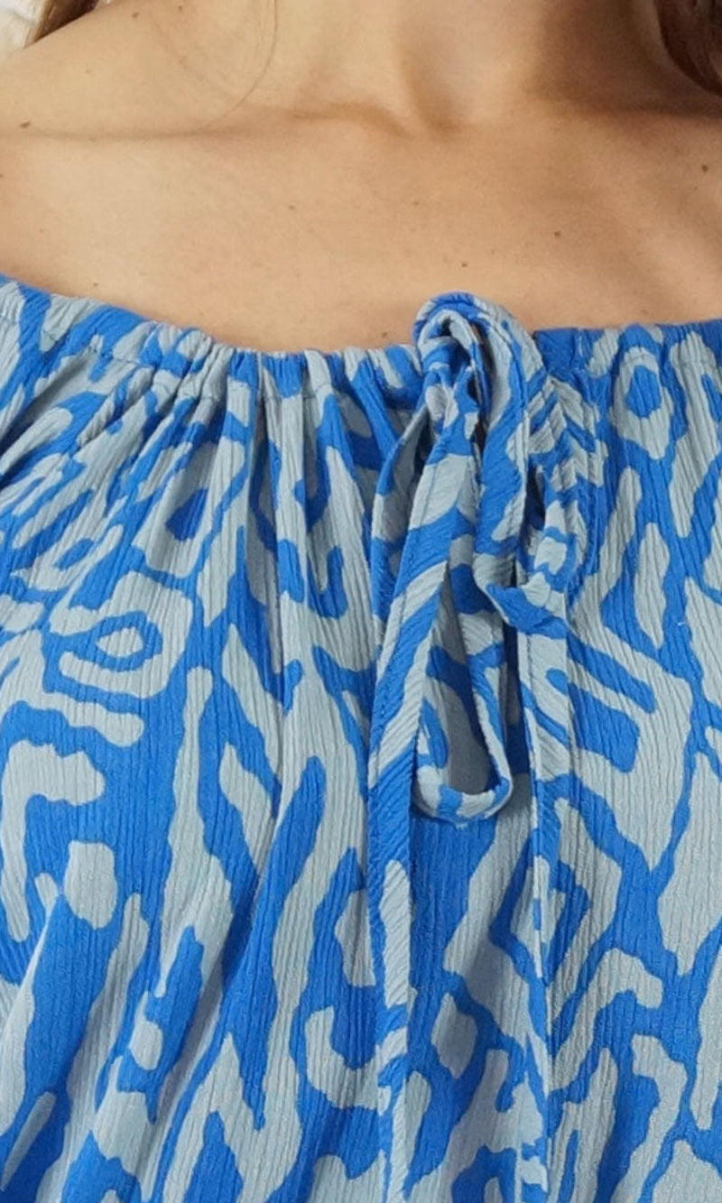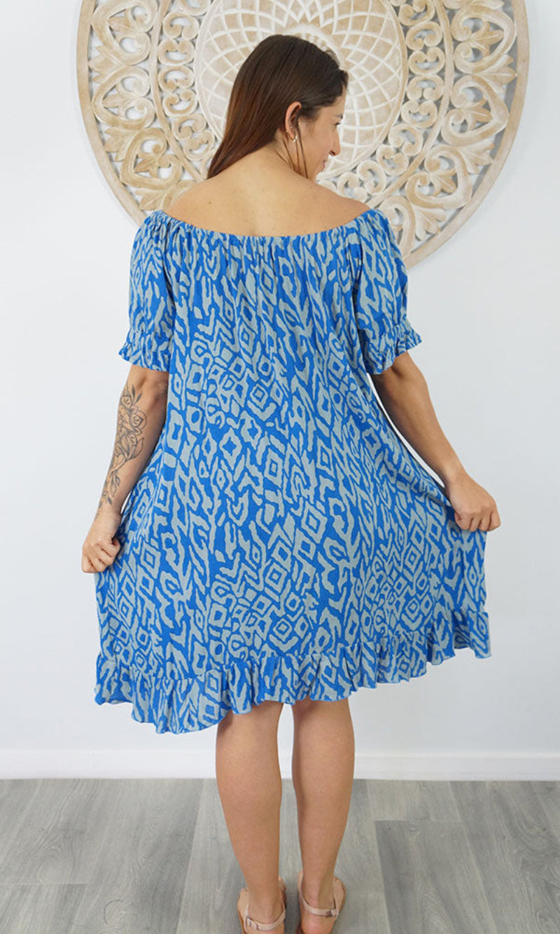 Made from crinkle rayon, the cuba dress features elastic around the back neck line with a drawstring tie at the front, frill detail on sleeves and hem line with pockets on each side.