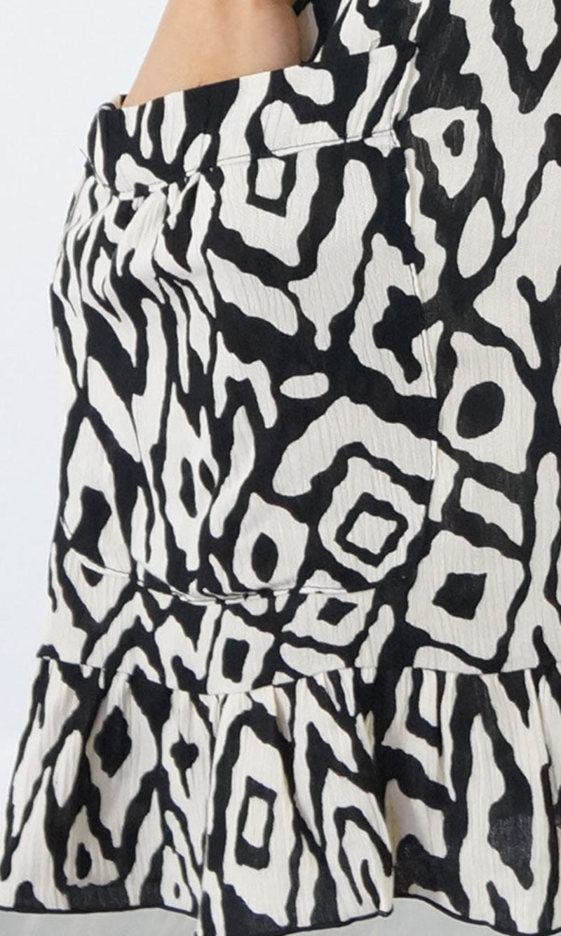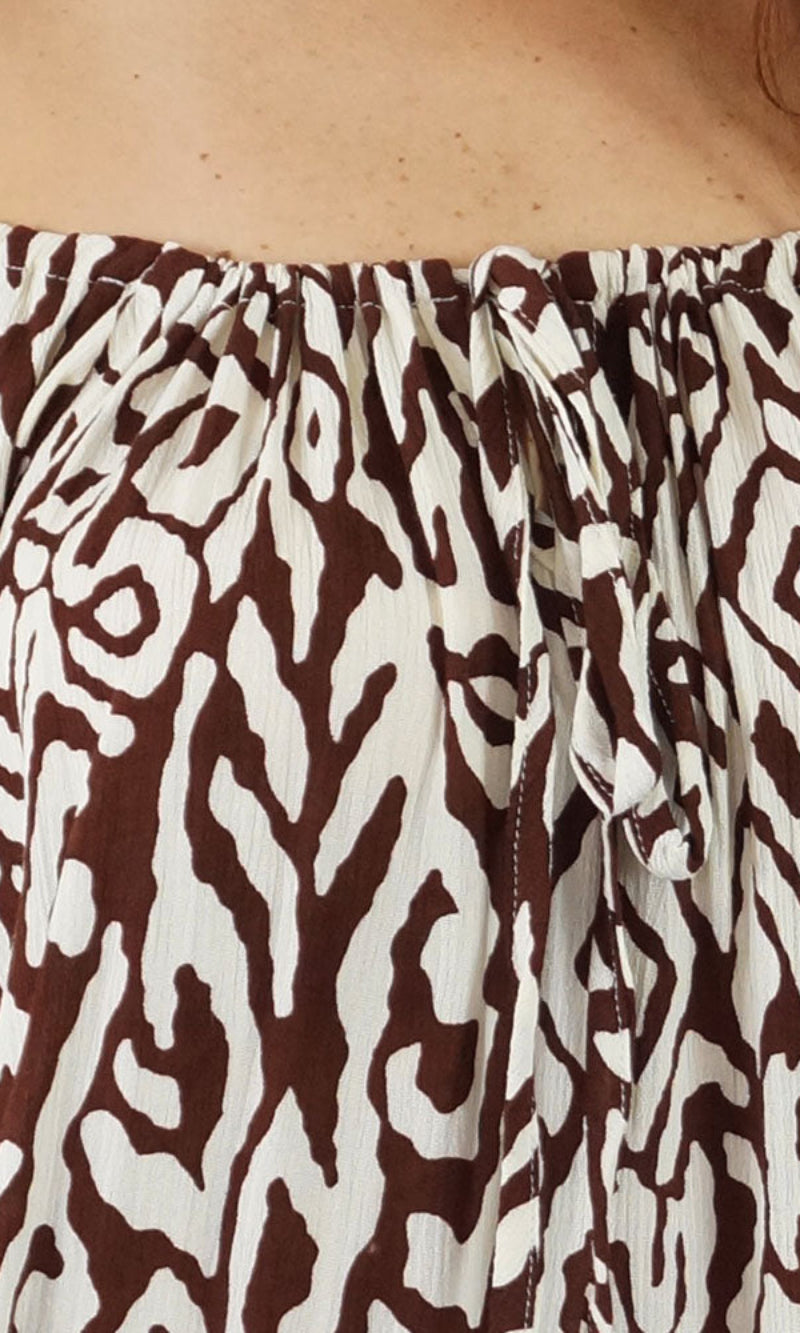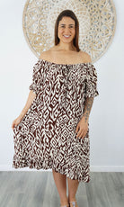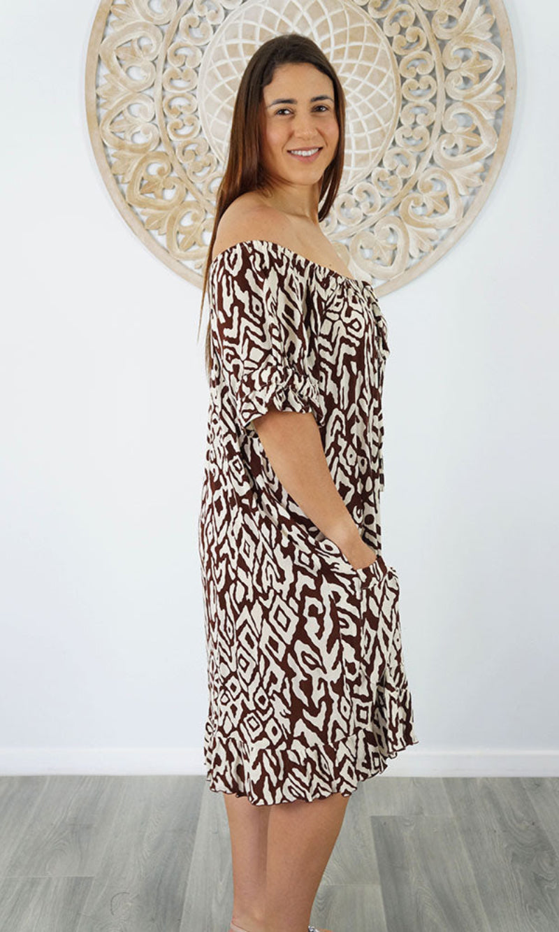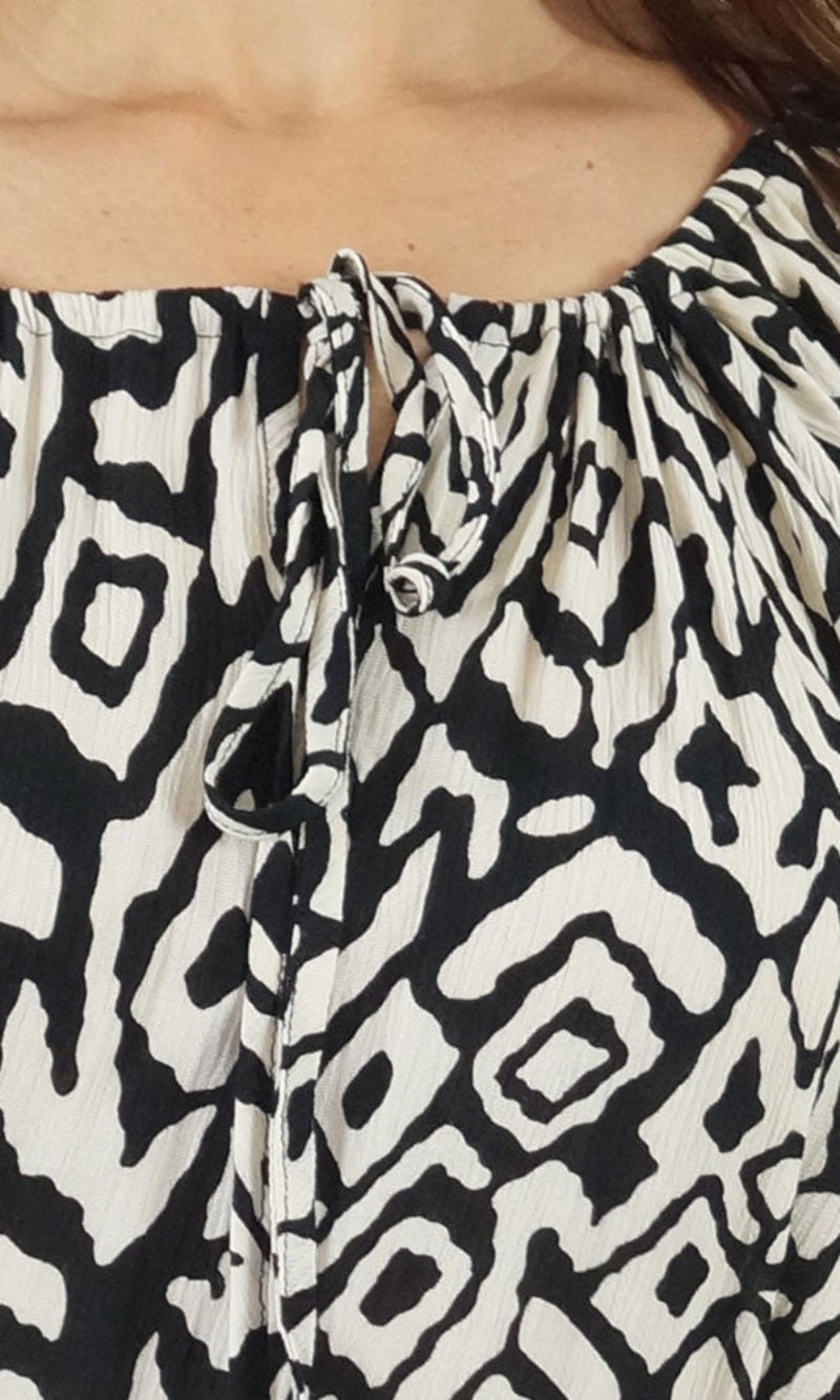 Made from crinkle rayon, the cuba dress features elastic around the back neck line with a drawstring tie at the front, frill detail on sleeves and hem line with pockets on each side.