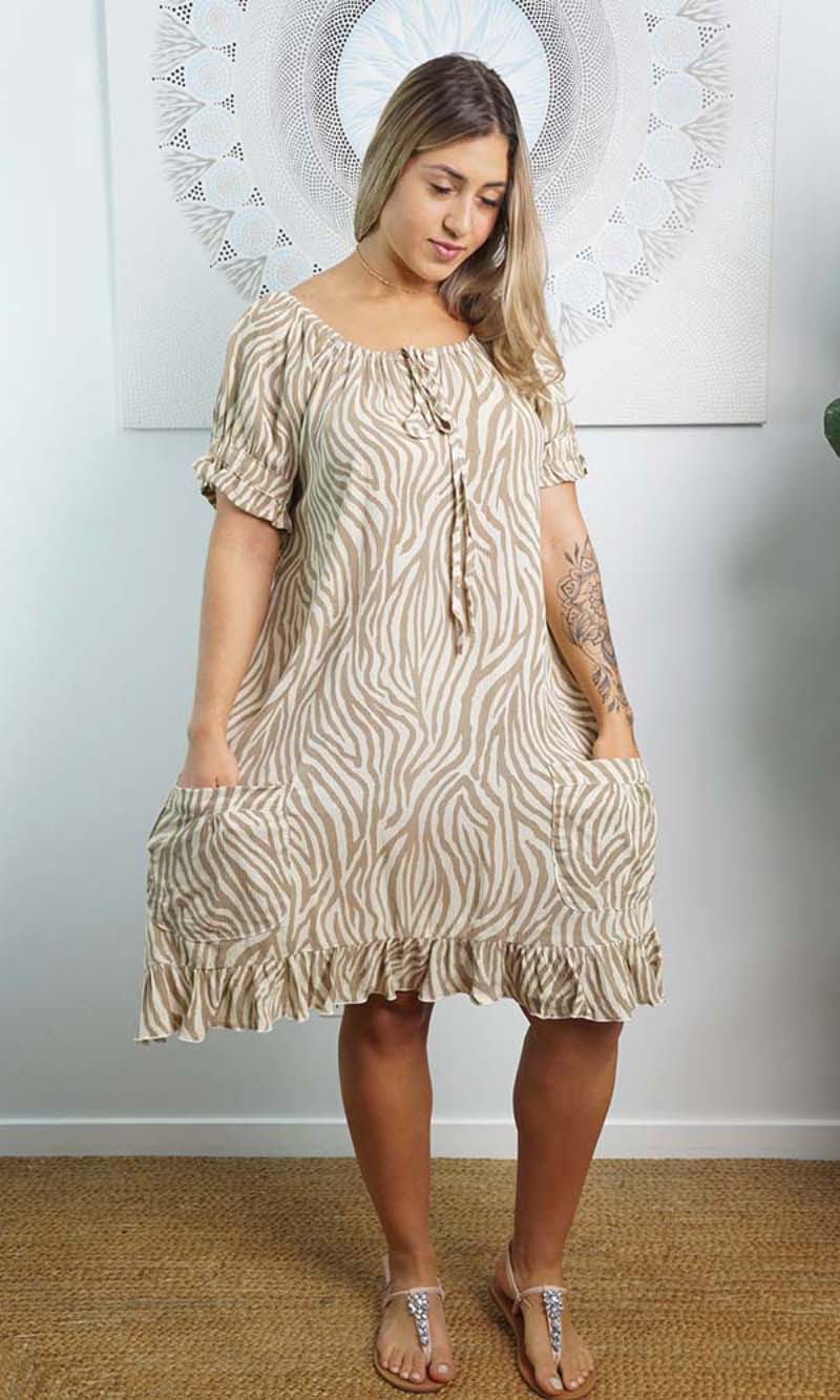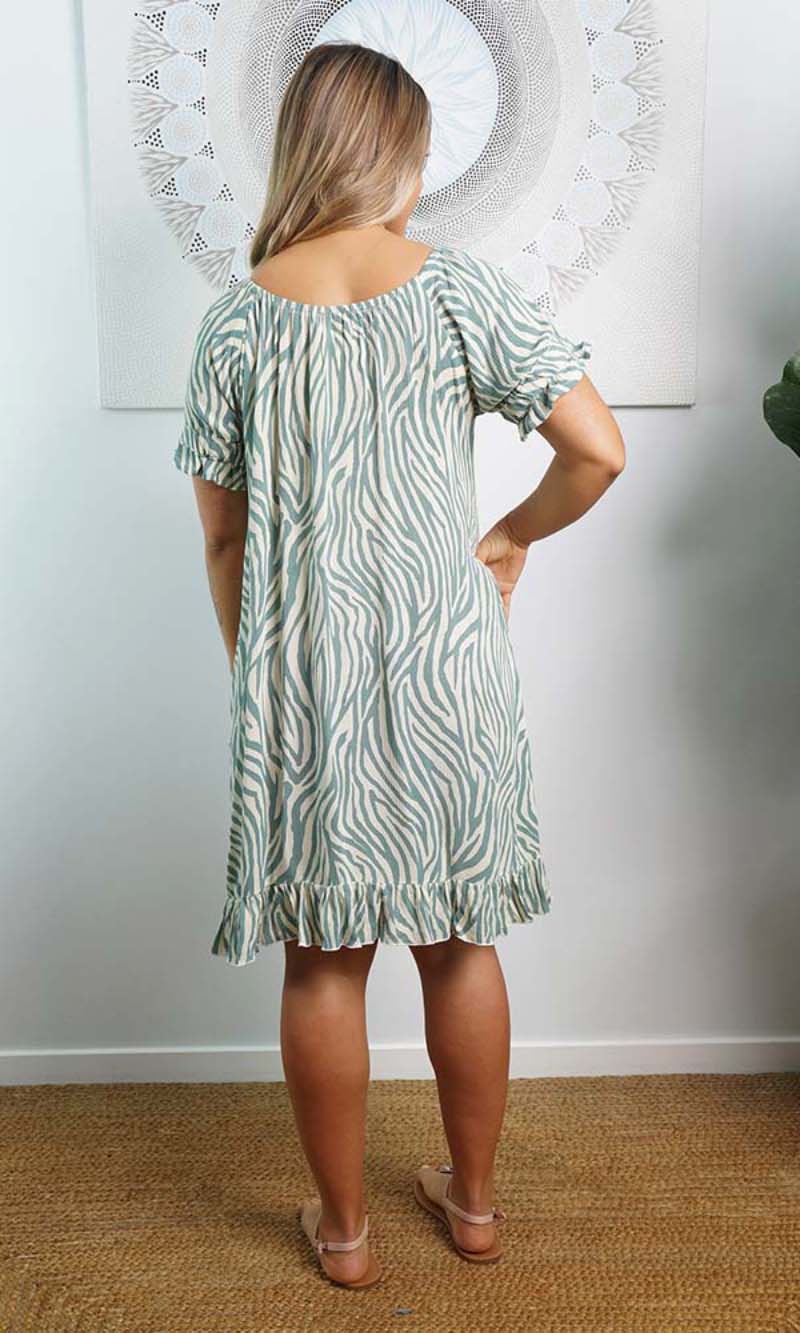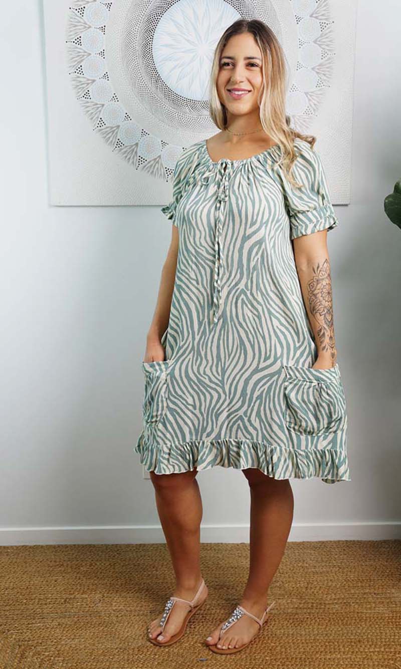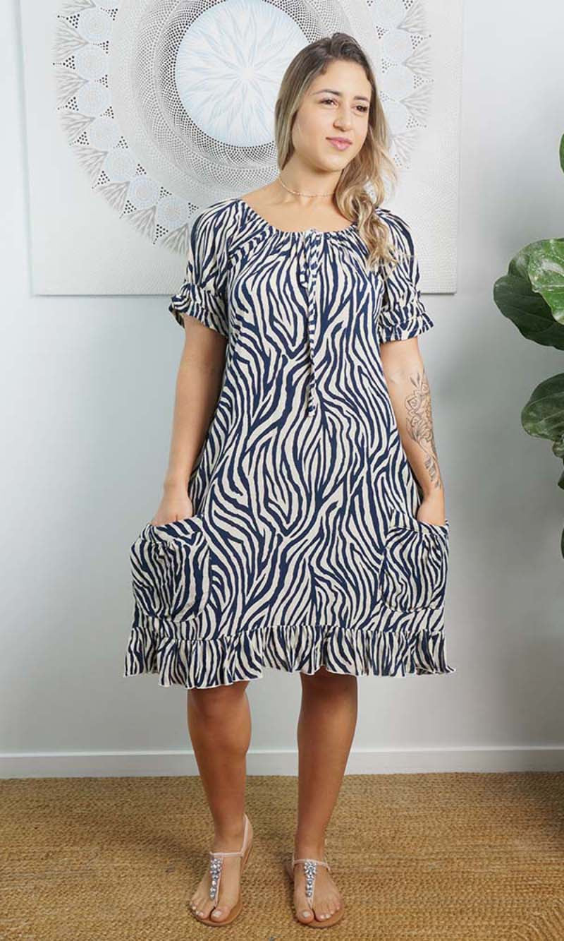 Made from crinkle rayon, the cuba dress features elastic around the back neck line with a drawstring tie at the front, frill detail on sleeves and hem line with pockets on each side.