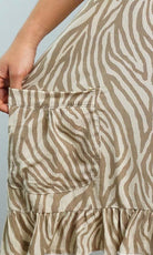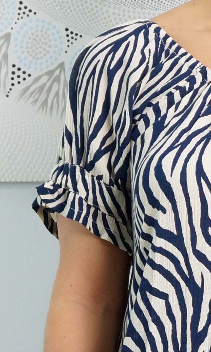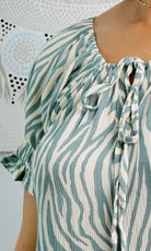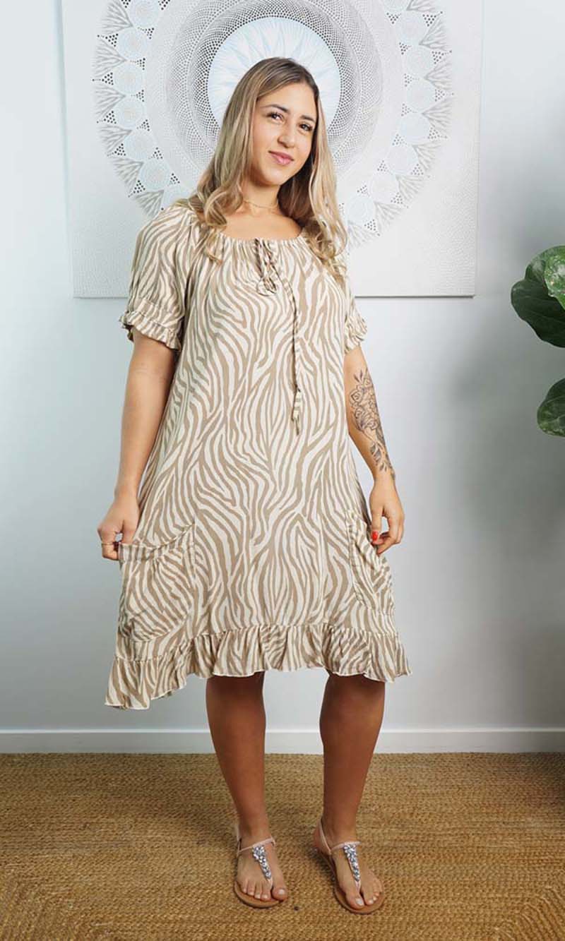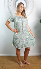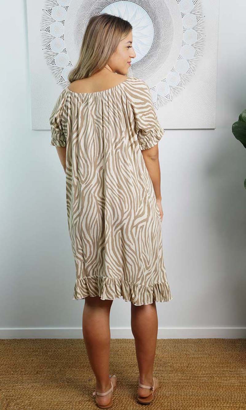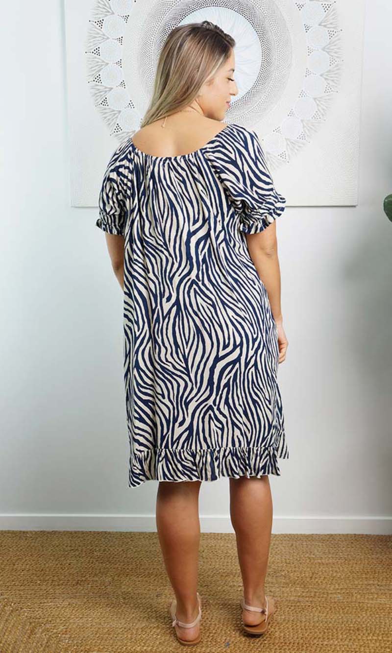 Made from crinkle rayon, the cuba dress features elastic around the back neck line with a drawstring tie at the front, frill detail on sleeves and hem line with pockets on each side.