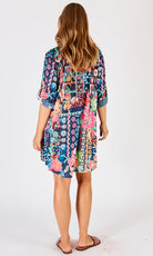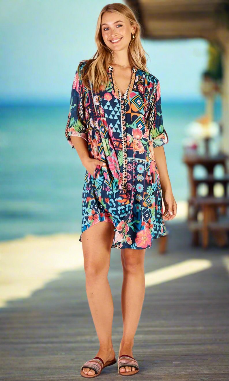 The Delphi Dress is a relaxed fitting above-knee length dress in an exciting new digital print. Featuring a buttoned tap on sleeve for a rolled up look, this piece is as versatile as it is breathtaking! Being buttoned through to the hem, it can be worn as a dress or an over-jacket.