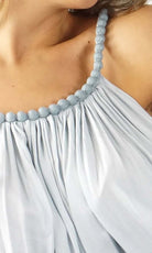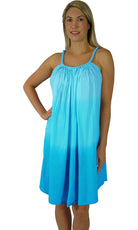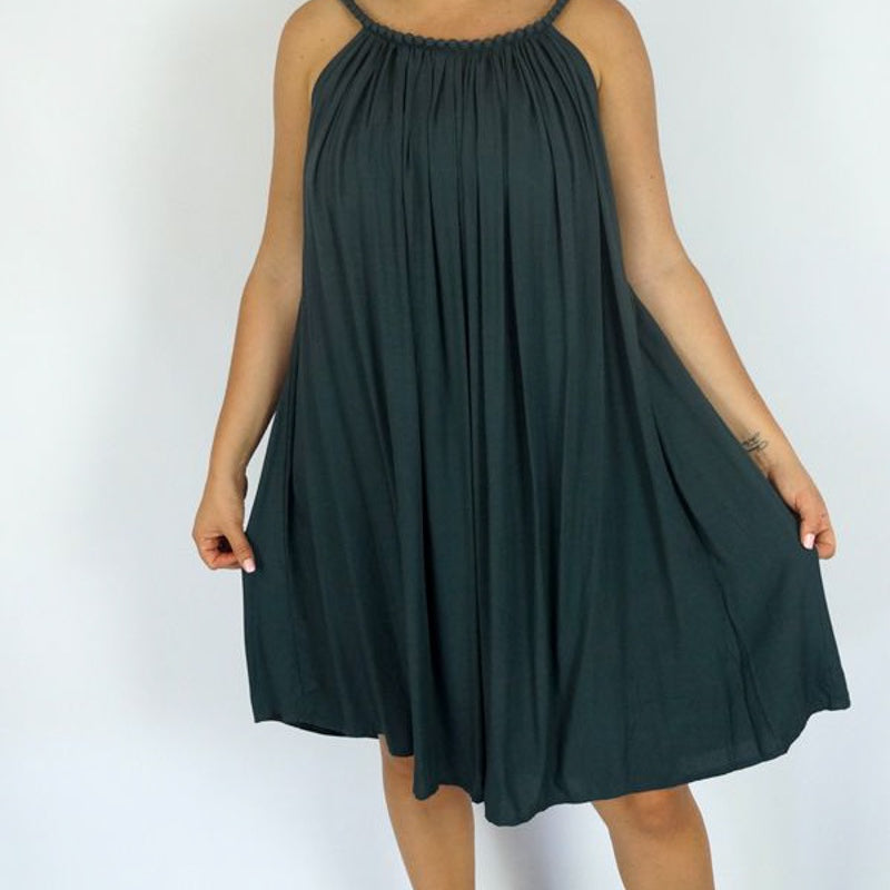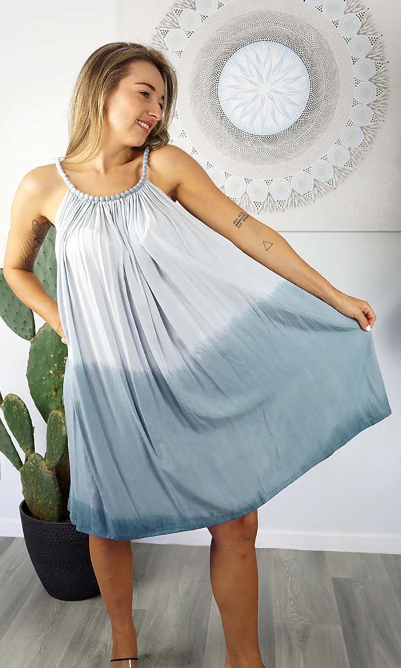 What a great dress for those warm summer days. Made from a plain colour cool rayon, with a stylish beaded neckline covered in fabric.