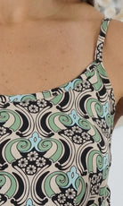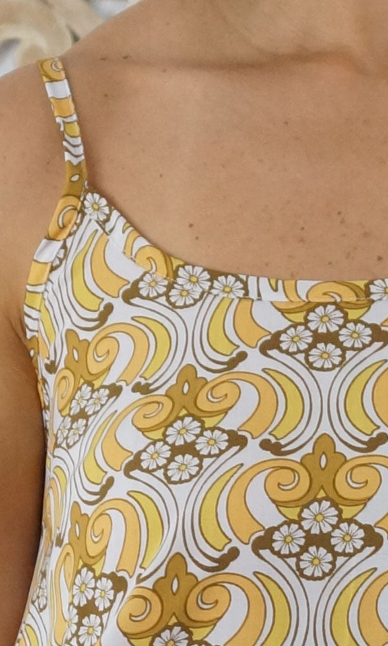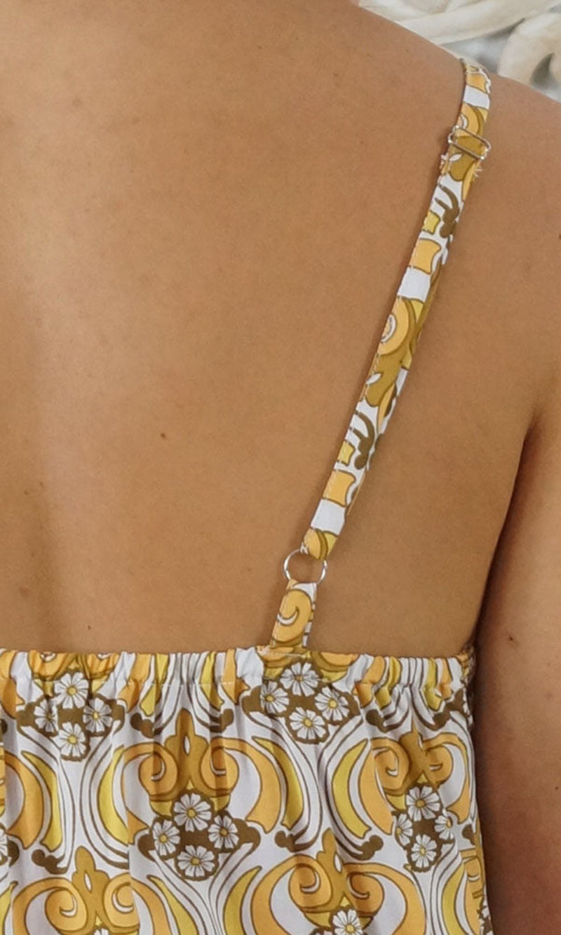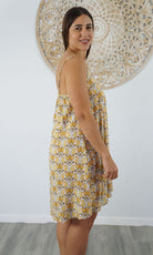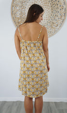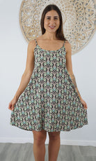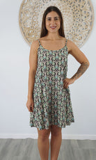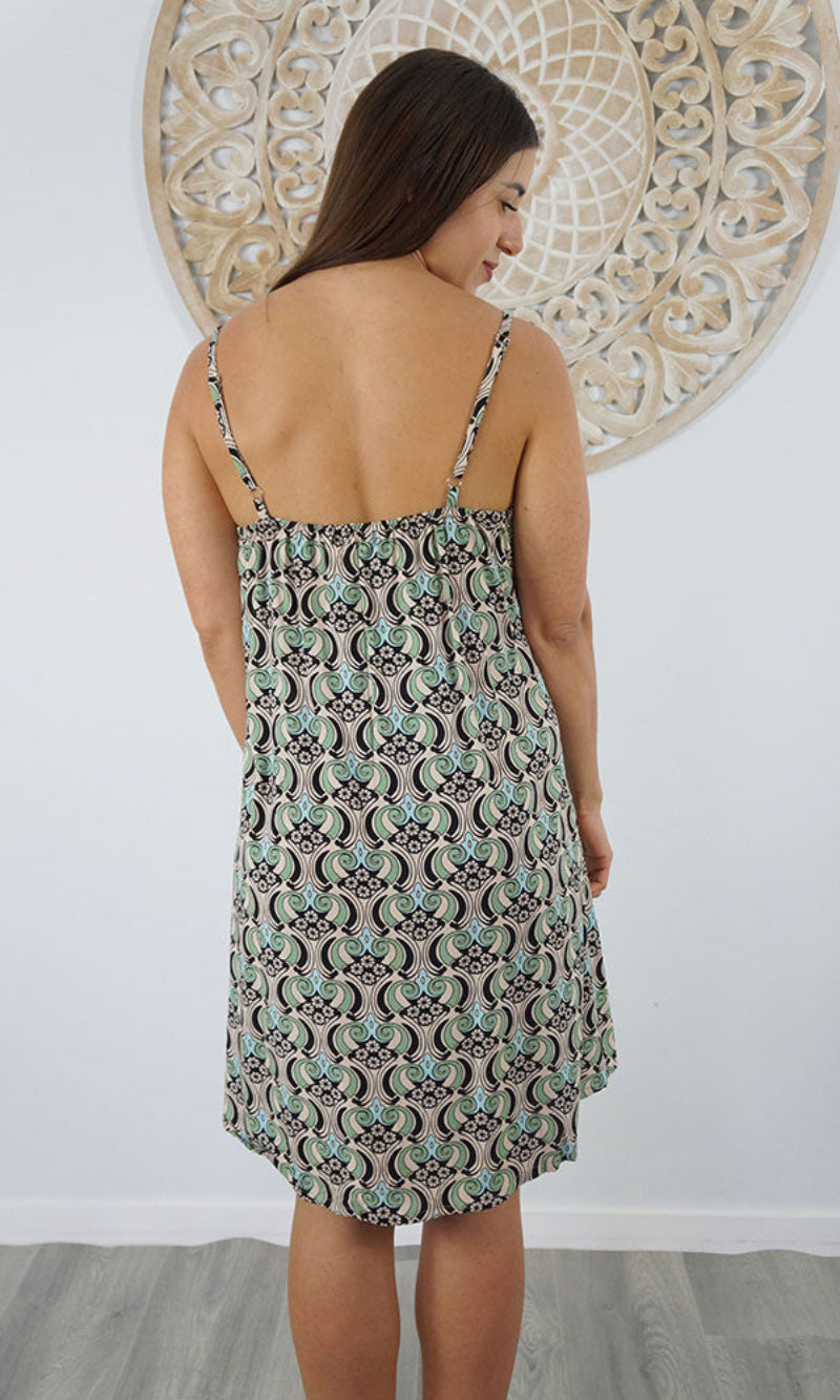 This is a lightweight mini dress that features thin adjustable straps with elastic on the back.