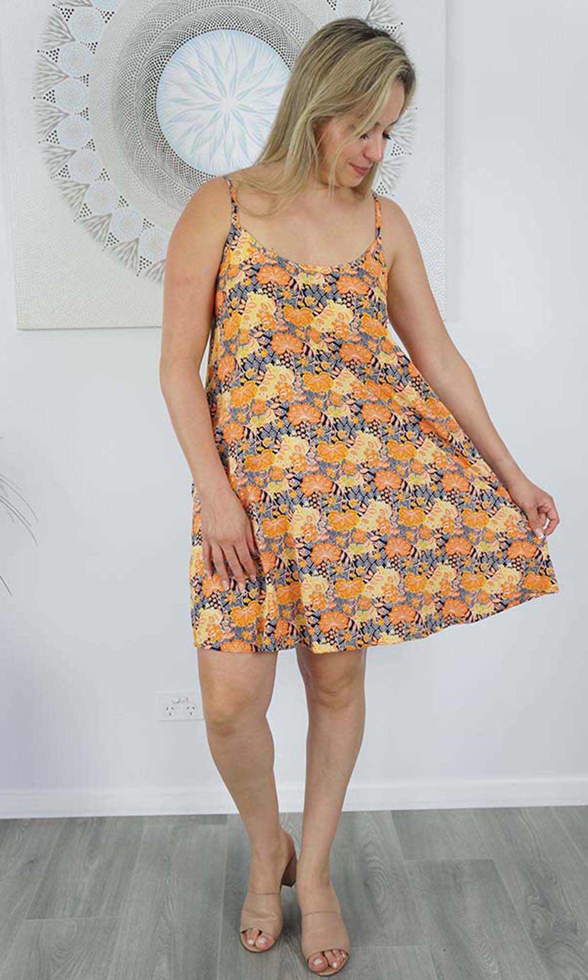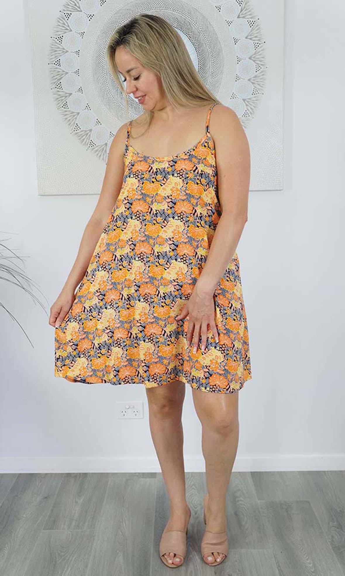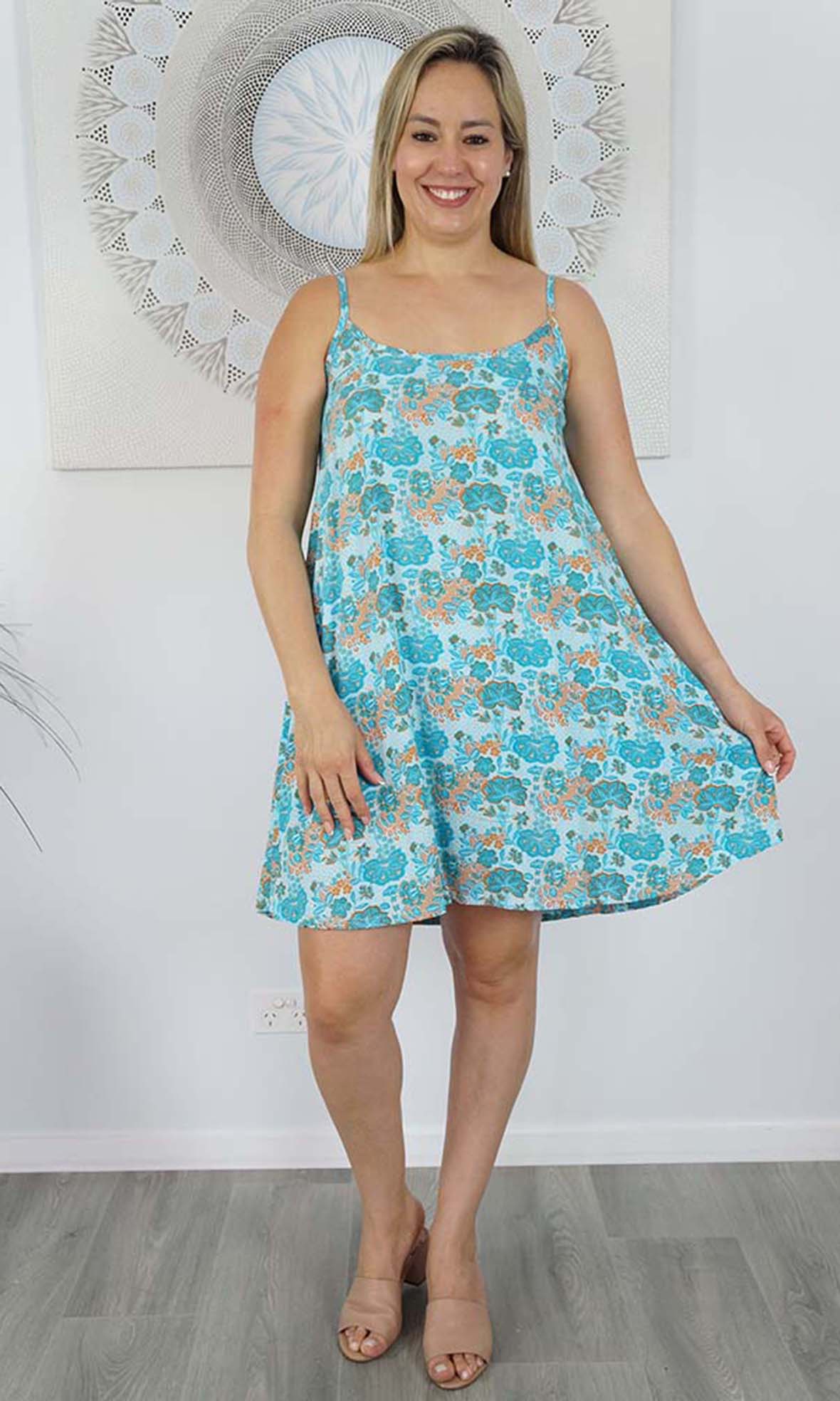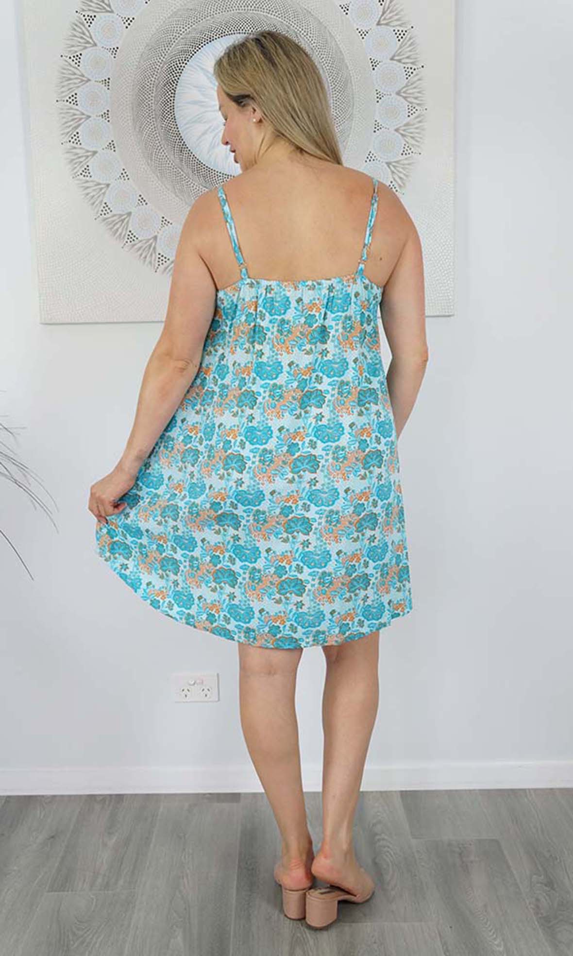 This is a lightweight mini dress that features thin adjustable straps with elastic on the back.