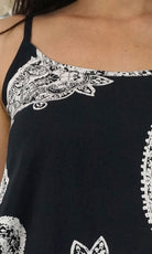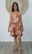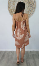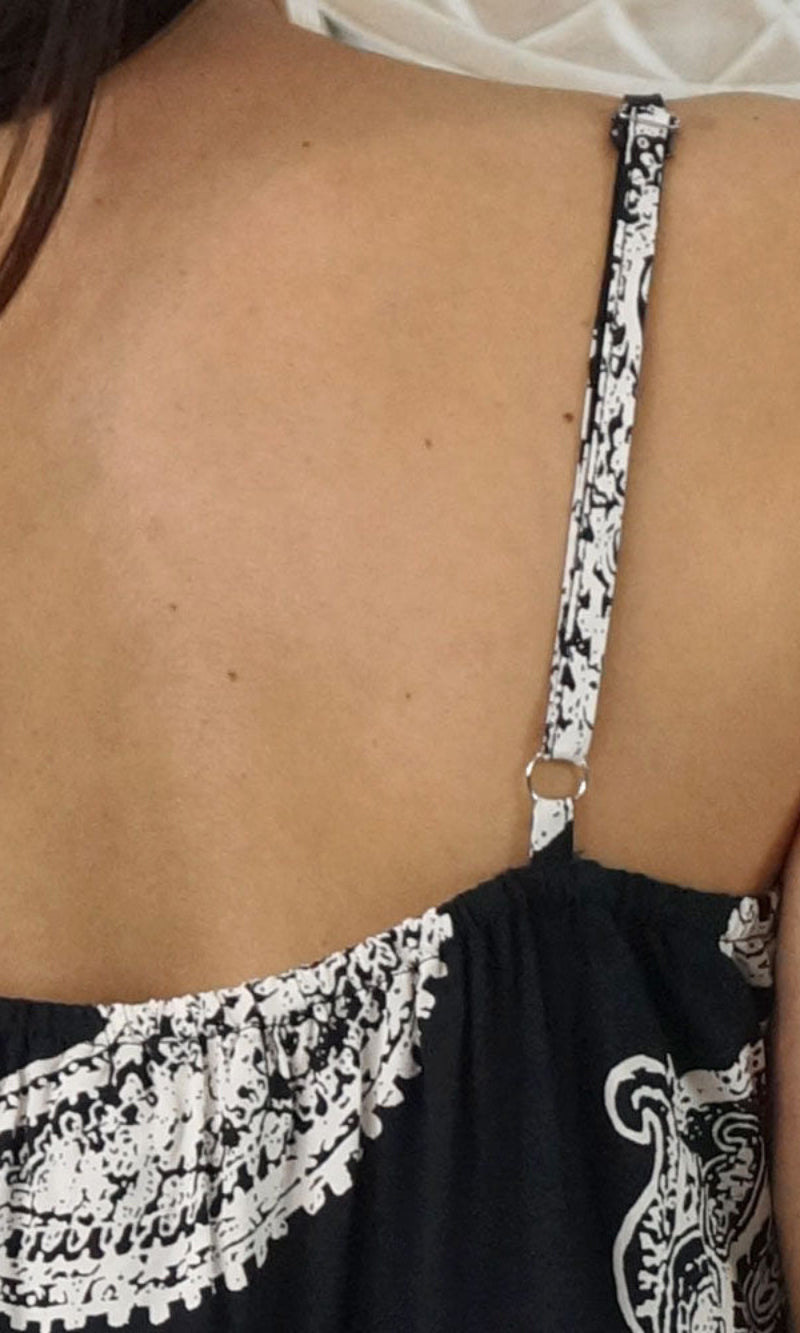 This is a lightweight mini dress that features thin adjustable straps with elastic on the back.