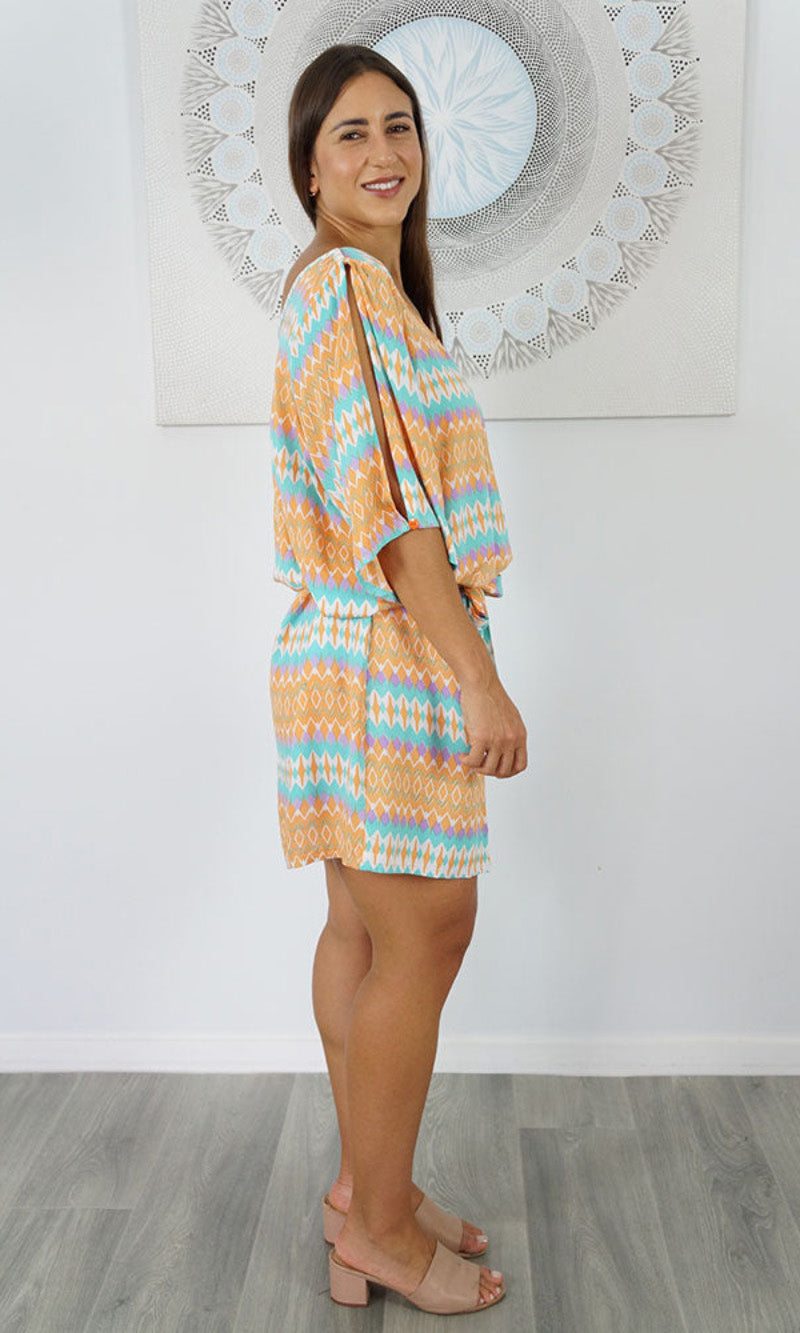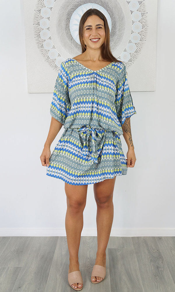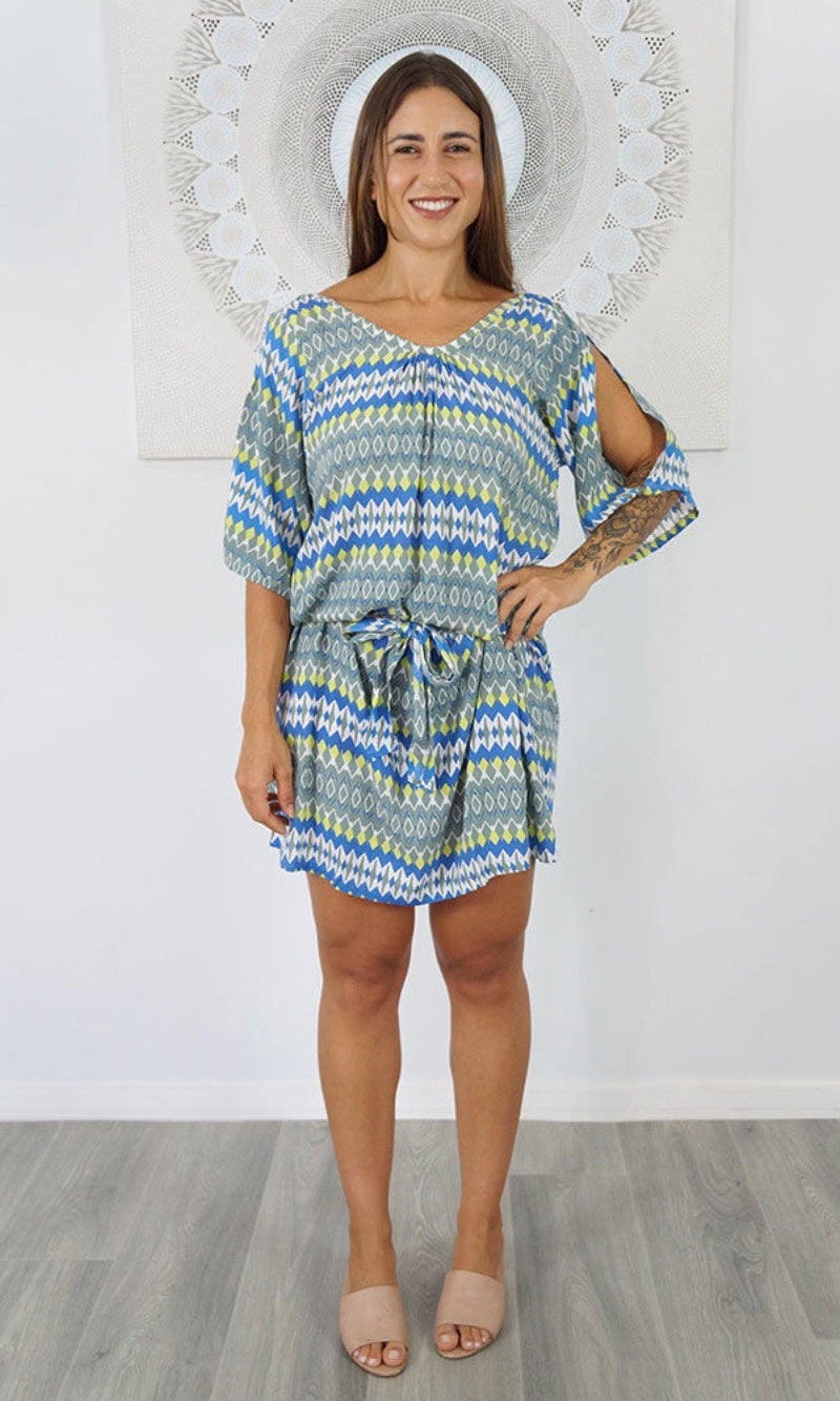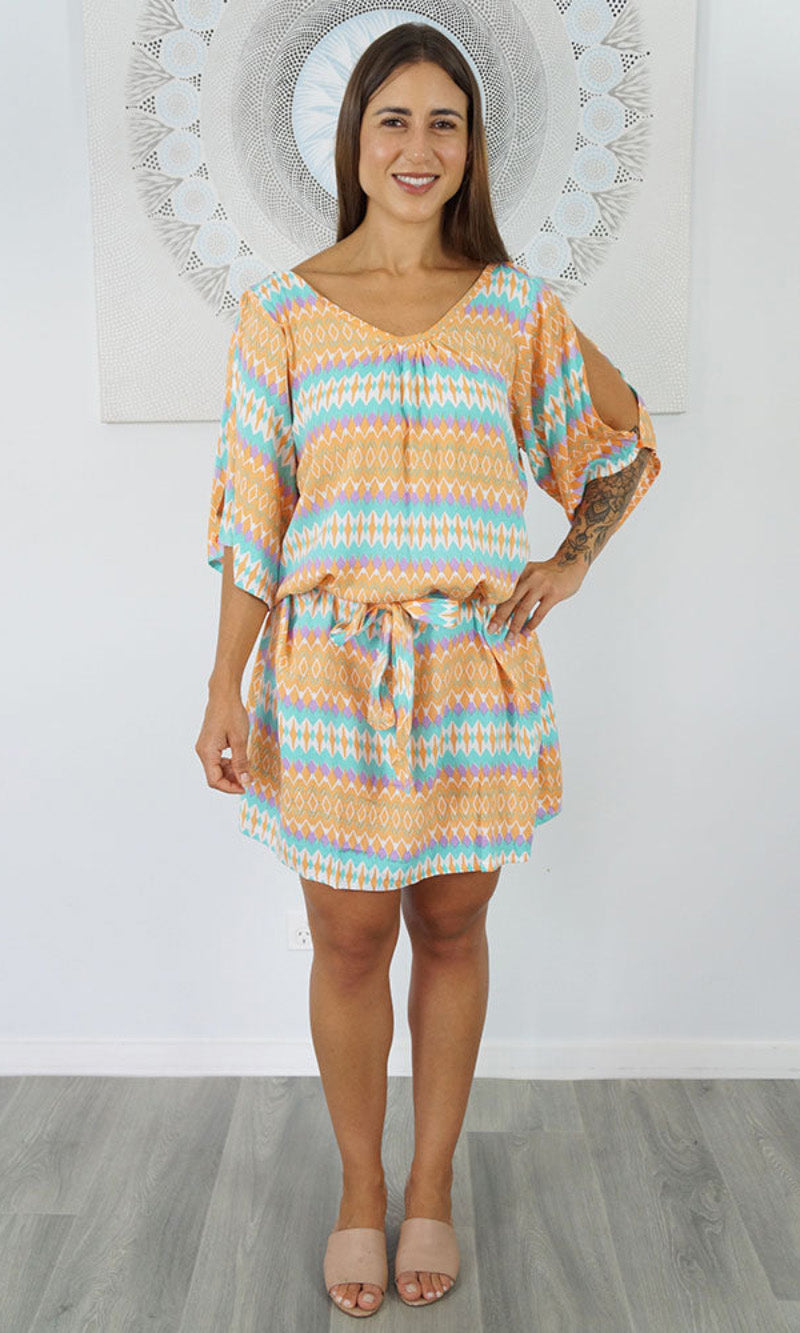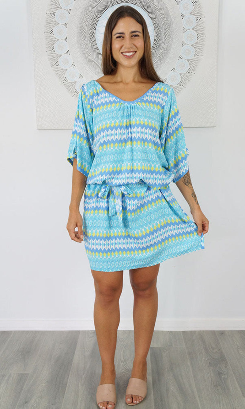 Made from a cool rayon with open sleeves and a matching fabric tie for around the waist this dress is perfect for summer.