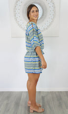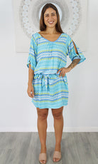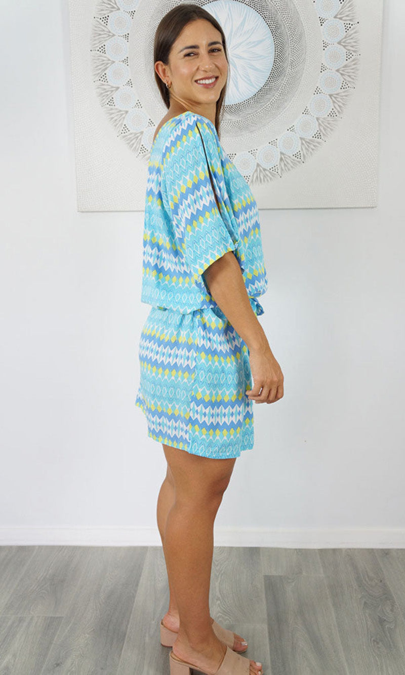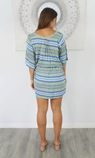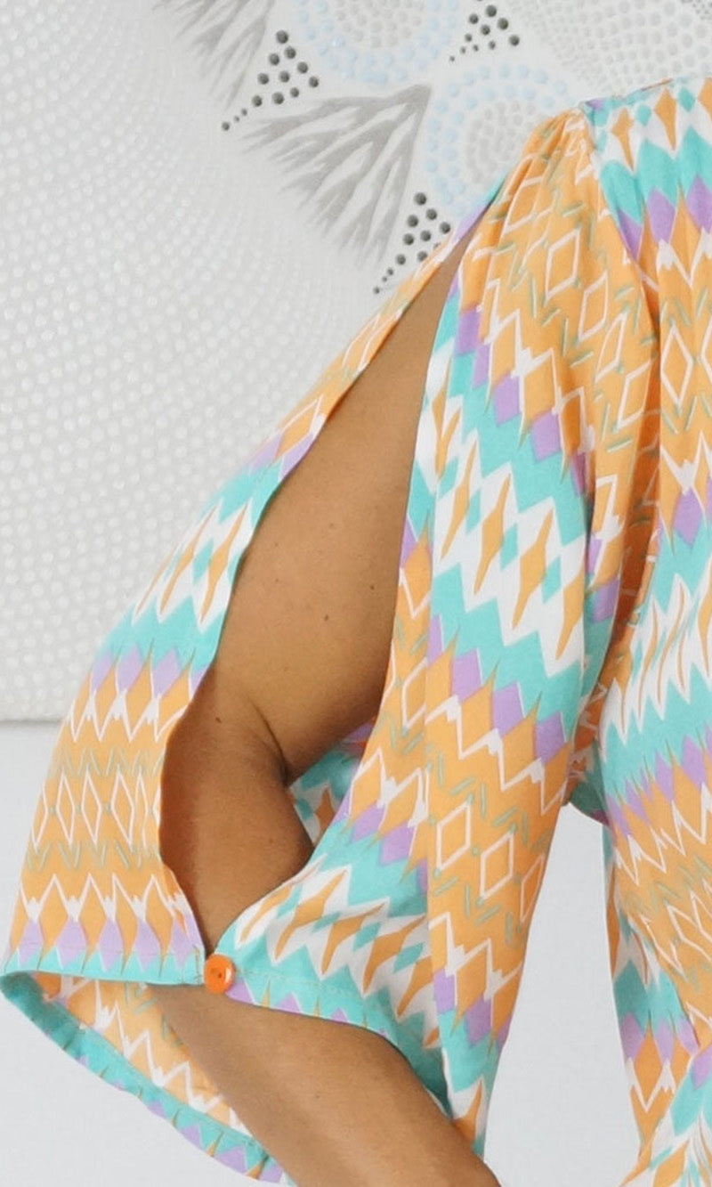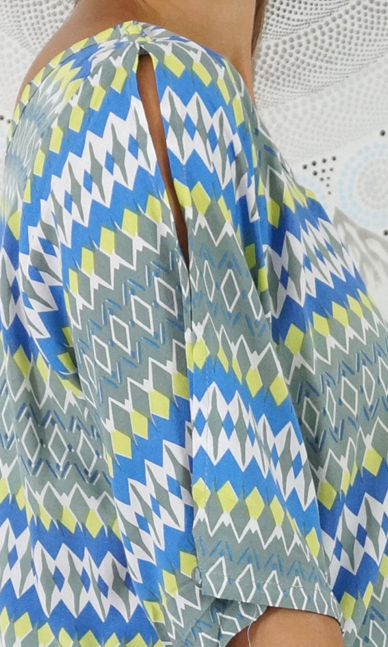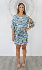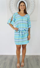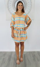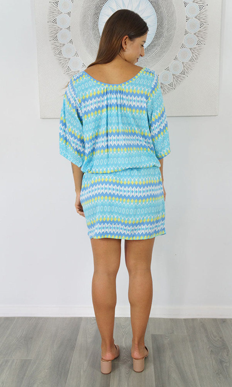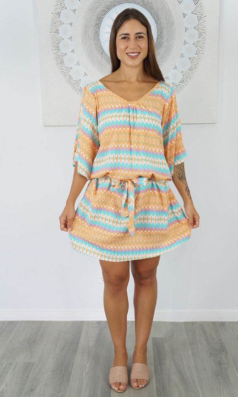 Made from a cool rayon with open sleeves and a matching fabric tie for around the waist this dress is perfect for summer.