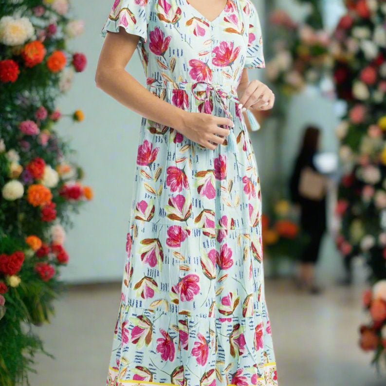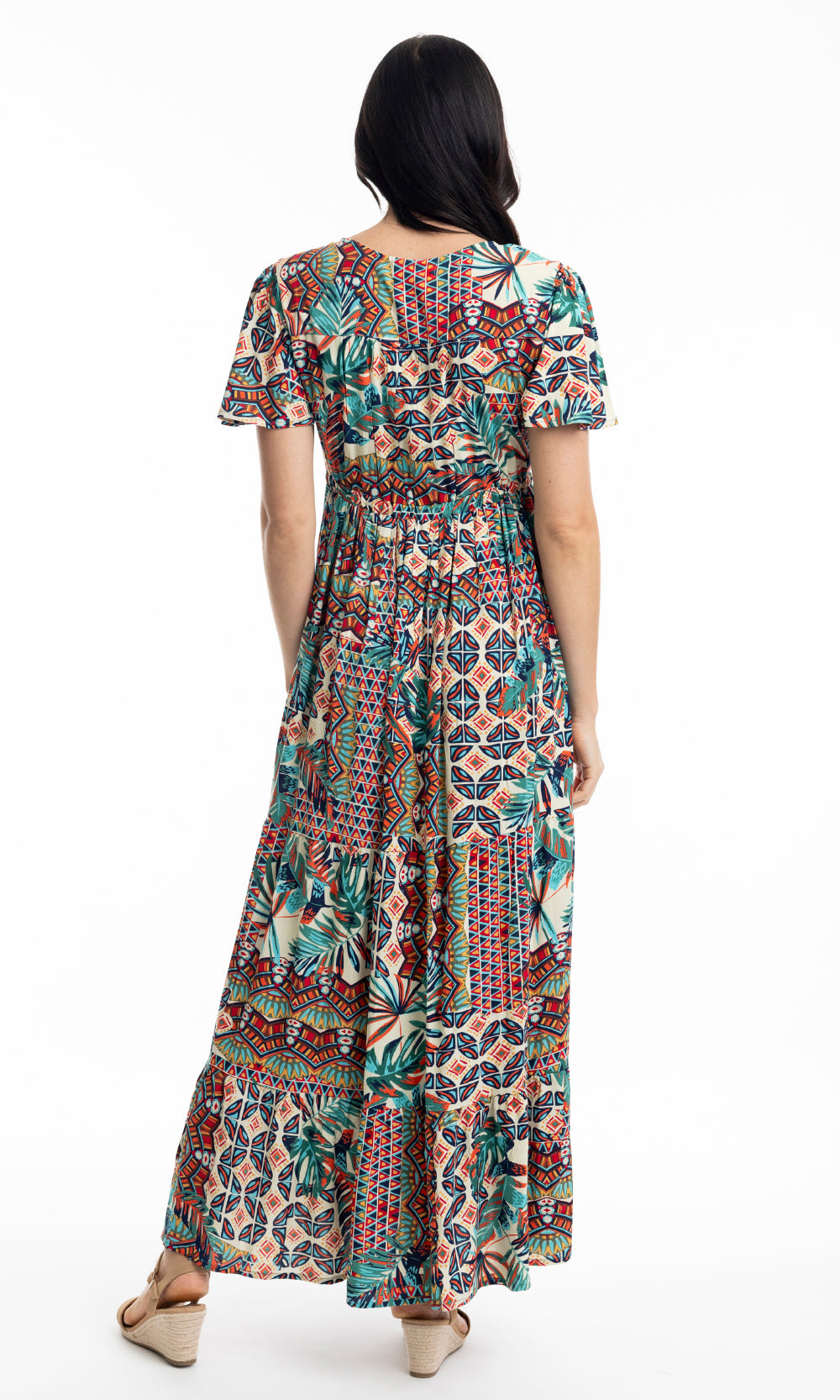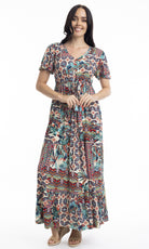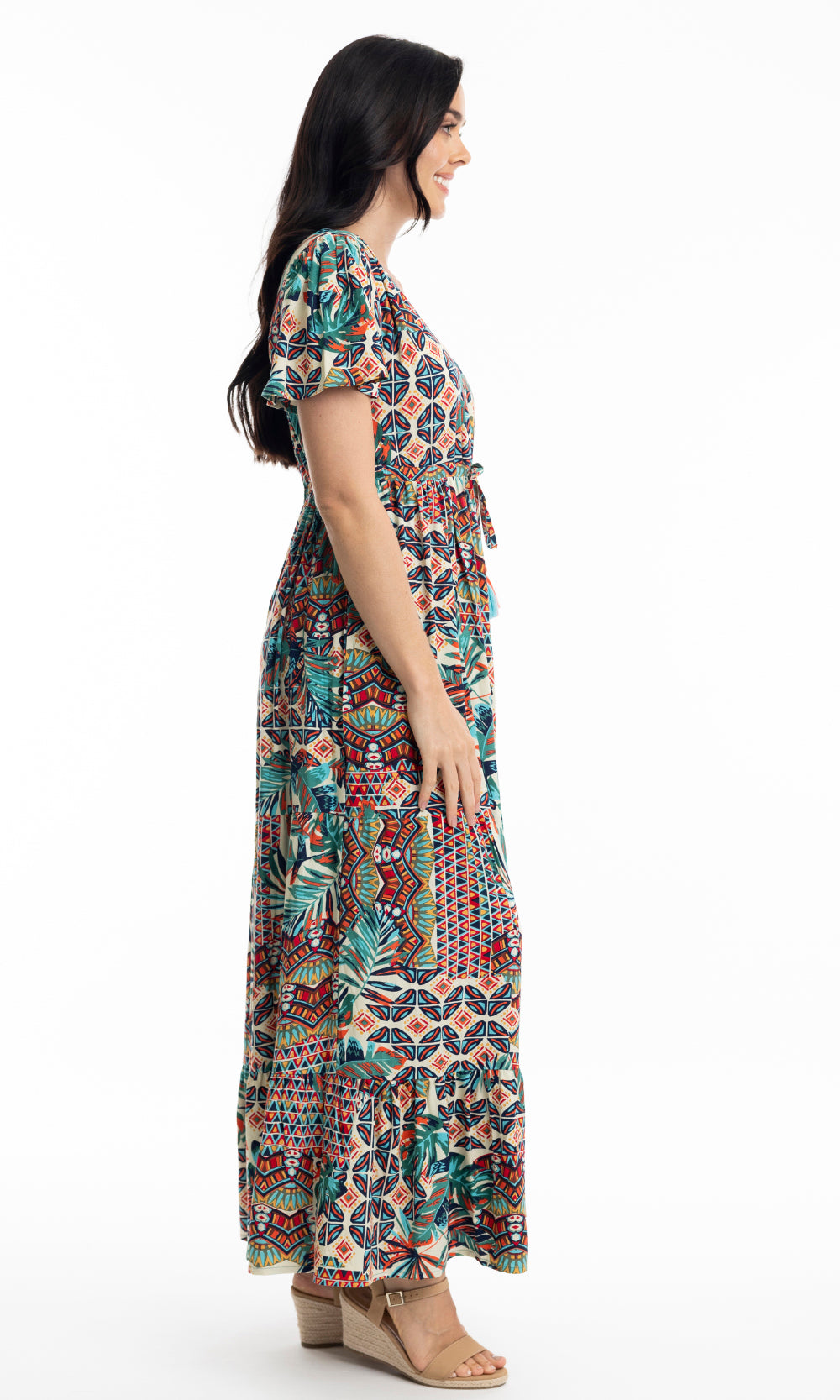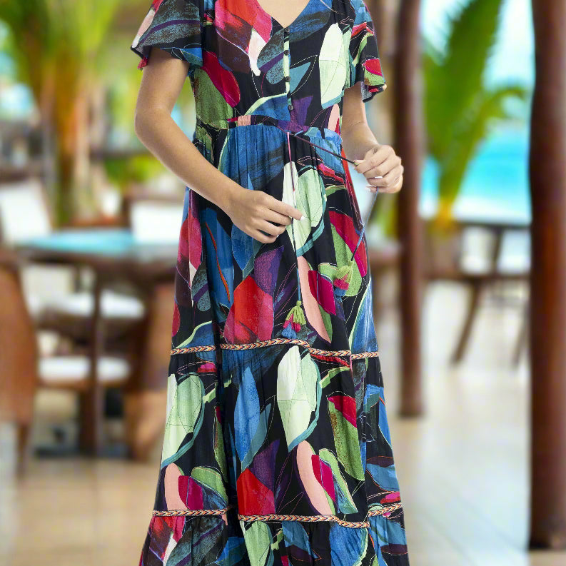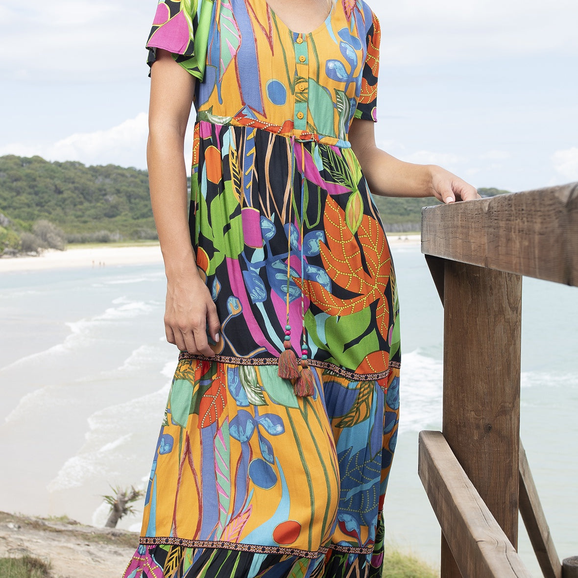 Embrace summer elegance with our beautiful Rio dress. Featuring a vibrant print, buttons at the bust, short sleeves, and a flowing, comfortable maxi length, it's perfect for sunny days and beach holidays. Embrace effortless style and comfort with this must-have dress.