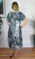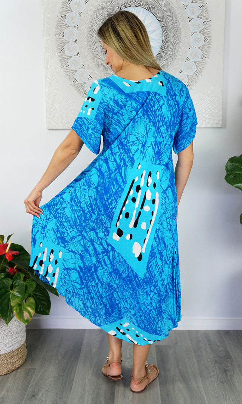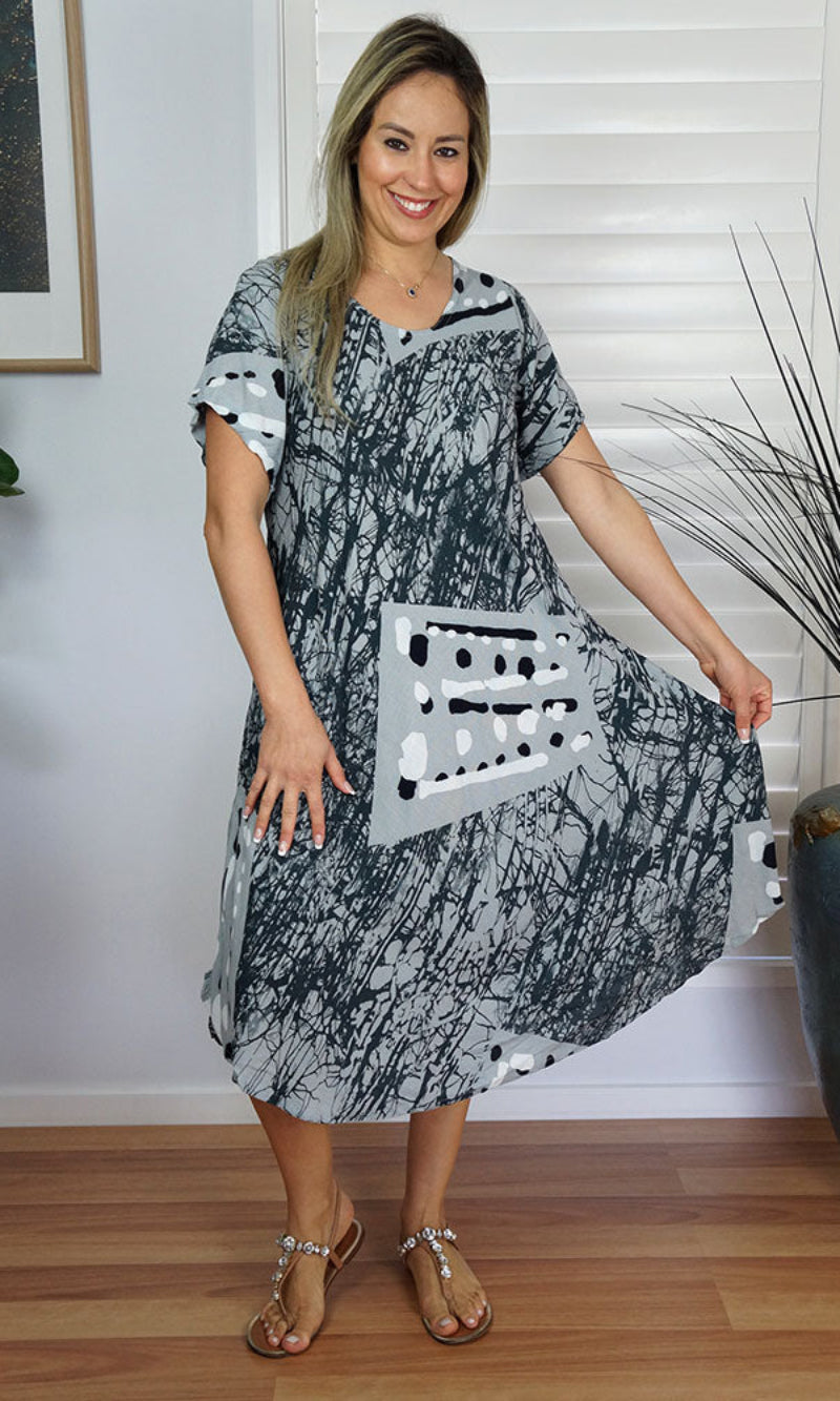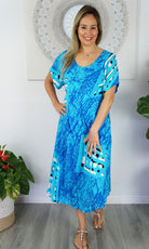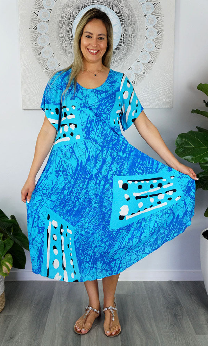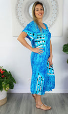 Cool and comfortable sleeveless dress in lovely pre shrunk crinkle rayon. Fabric is cut of the bias to assist the garment to fit many body shapes. Free Sizing 10 - 18.