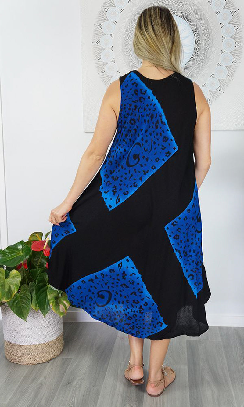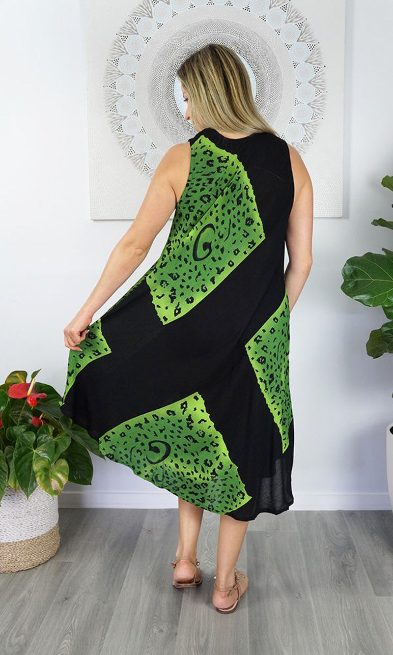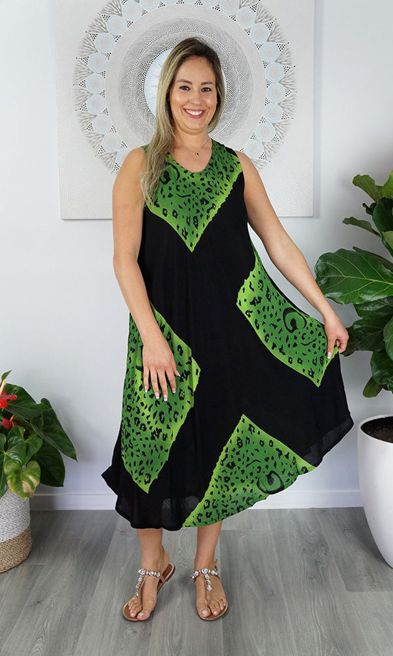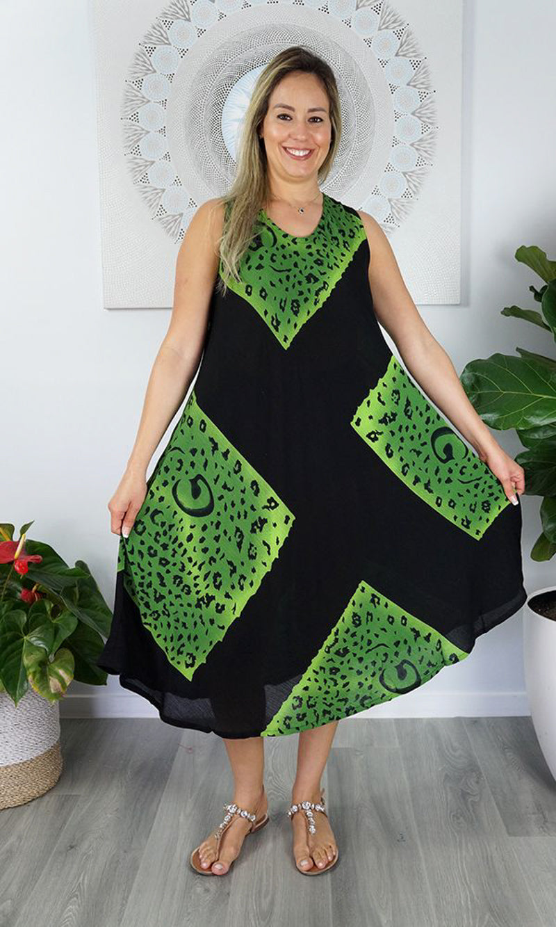 Cool and comfortable sleeveless dress in lovely pre shrunk crinkle rayon. Fabric is cut of the bias to assist the garment to fit many body shapes.