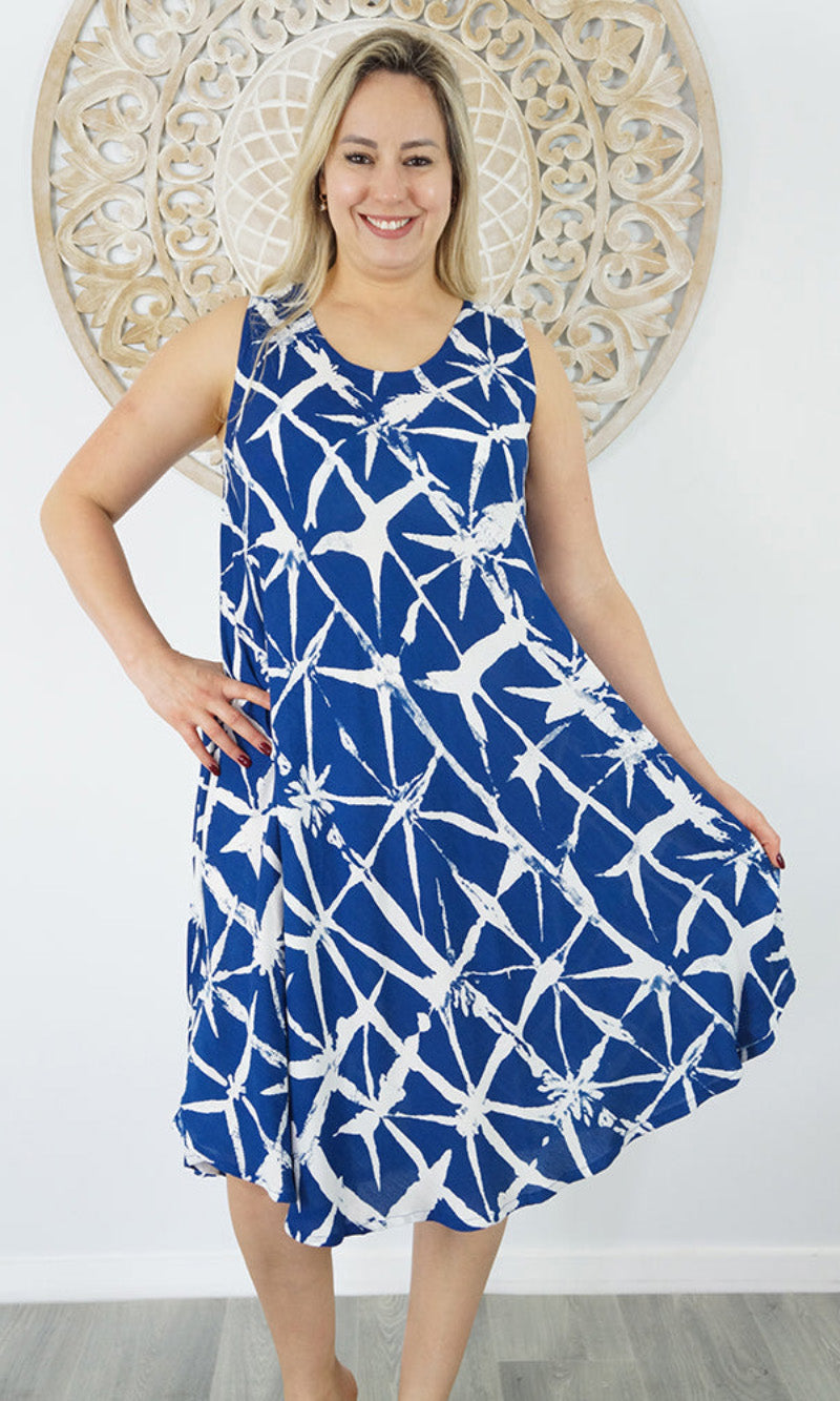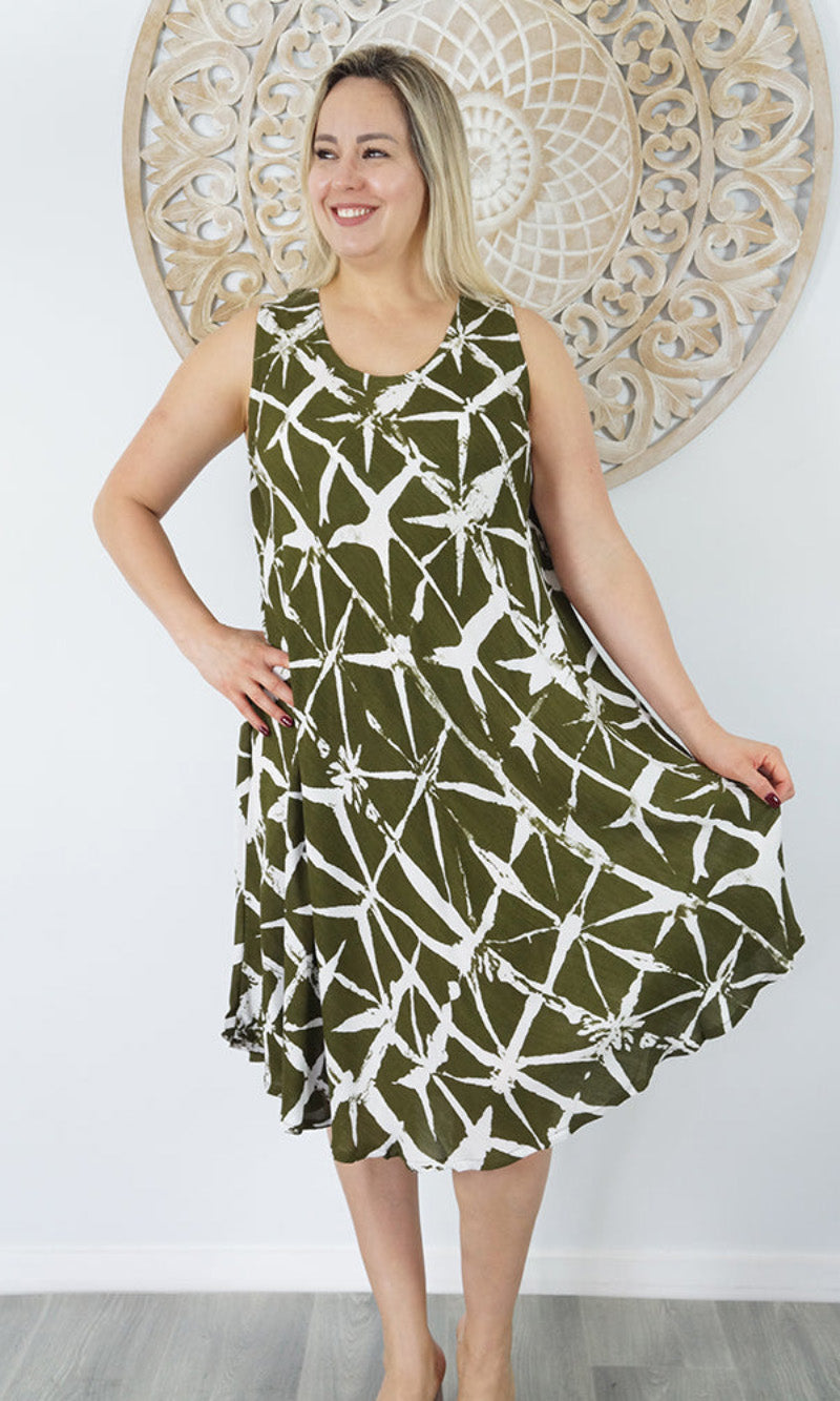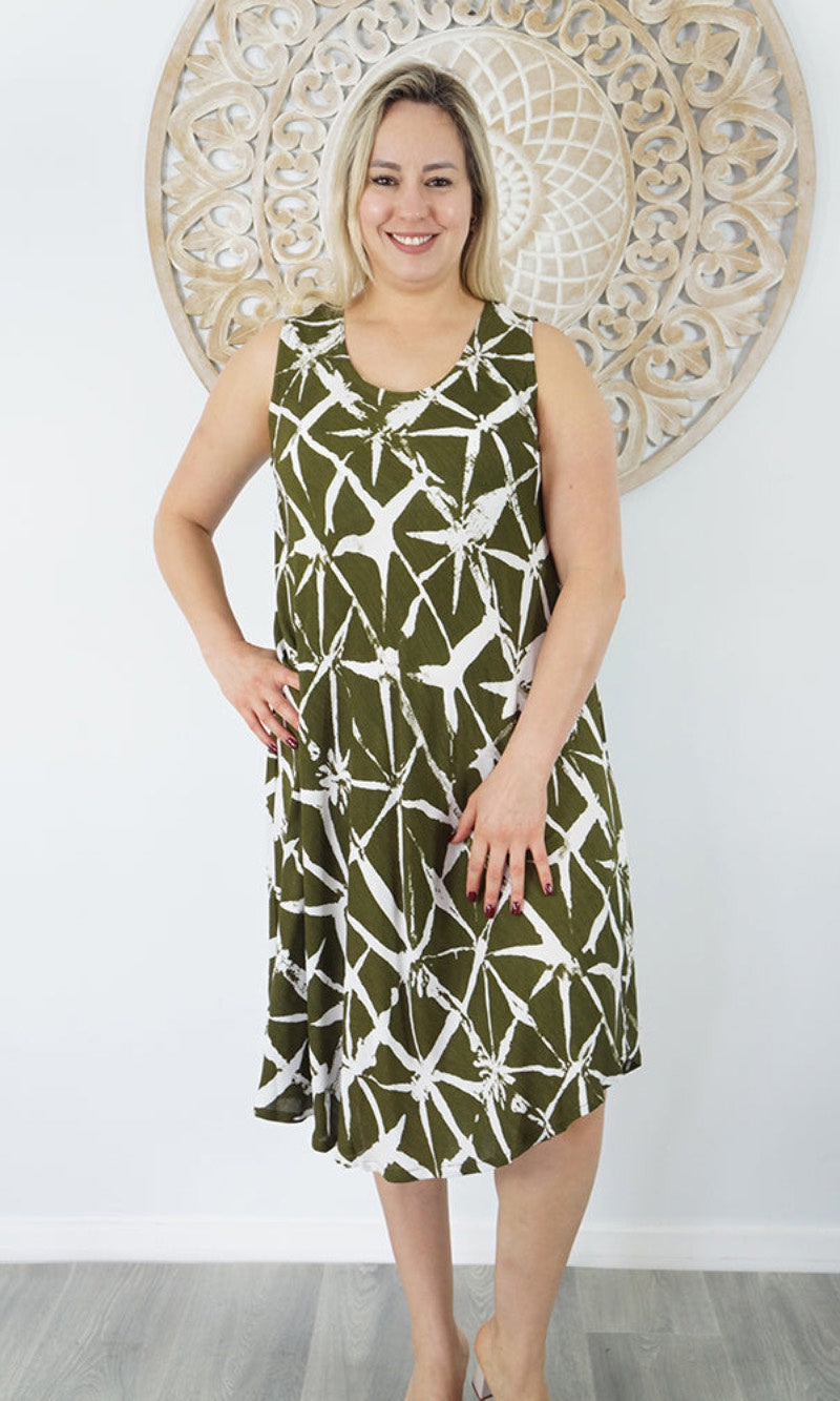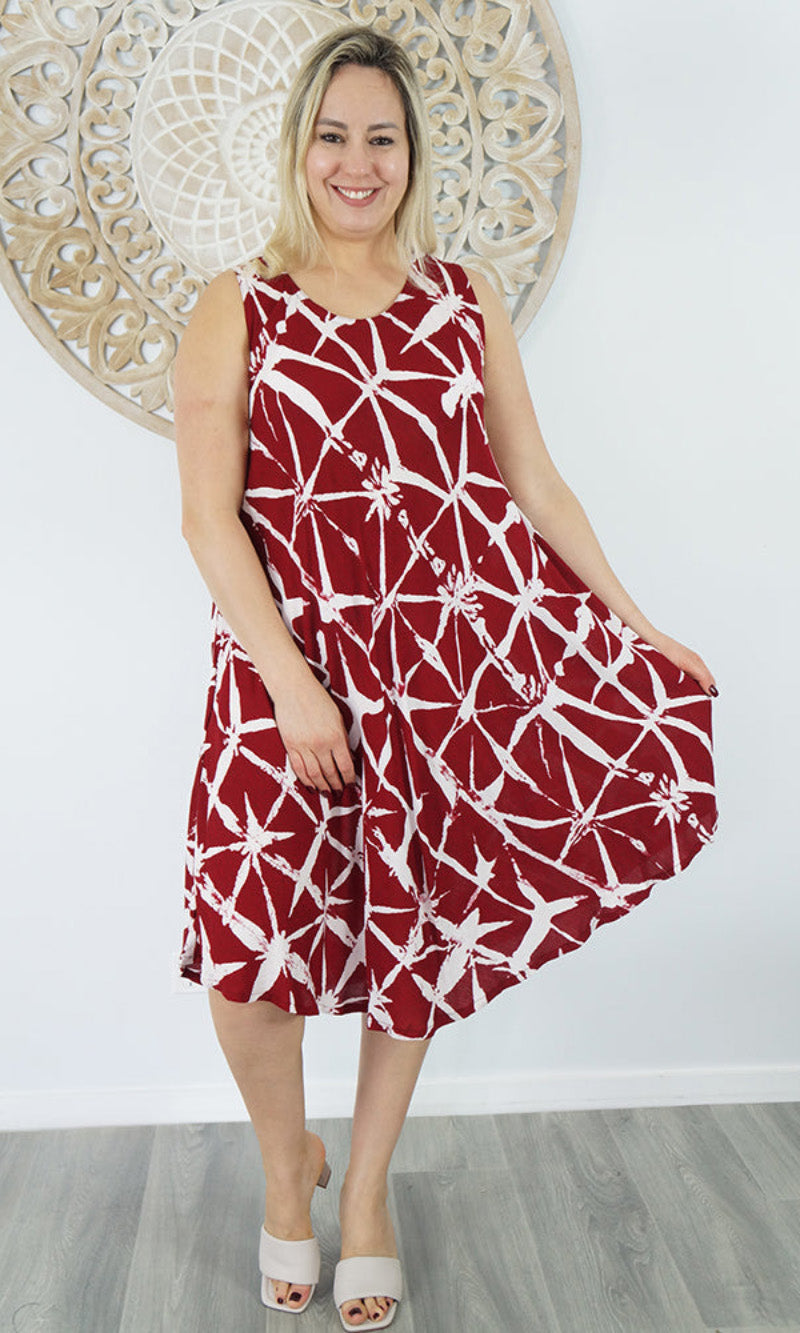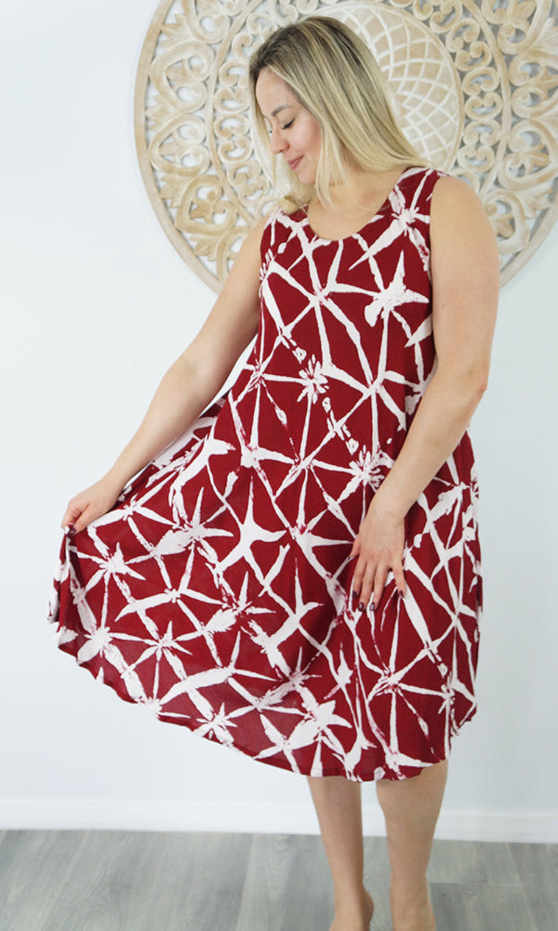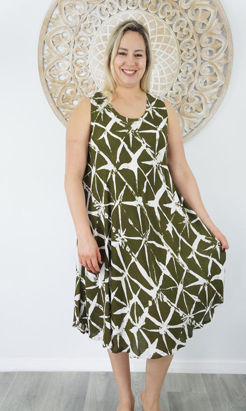 Cool and comfortable sleeveless dress in lovely pre shrunk crinkle rayon. Fabric is cut of the bias to assist the garment to fit many body shapes.