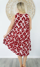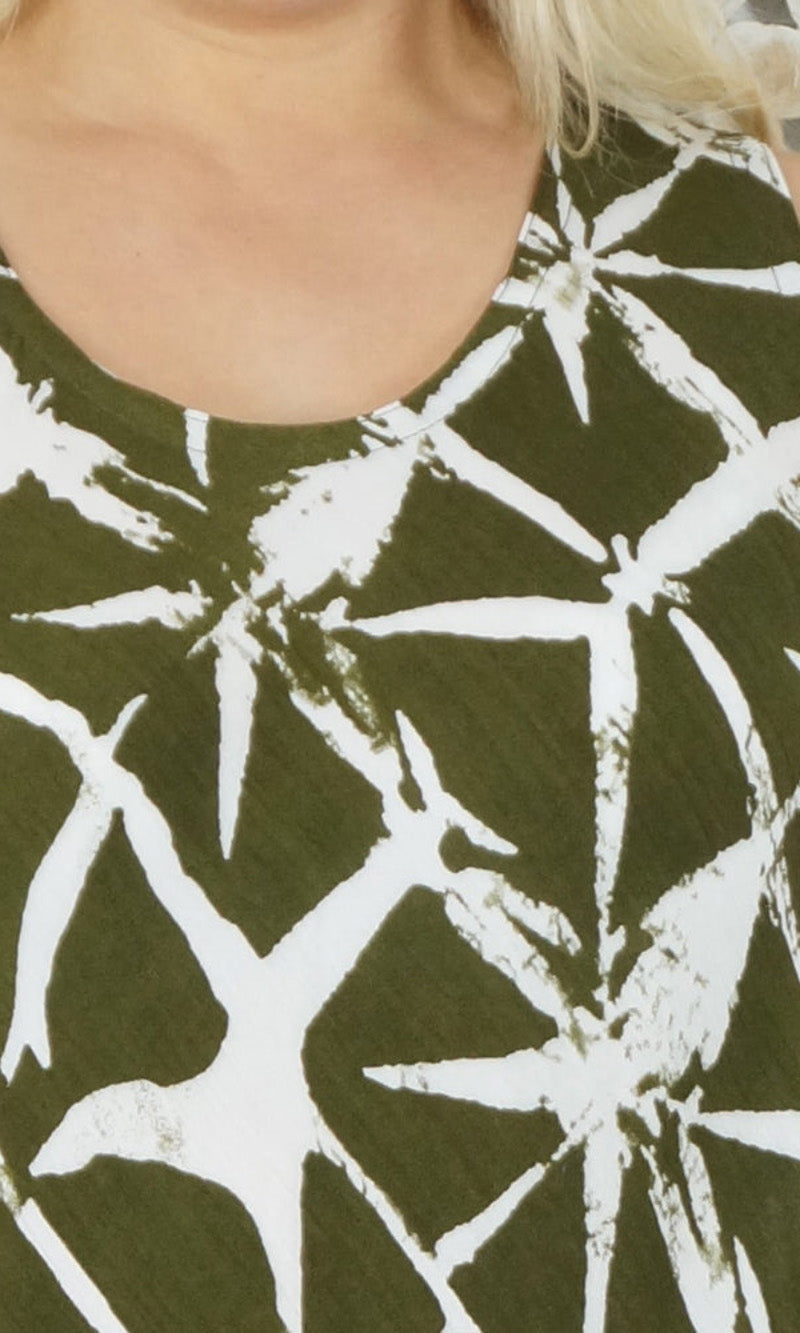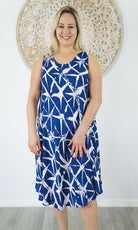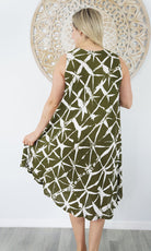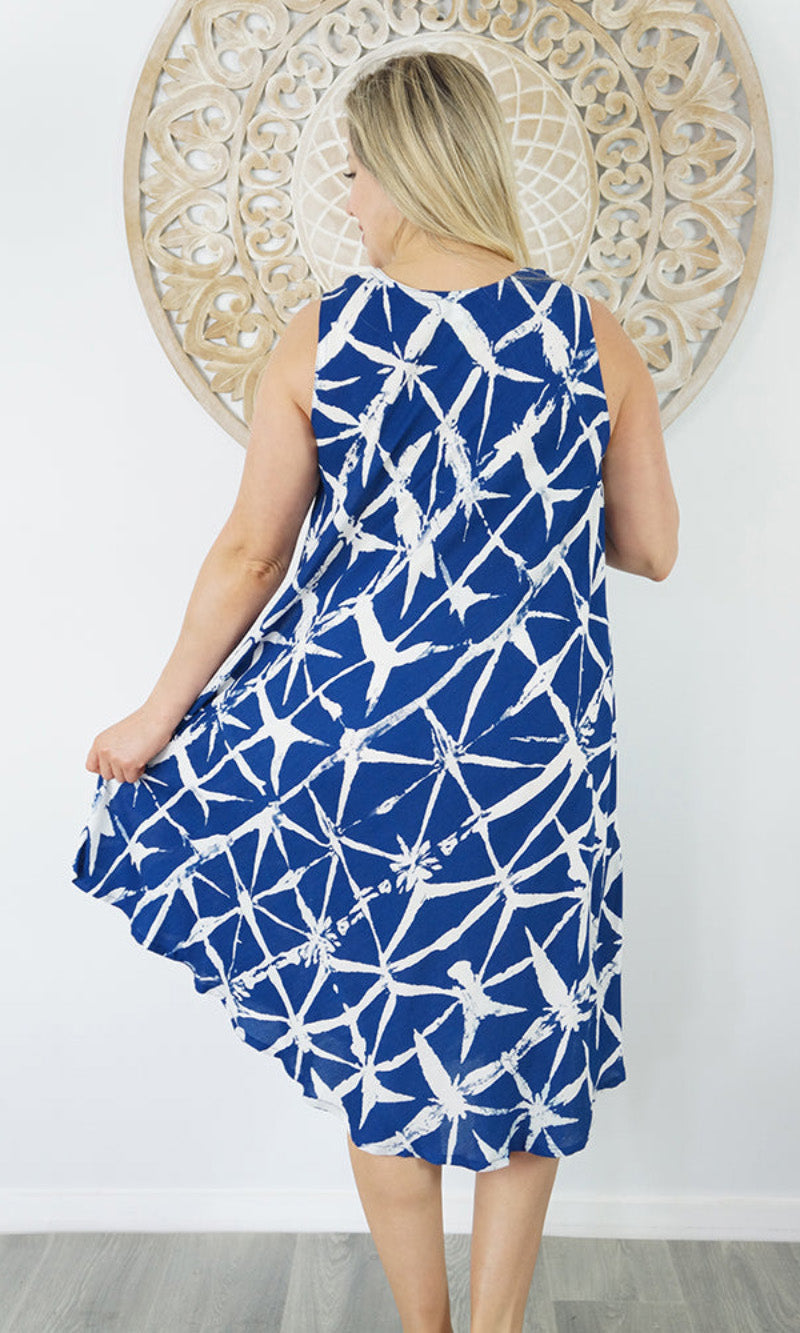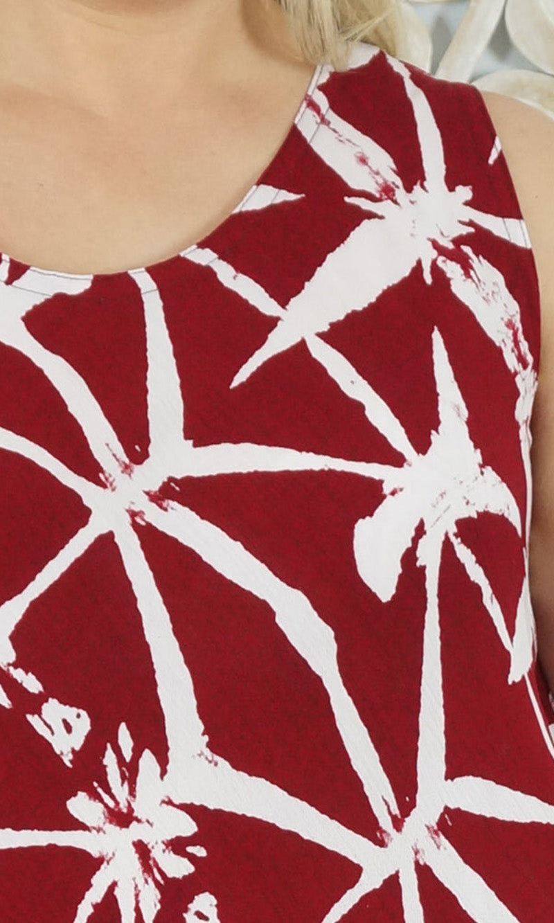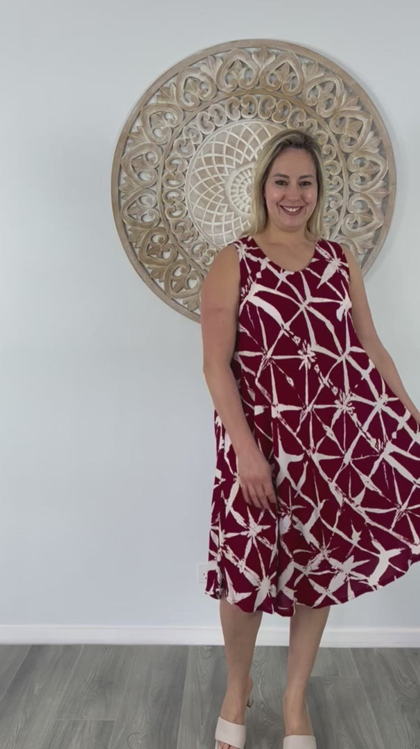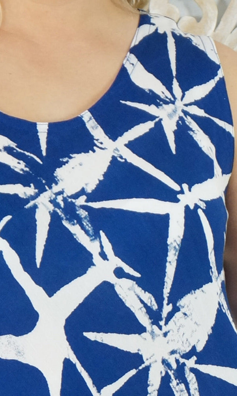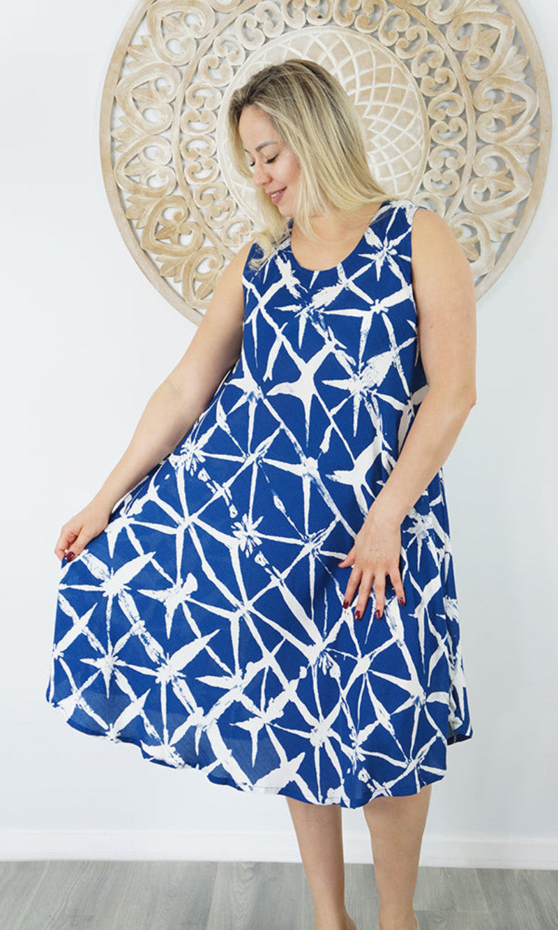 Cool and comfortable sleeveless dress in lovely pre shrunk crinkle rayon. Fabric is cut of the bias to assist the garment to fit many body shapes.
