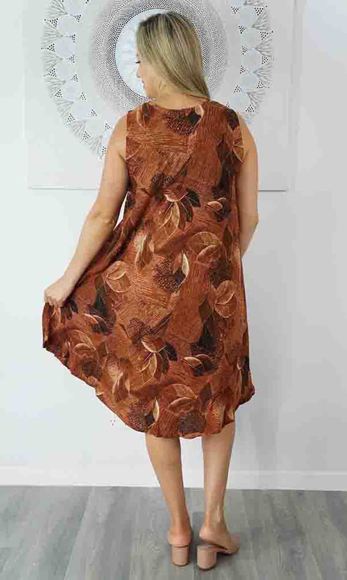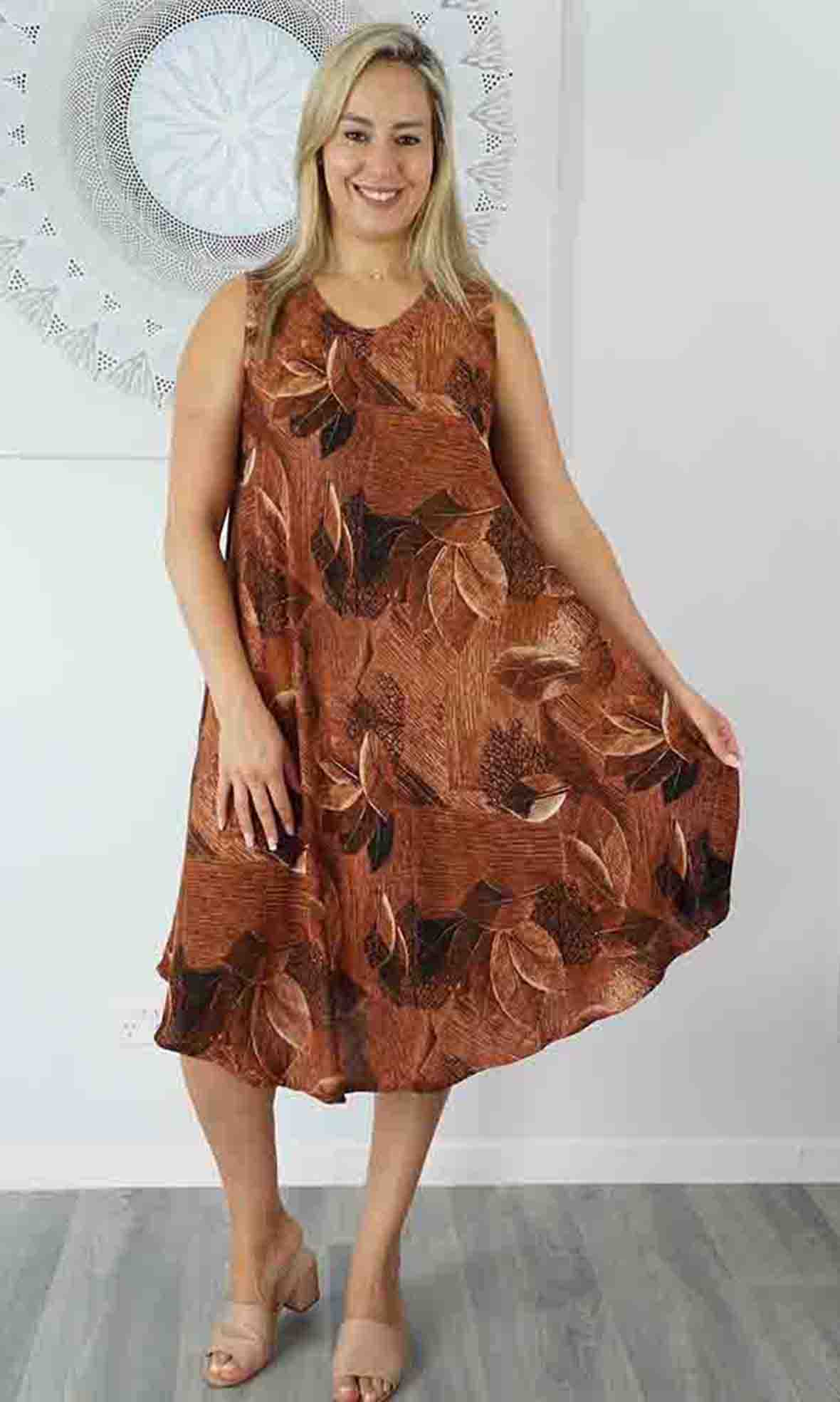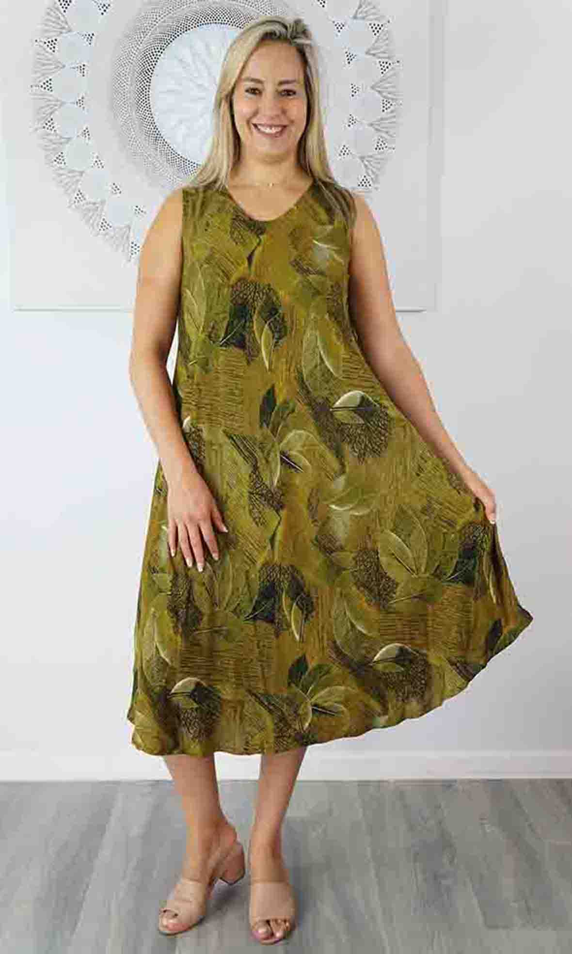 Cool and comfortable sleeveless dress in lovely pre shrunk crinkle rayon. Fabric is cut of the bias to assist the garment to fit many body shapes.